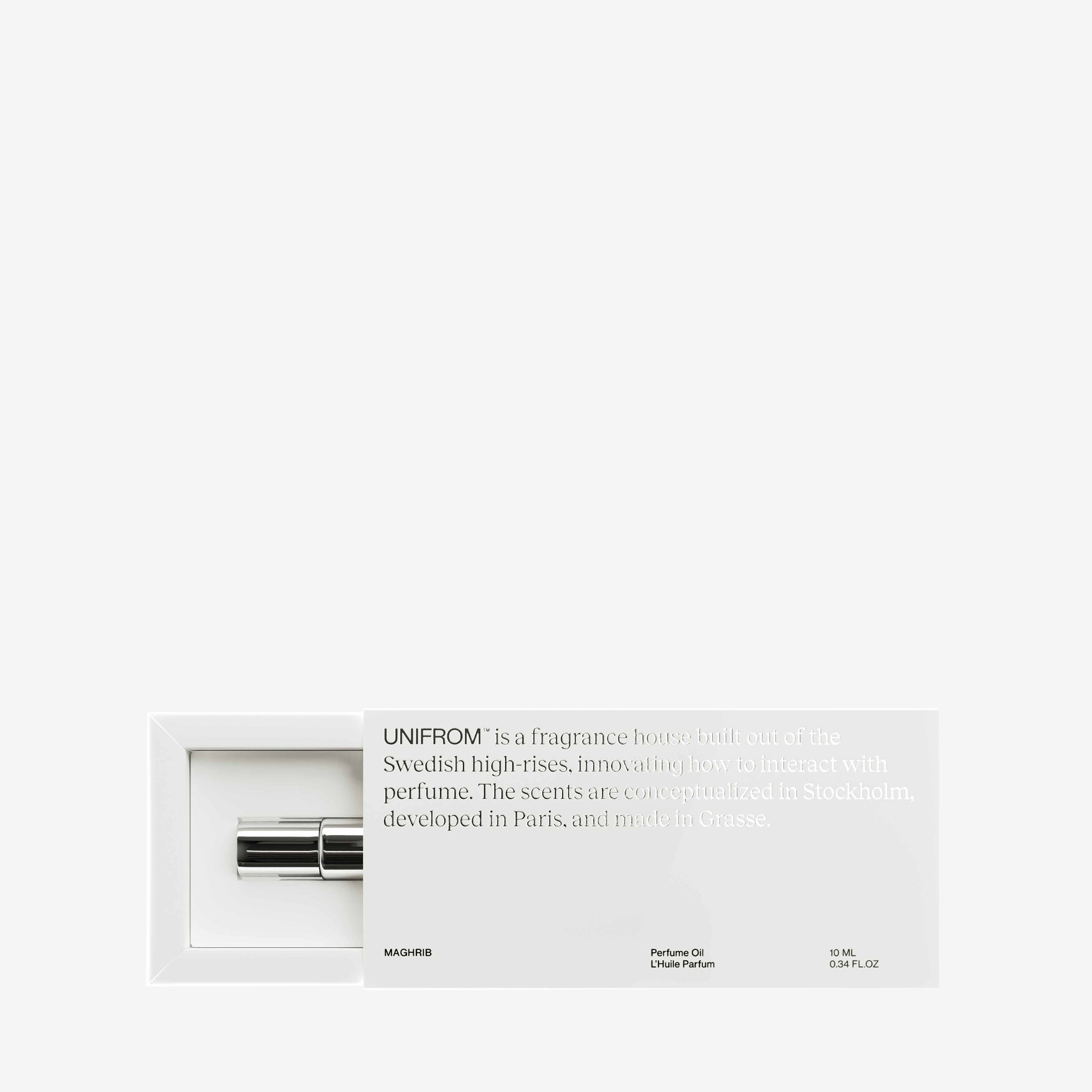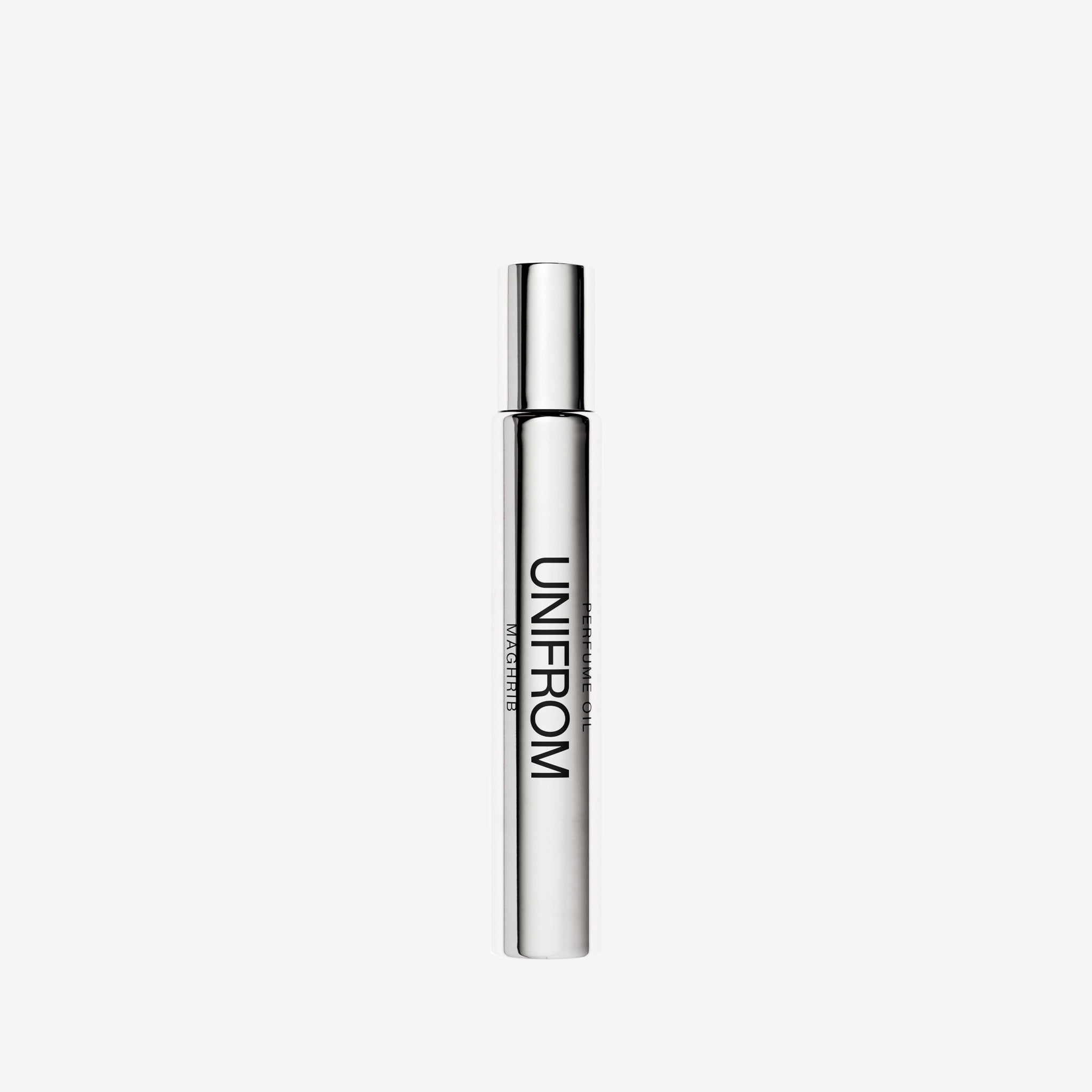 Maghrib Perfume Oil by Unifrom. Roll on fragrance oil with a scent reminiscent of city sunsets on warm summer nights. Top notes of Apple and Pepper. Heart notes of Tobacco. Base notes of Incense, Cedarwood and Musk.