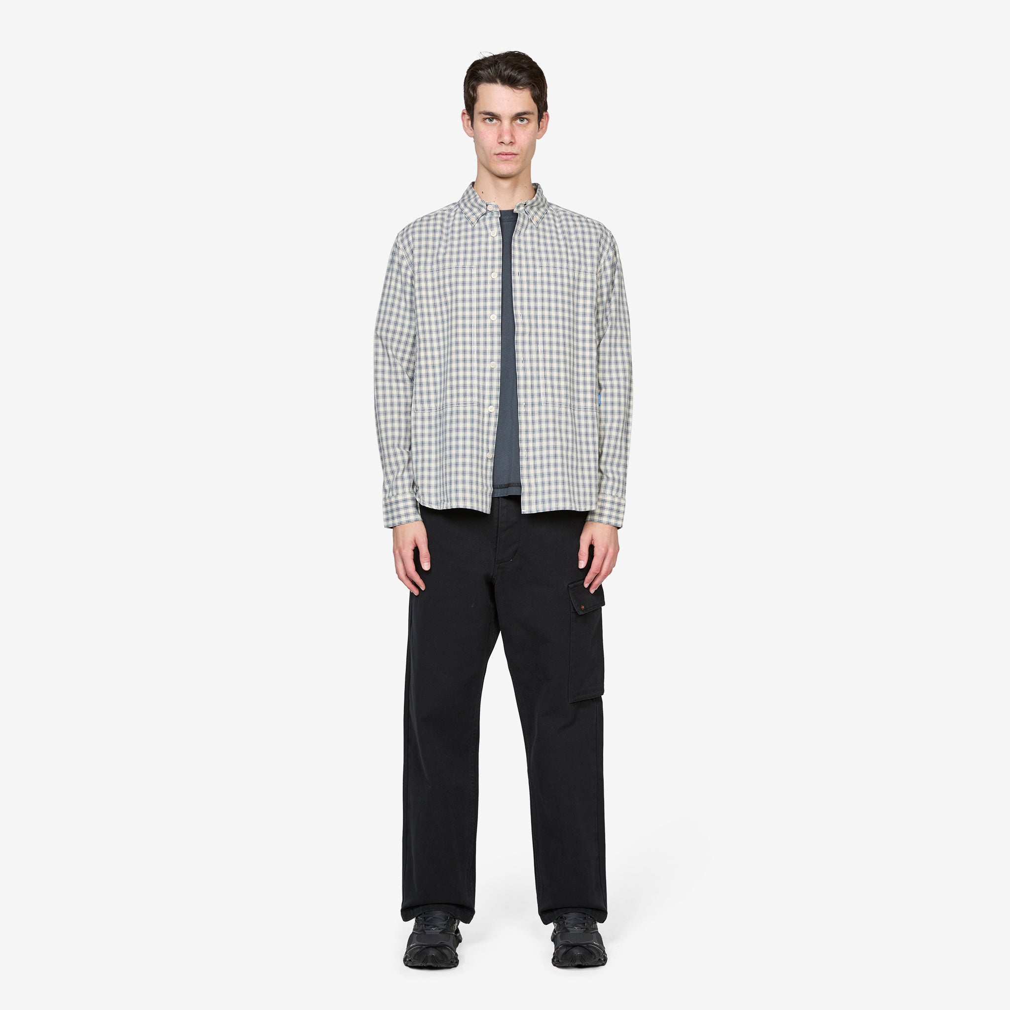 Marsh Pant Used Black from Larriet. Relaxed-fit pant constructed from heavyweight cotton canvas, finished with a specialised dyeing technique to create an aged, worn-in appearance. Features include front side pockets, a cargo pocket on the left leg with copper star rivets, and a single back welt pocket.