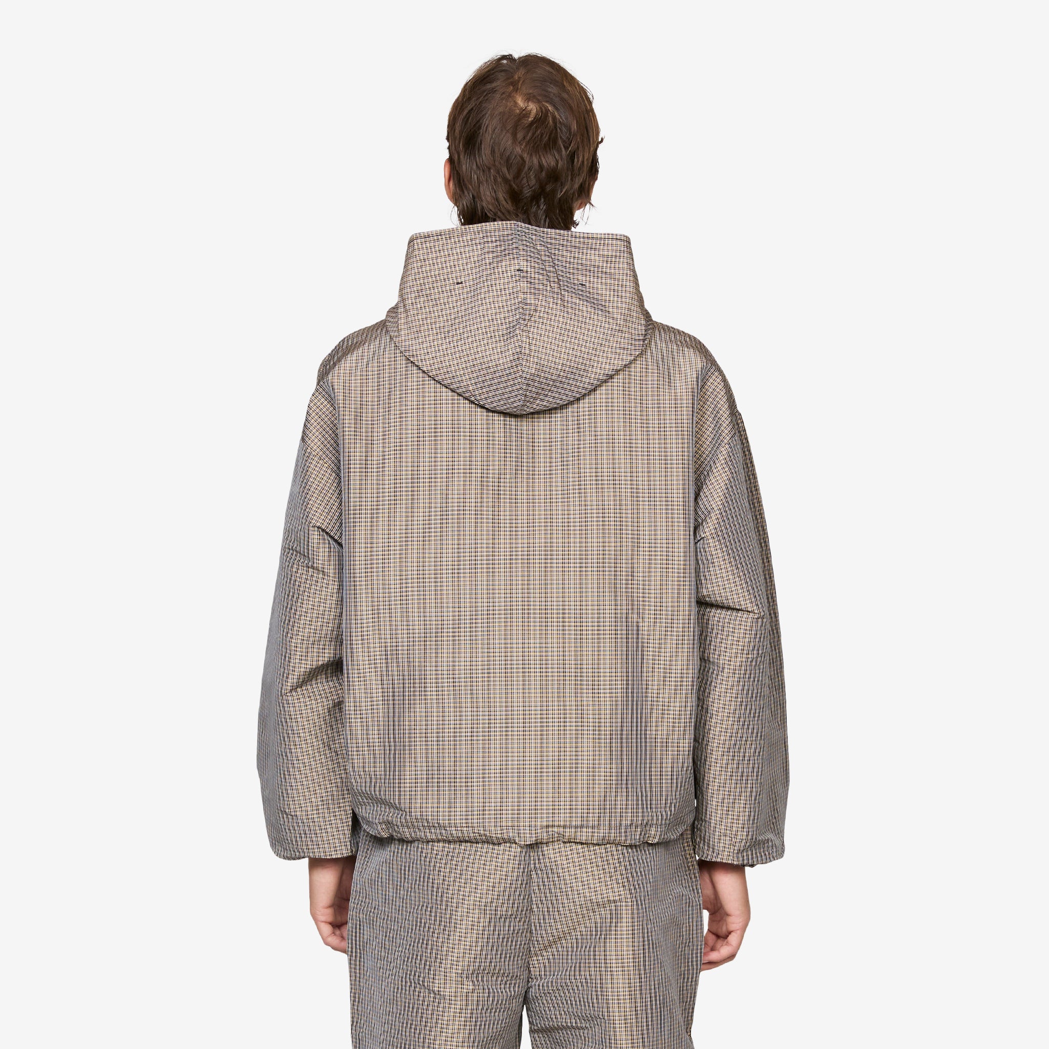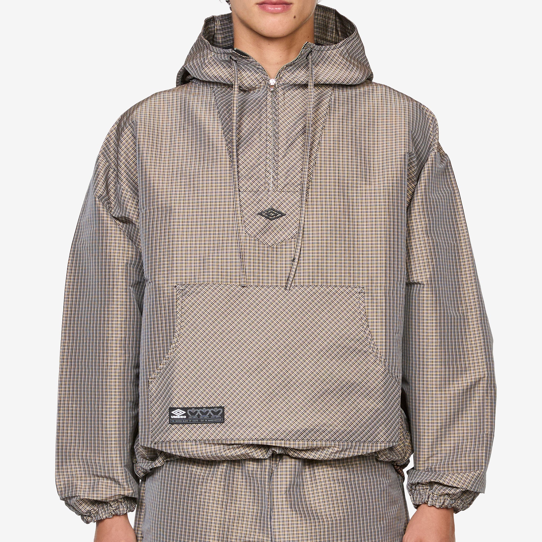 Masked Check Anorak in Beige Black from Umbro. Relaxed boxy fit anorak with drawstring hood and integrated mask. Features kangaroo pocket, half zip closure, elasticated cuffs and drawstring hem. Finished with embroidered logo and woven patch.