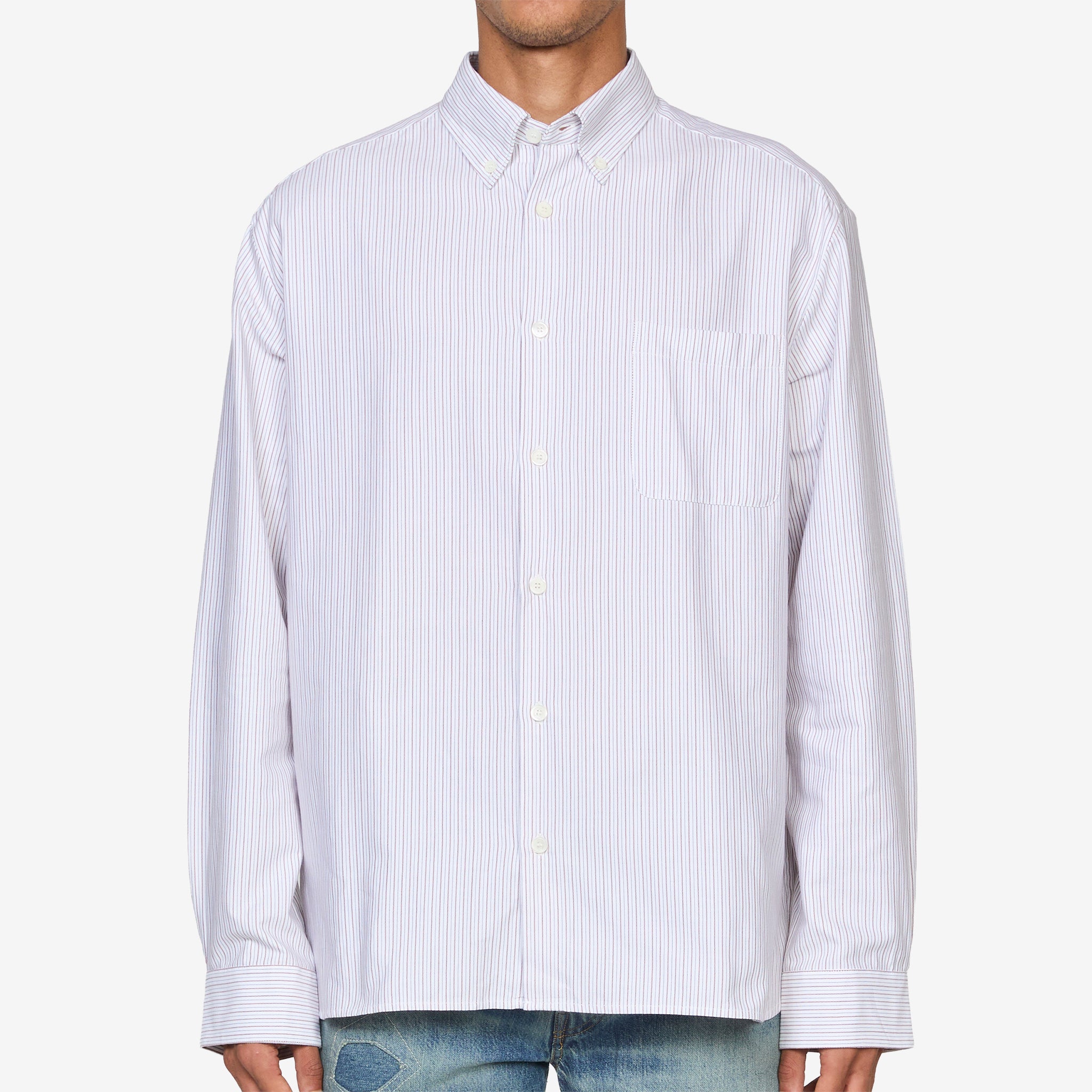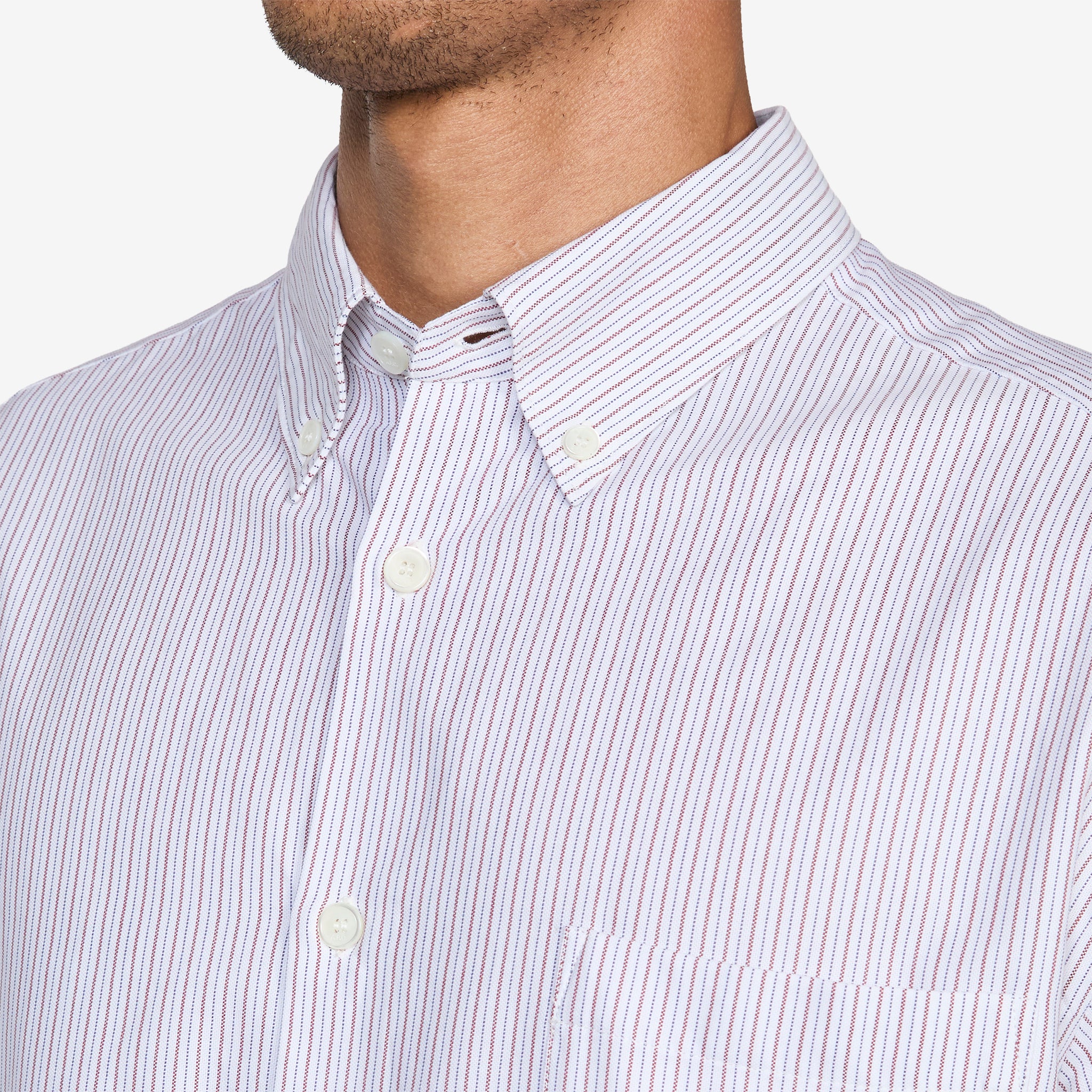Mateo Shirt Bordeaux from A.P.C. Relaxed fit shirt with a classic button-down collar, faux horn button closure and a dropped, curved rear hem. Crafted from soft organic cotton in a subtle maroon stripe.