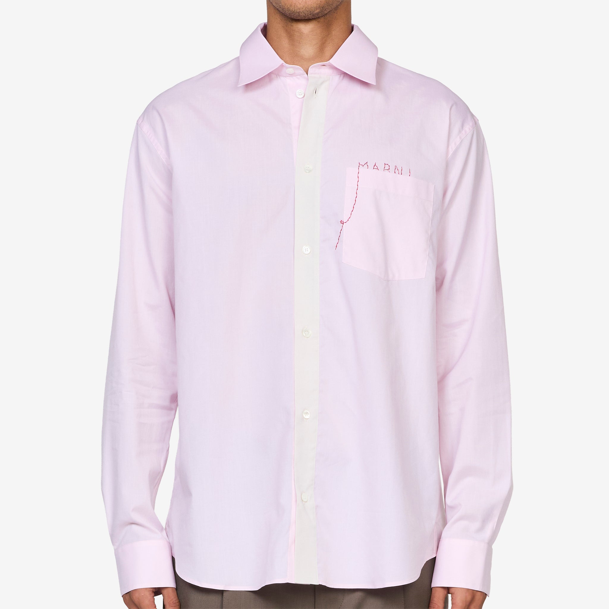 Mending Logo Poplin Shirt in Pink Gummy from Marni. Relaxed fit shirt with a contrast button placket, split collar and curved hem. Crafted from crisp cotton poplin with a single chest pocket. Finished with embroidered branding at the pocket.