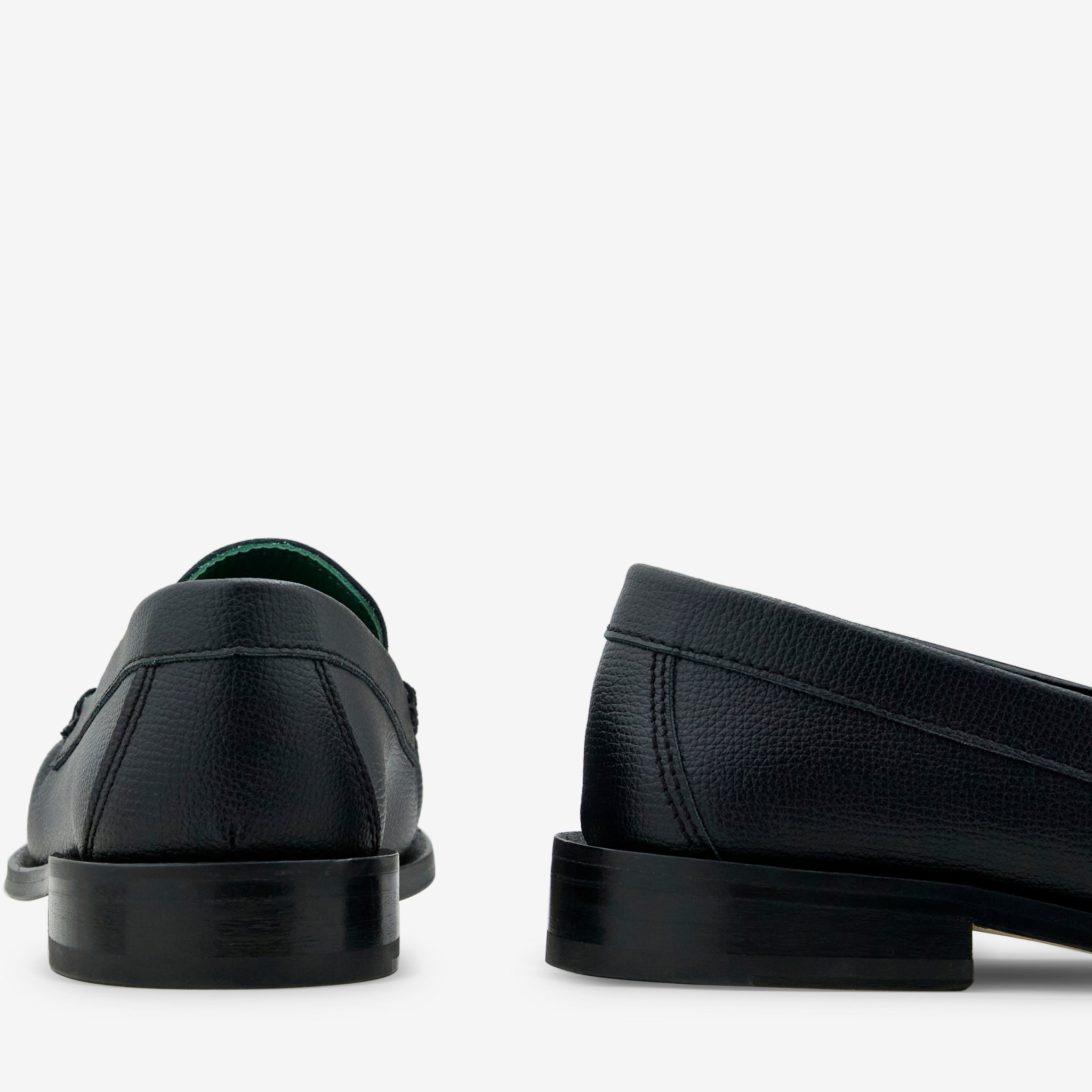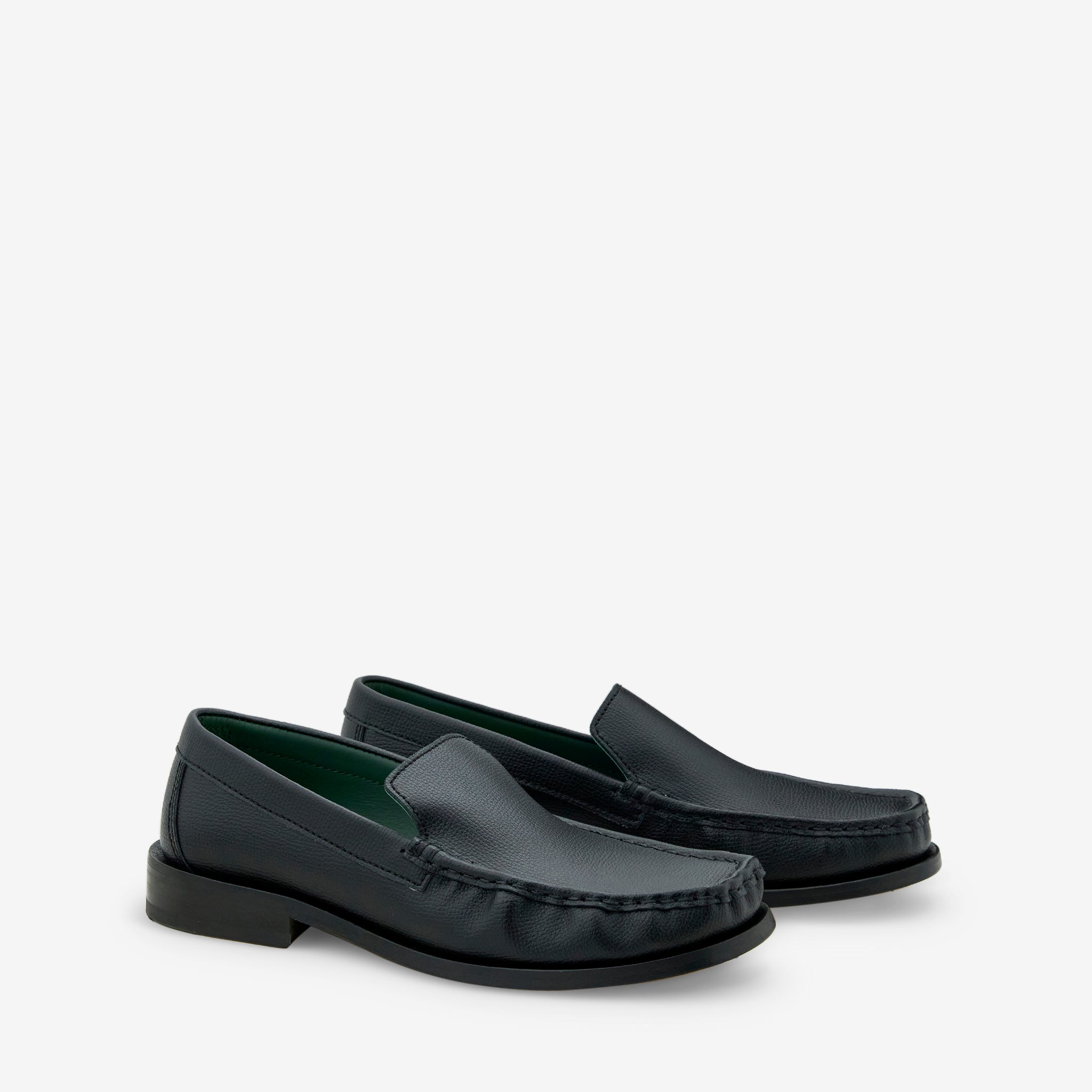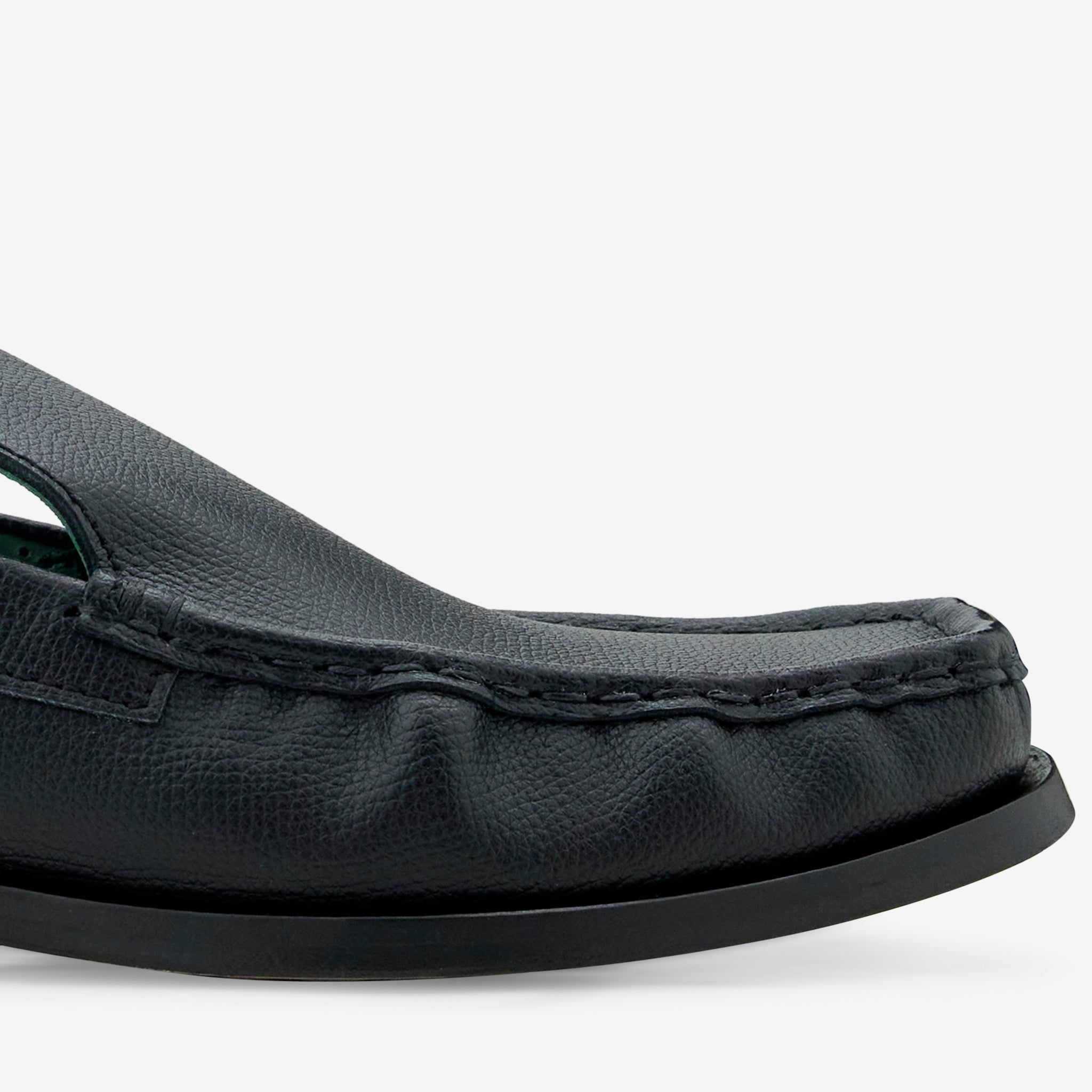 Men's Michel Mocassin in Black Grain Leather from VINNY's. Vinny's take on a classic mocassin. Square toe silhouette hand-crafted in Portugal with a black grain leather upper and subtle wrinkle detailing.