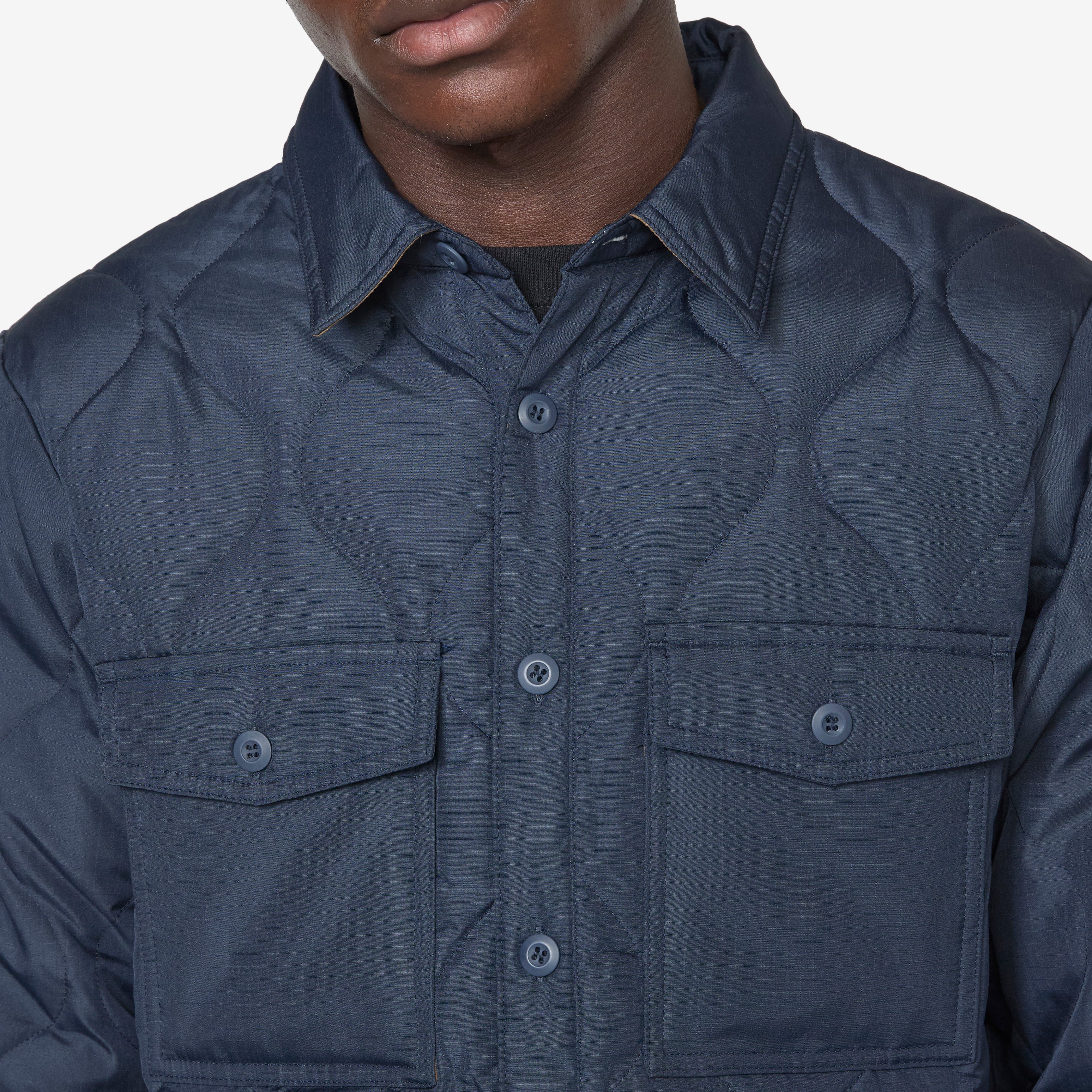 Men's Military Down Shirt in Dark Navy from Taion. Regular fit shirt jacket with full button closure and zippers on the sides for freedom of movement and styling options. Features flap pockets on the chest and is packable into an included storage bag.