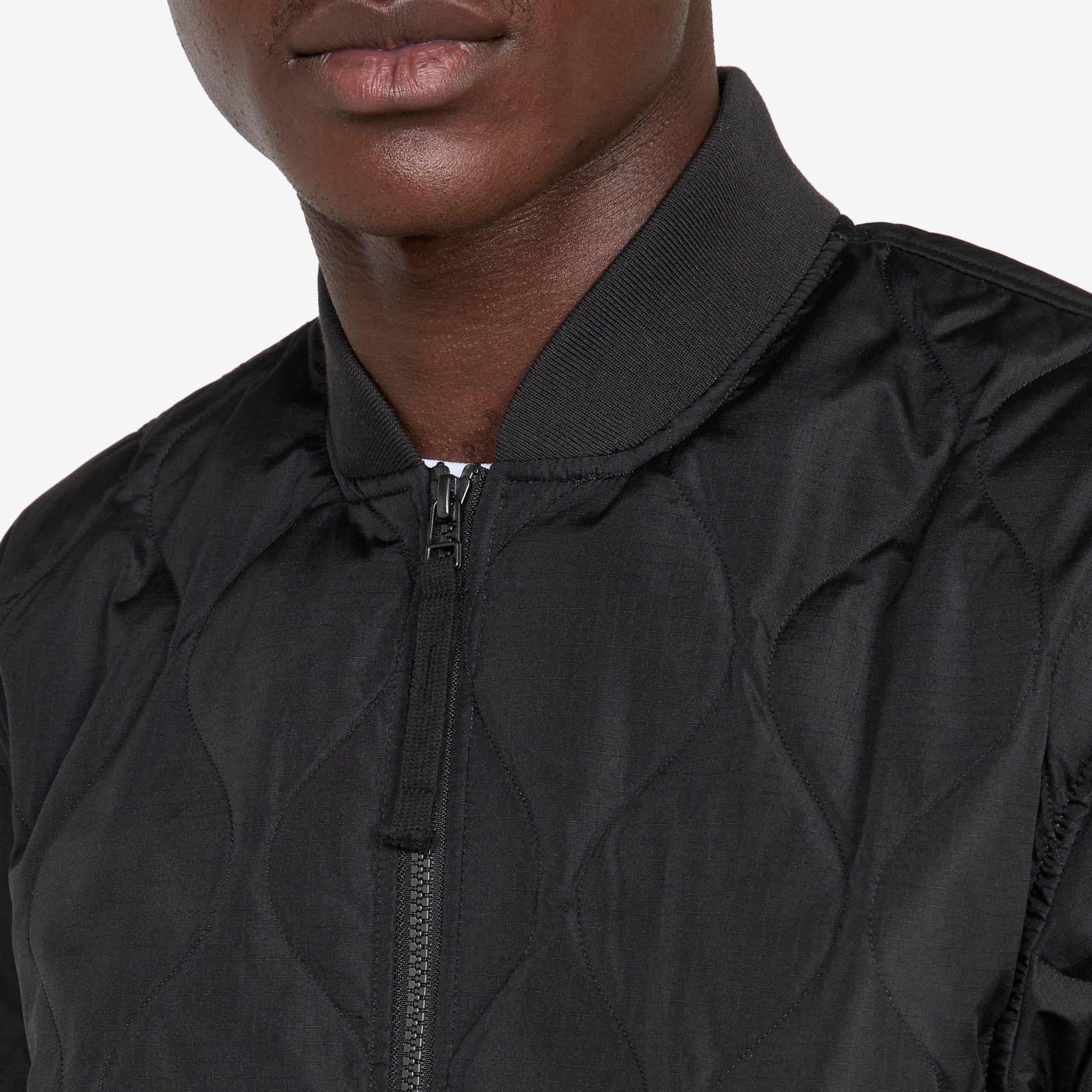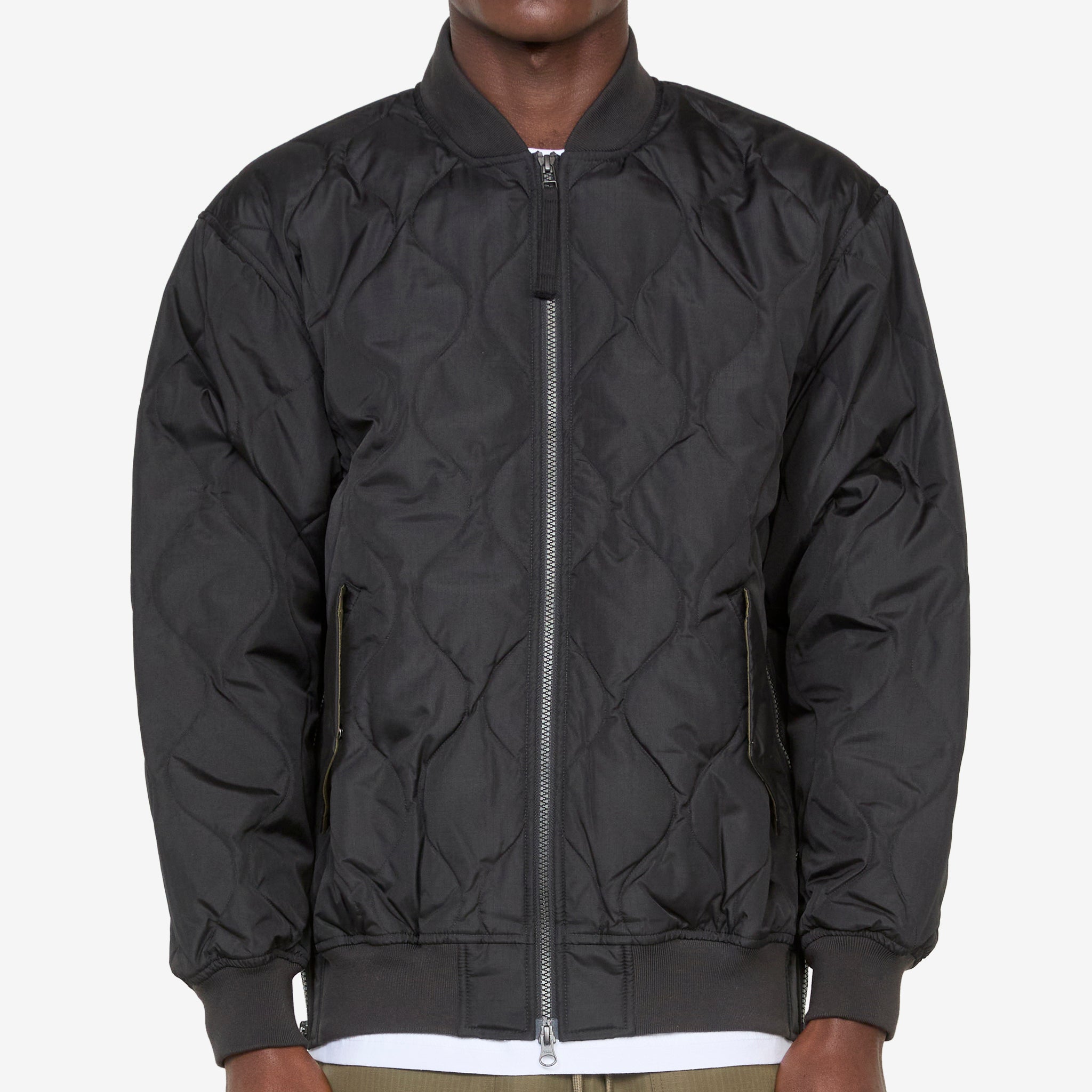 Military MA-1 Type Down Jacket in Black from Taion. Relaxed fit MA-1 style jacket with 2-way full-zip closure, snap-closure front pockets and ribbed trims. Crafted from durable, stain-resistant 5mm nylon ripstop in a quilted 800 fill down construction. Finished with zip-closure at the side seams for ease of movement.