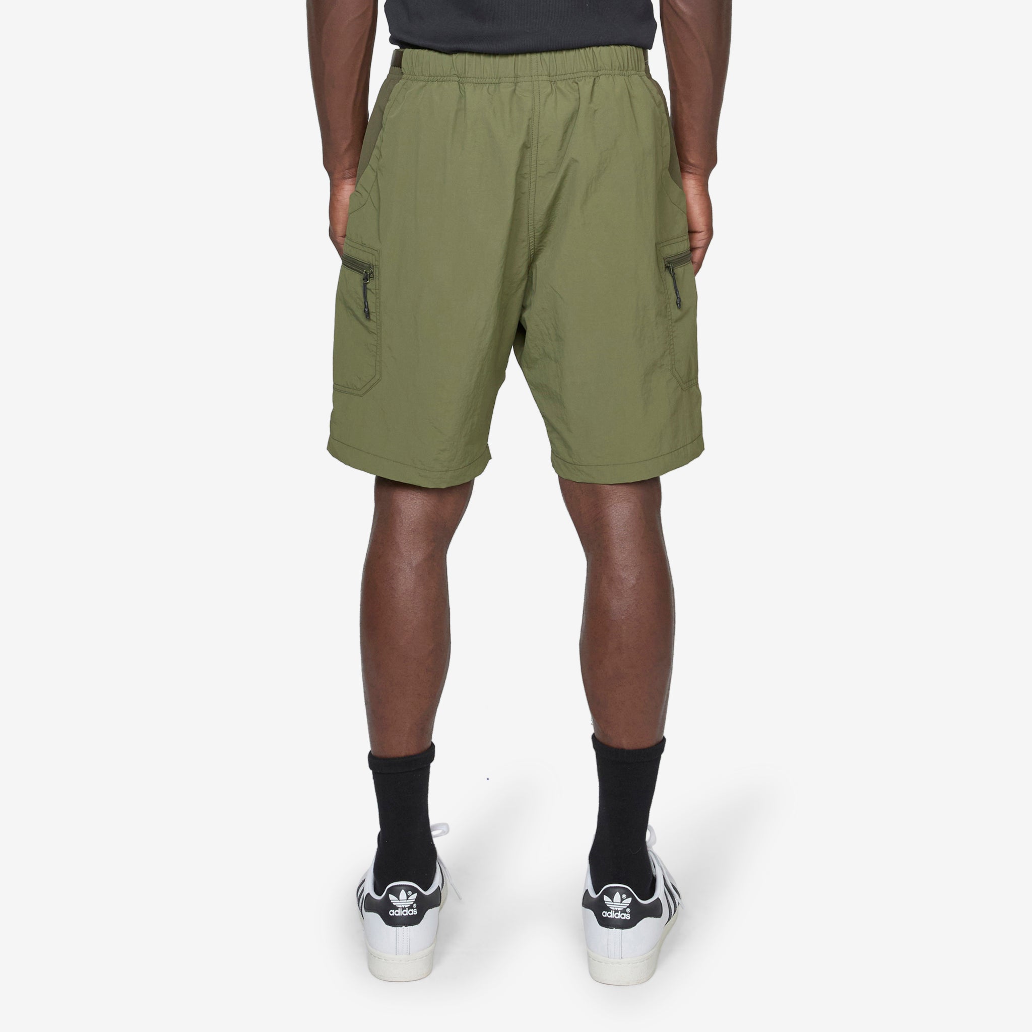 Nylon Utility Short in Olive and Dark Olive from Gramicci. Relaxed fit shorts with an elasticated waistband, an integrated belt and gusseted crotch for 180-degree range of leg motion. Crafted from durable nylon for a dry touch, water repellency and resistance to chlorine.