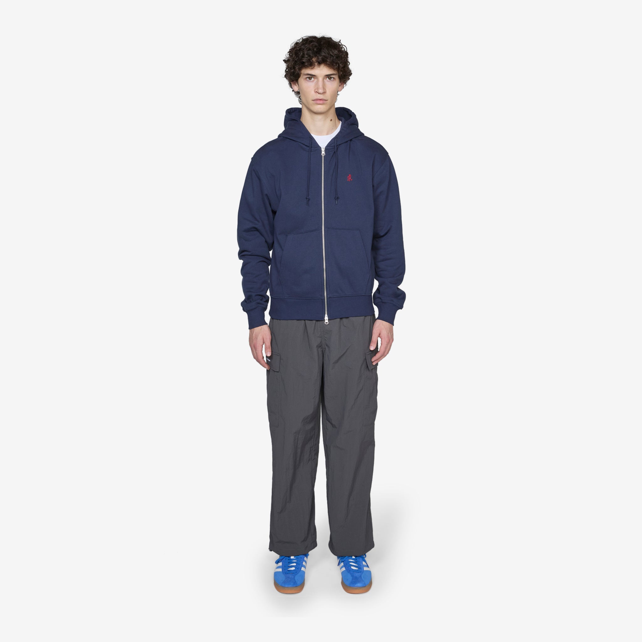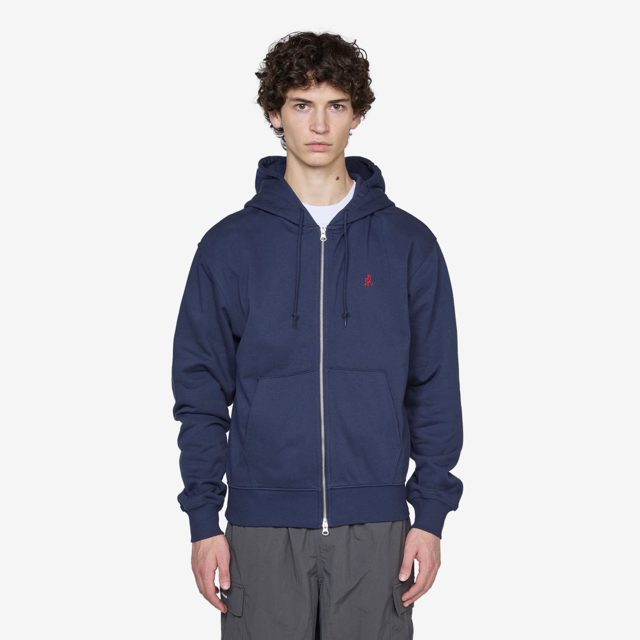 One Point Zip Hooded Sweatshirt in Navy from Gramicci. Relaxed fit sweatshirt with an adjustable drawstring hood, two-way zip closure, a kangaroo pocket and ribbed trims. Crafted from a fleeceback jersey cotton and finished with embroidered branding at the chest.