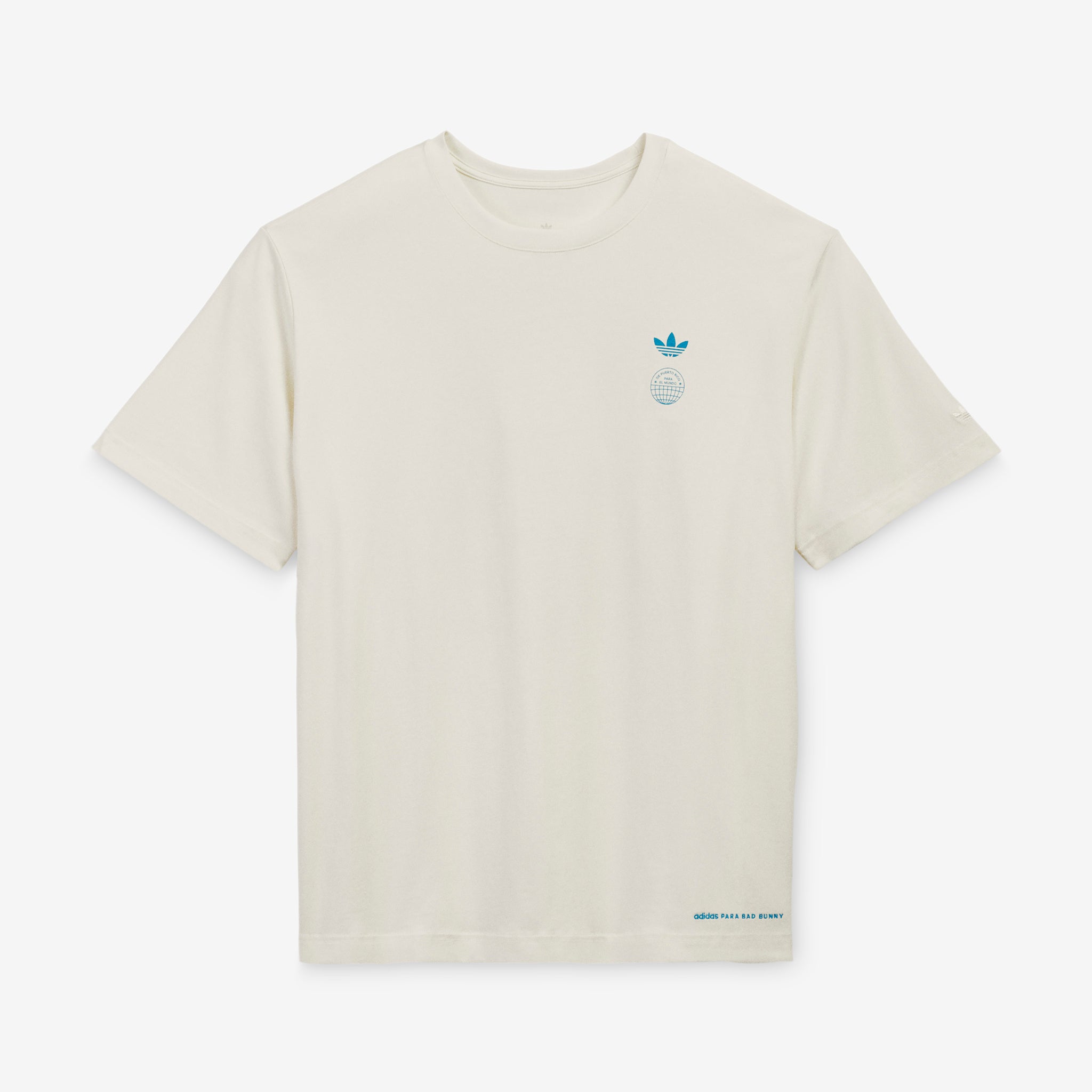 Para Bad Bunny Sidney T-Shirt in Cream White from adidas Originals. Boxy, oversized fit t-shirt with a ribbed crew neckline and woven collaborative label at the back neck. Crafted from heavyweight single jersey. Finished with collaborative printed branding at the chest, hem and back.
