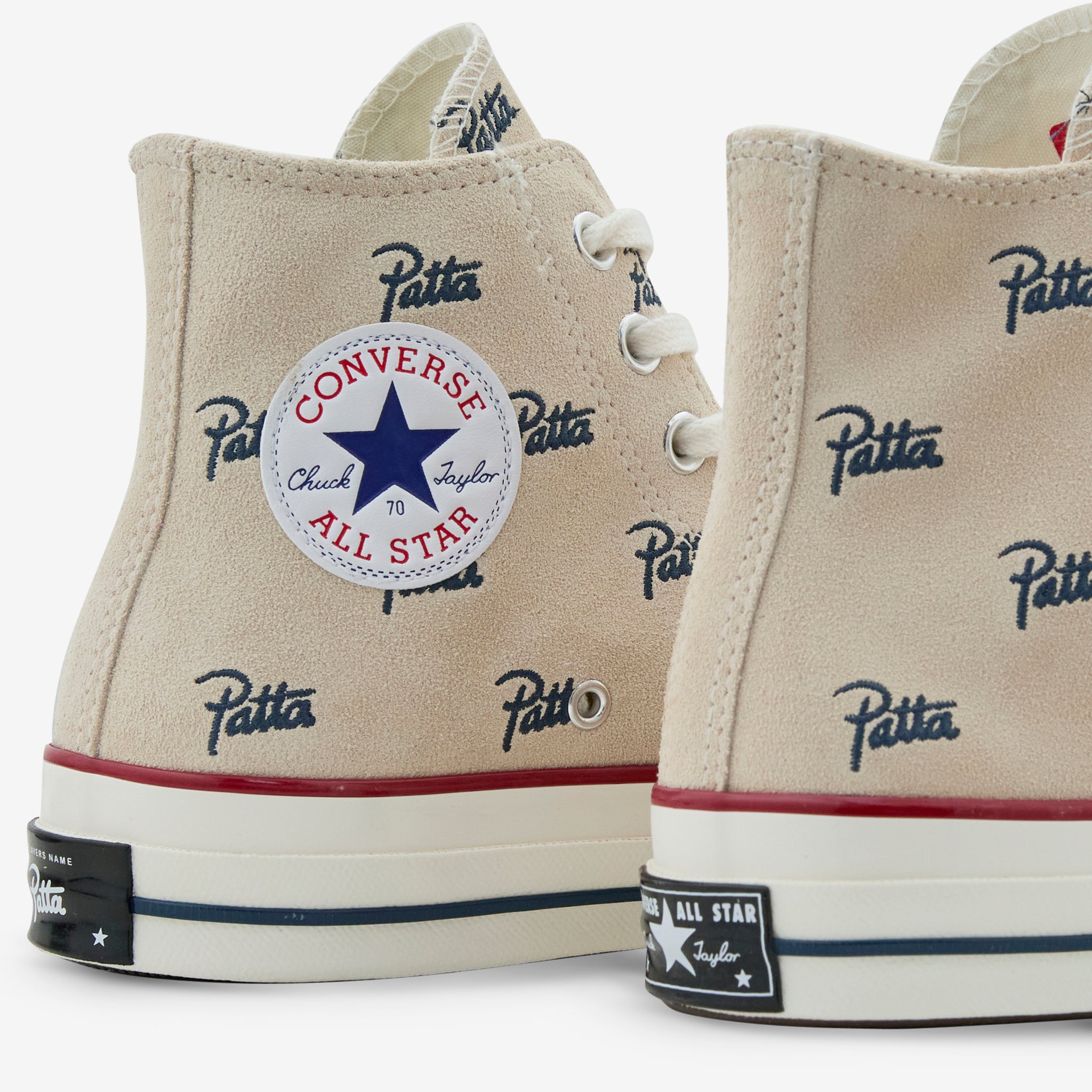 Patta collaborates with Converse on the Chuck '70 Hi in Natural Ivory and Insignia Blue. Classic silhouette featuring a canvas upper and rubber Converse brand patches on the inner ankle. Finished with an allover Patta print on the upper and Patta 20th anniversary '20 Down' text moulded into the rubber outsole.