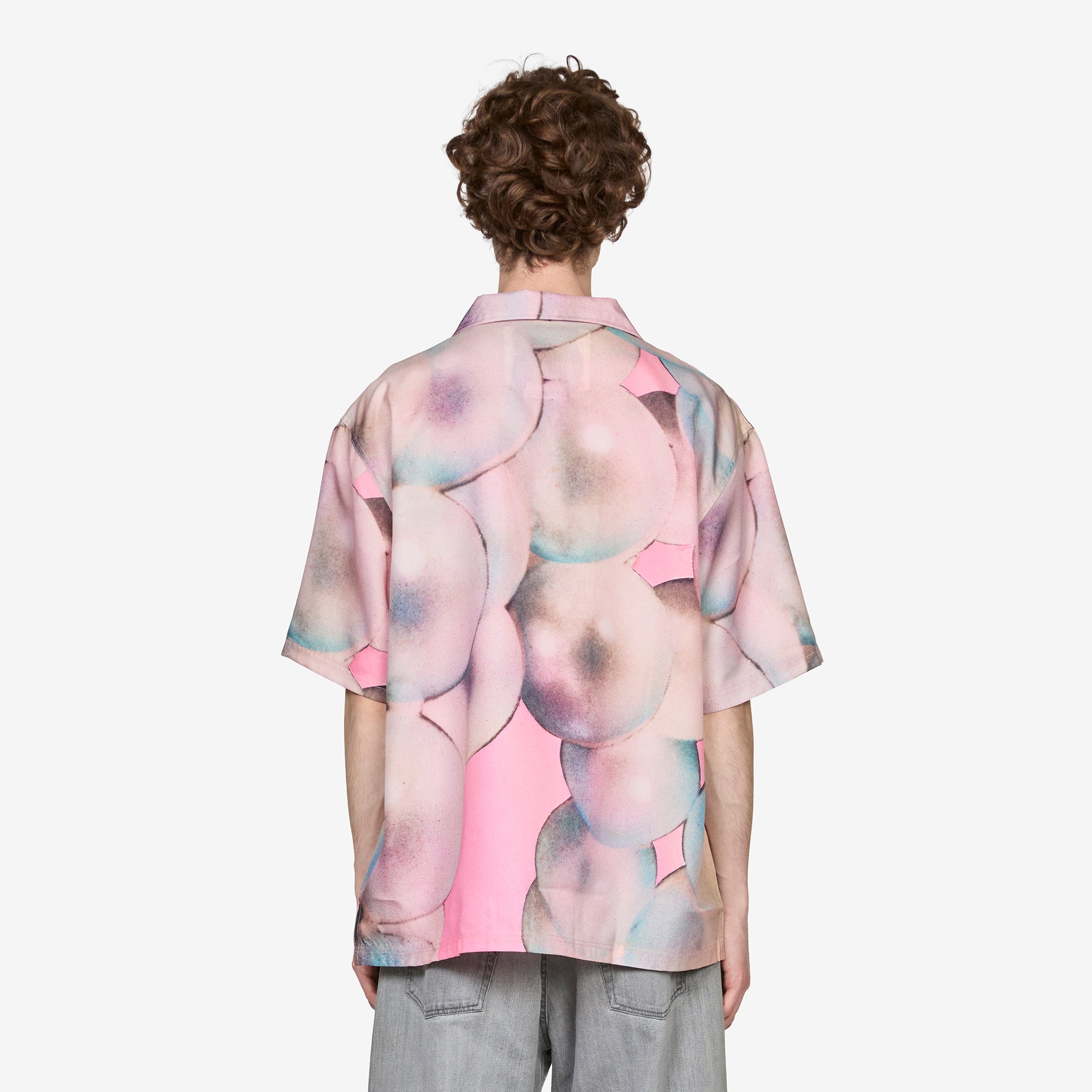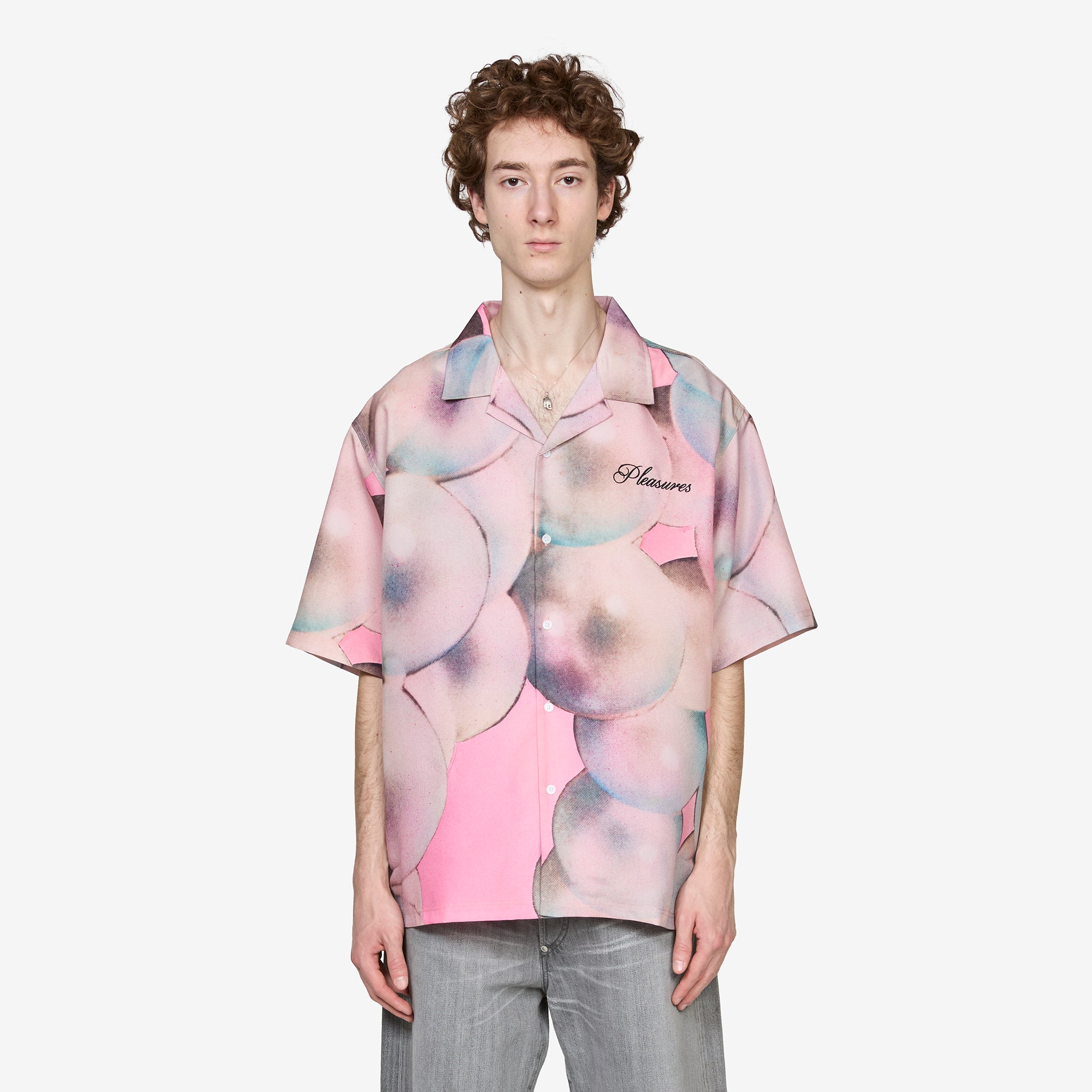 Pearl Button Up in Pink from PLEASURES. Relaxed fit shirt with a camp collar and front button closure. Crafted from polyester plain weave in an all-over AOP Sublimated print graphic. Finished with embroidered branding at the chest.