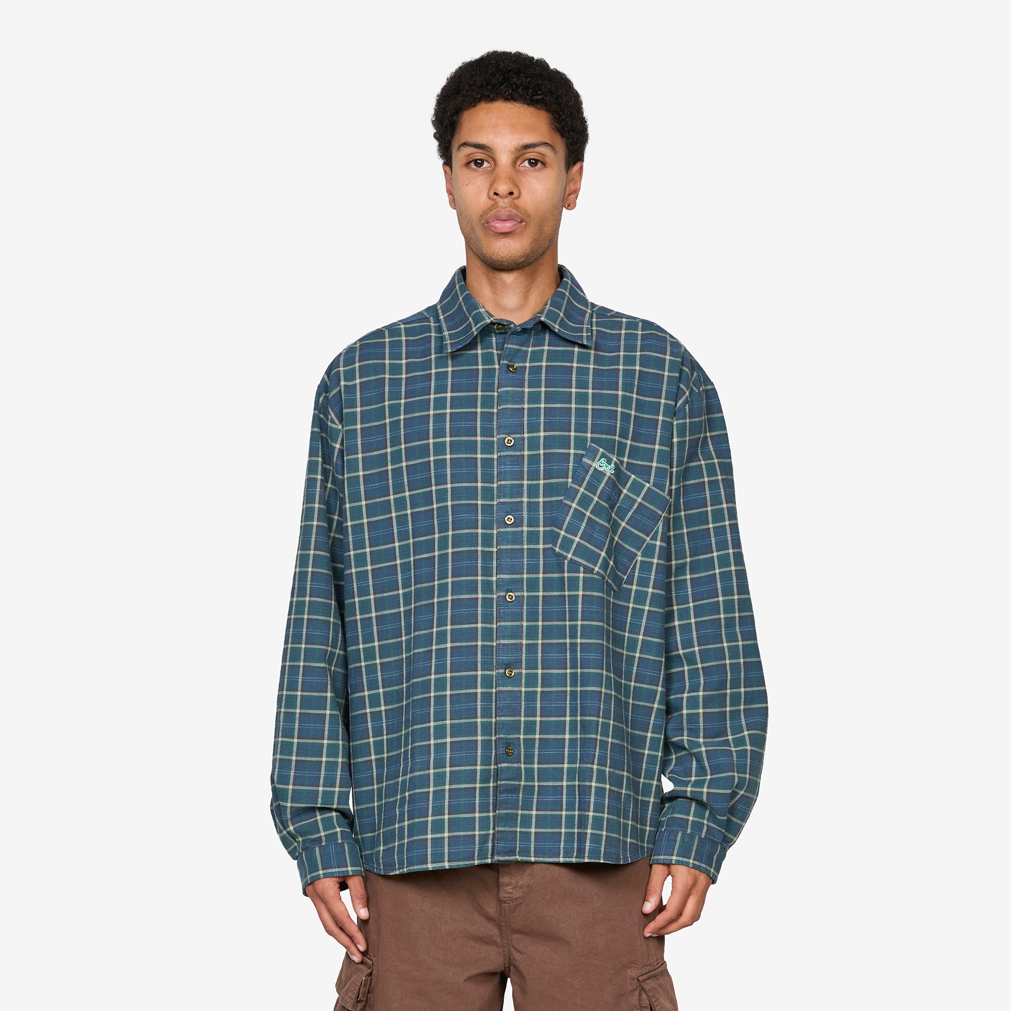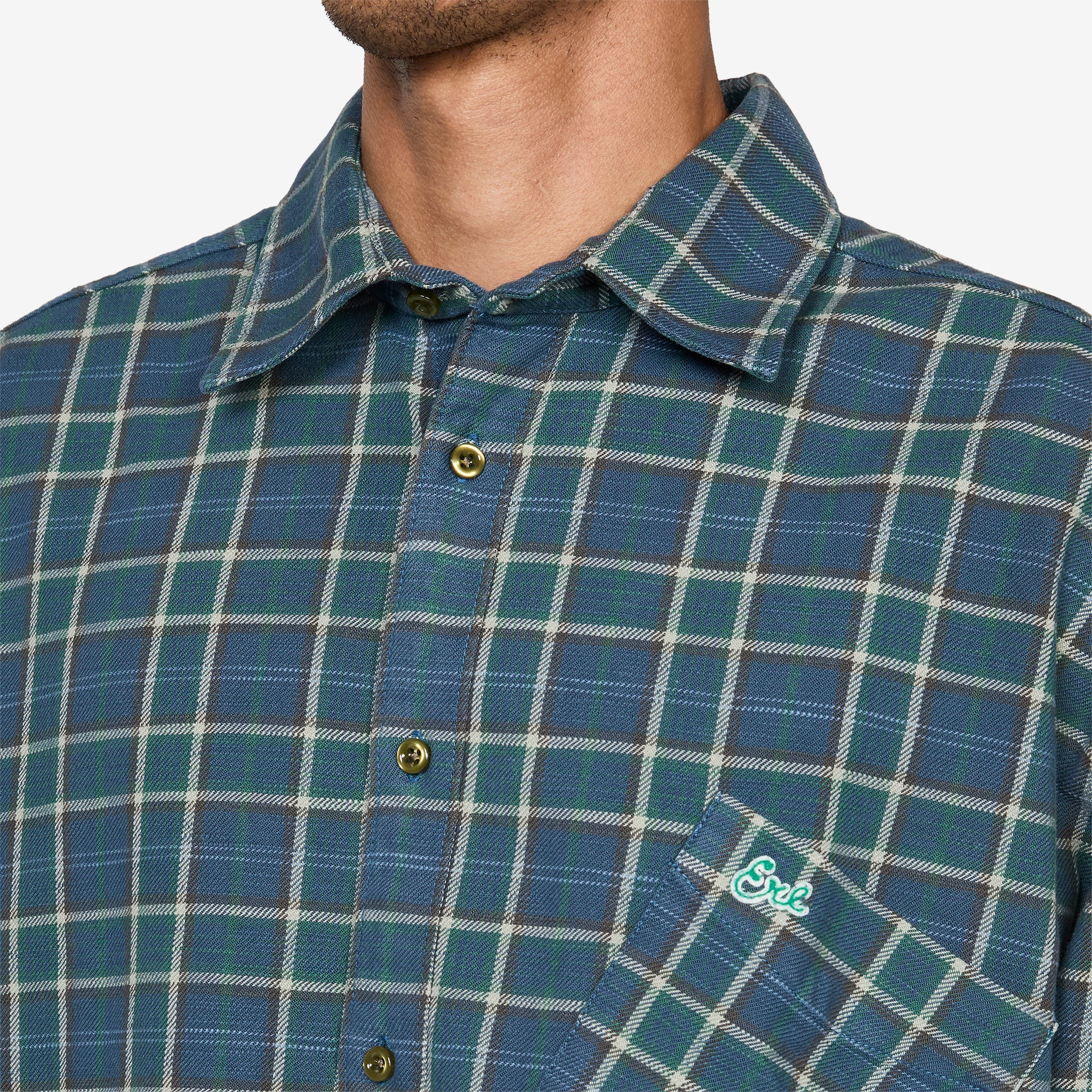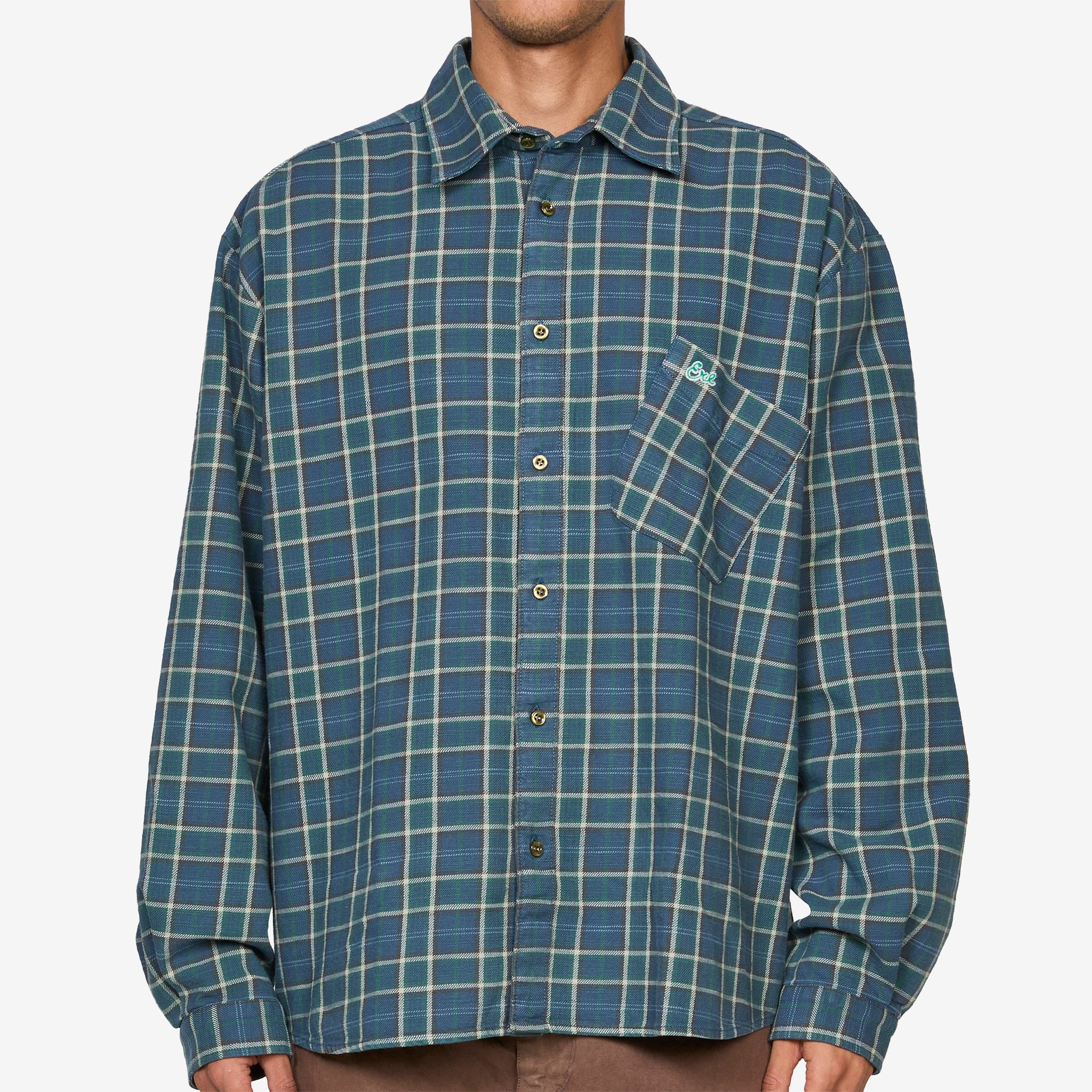 Plaid Overshirt in Green from ERL. Green Plaid Overshirt Woven from ERL. Heavyweight cotton plaid shirt with a classic button-up design, spread collar and shirttail hem. Features ERL script embroidery at the tilted chest pocket, a logo patch at the front hem and dropped shoulders for a relaxed overshirt fit. Finished with buttoned barrel cuffs and a box pleat at the back yoke.