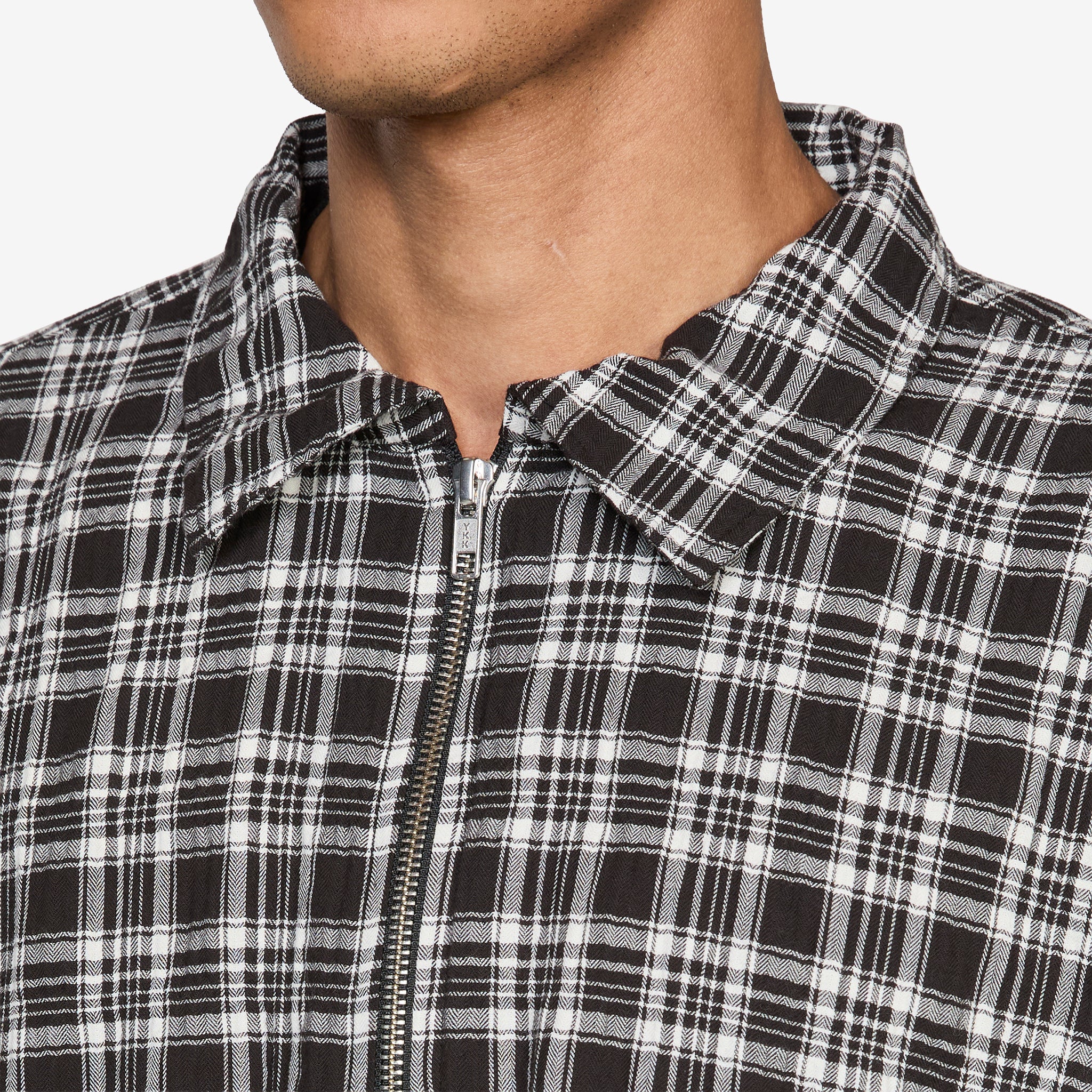 Quarter Zip Shirt Coffee Textured Plaid from mfpen. Boxy quarter-zip shirt with drop shoulders, straight hem and pleated back yoke. Crafted from a garment-washed seersucker cotton blend featuring a white plaid pattern over a deep brown base. Finished with a spread collar, YKK quarter-zip, and ivory resin buttons.