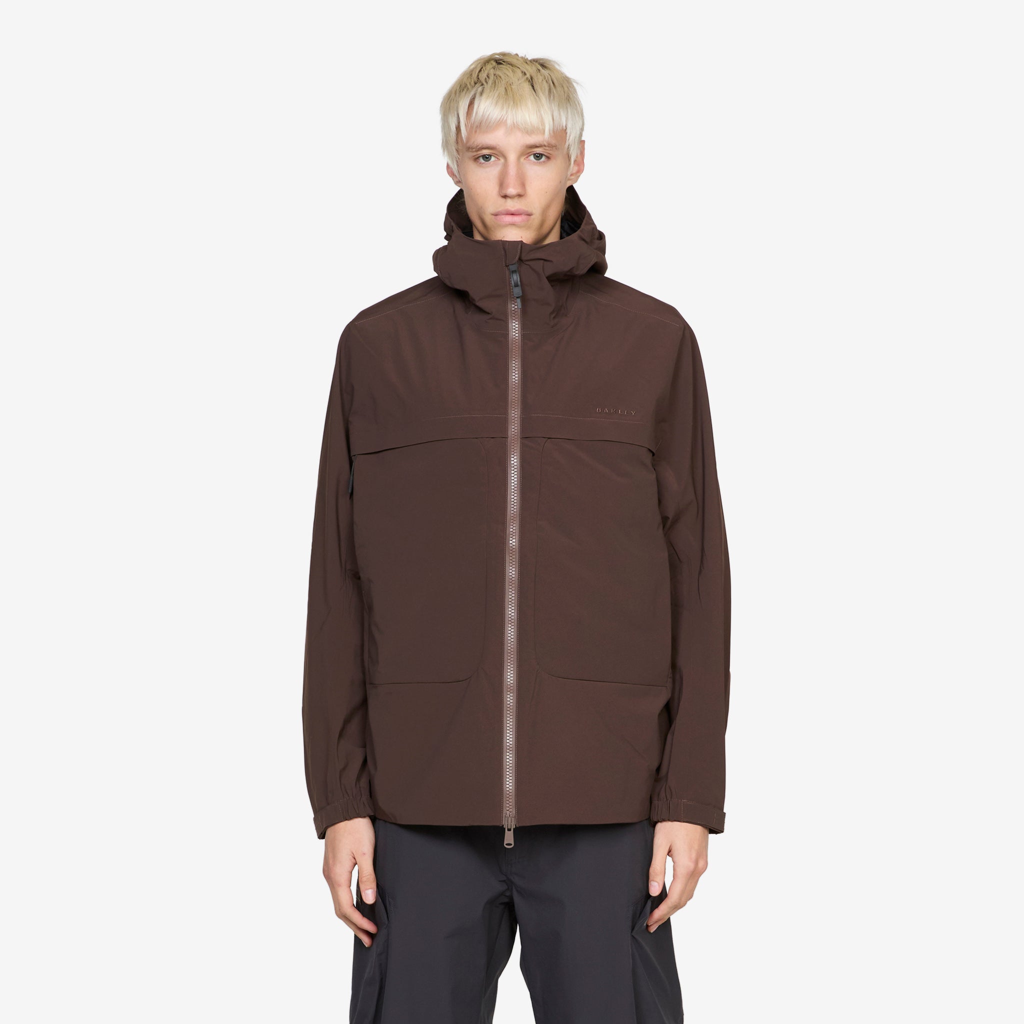 Reserve Utility Jacket in Cocoa Brown from Oakley. Boxy fit shell jacket featuring a fixed 3-panel hood with a bonded peak, 2-wayzip closure, zip-closure side pockets and an adjustable drawcord hem. Crafted from FN Dry™ 10K treated nylon for breathable warmth and weather protection and constructed with underarm gussets, ergonomic elbow pleats and kimono sleeve construction for ease of movement. Finished with hidden pockets and tonal embroidered branding at the chest.