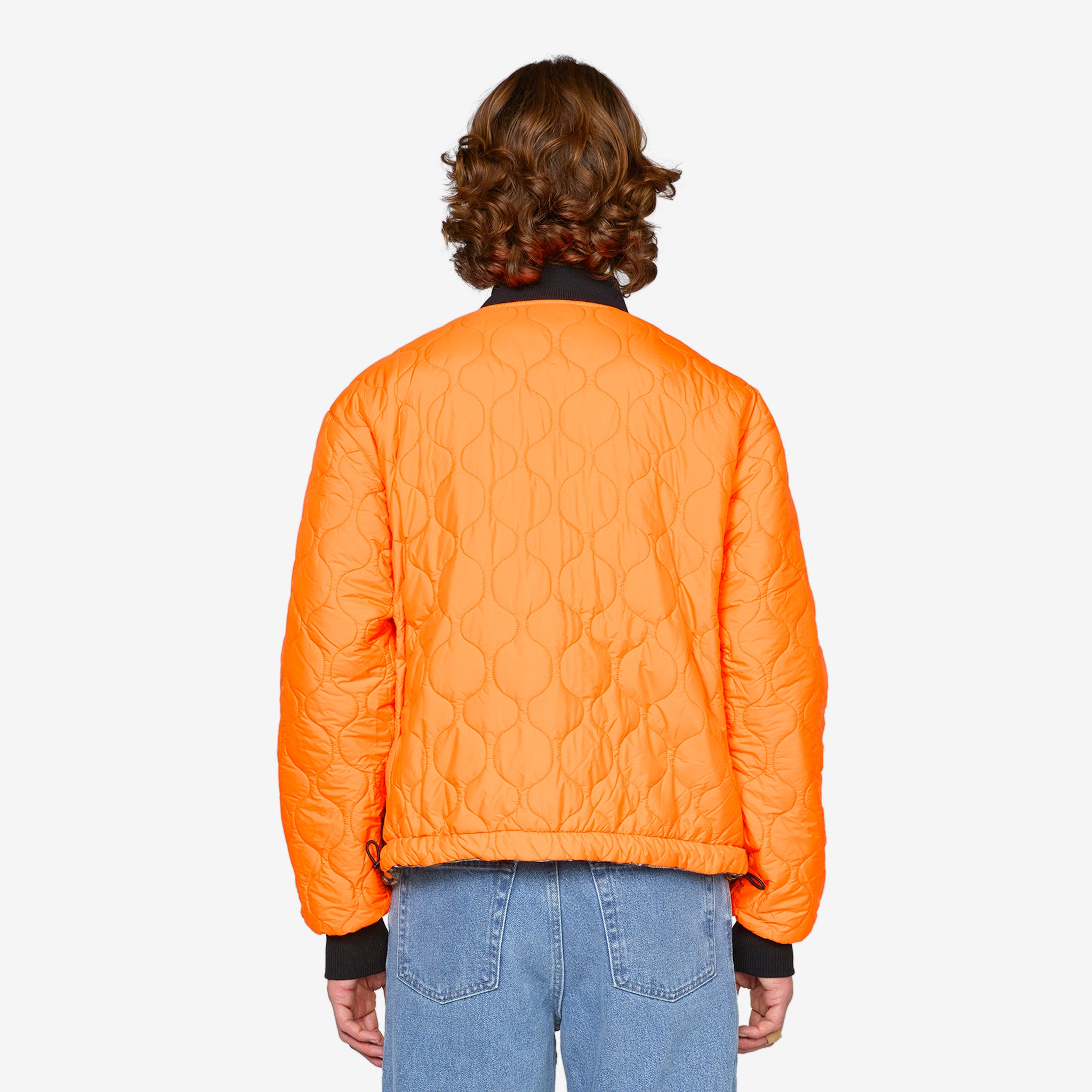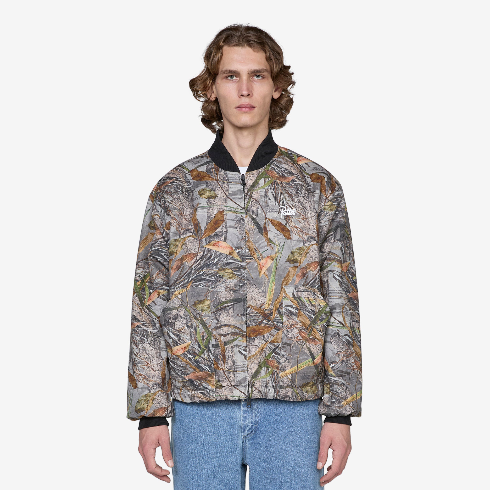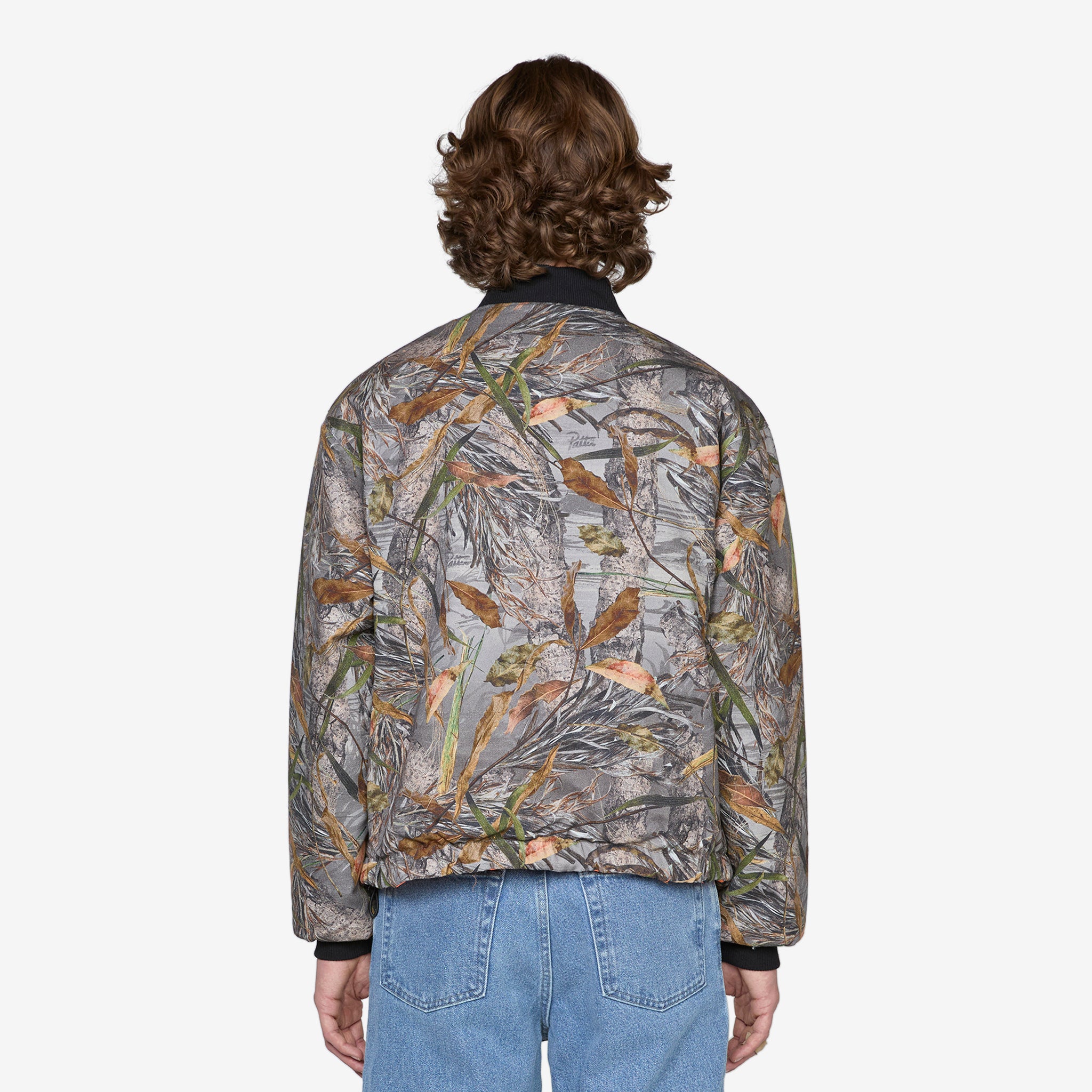 Reversible Canvas Bomber Jacket in Nature Print from Patta. Boxy fit jacket with full-zip closure, interior and exterior side pockets, a toggle-adjustable hem and ribbed trims. Crafted from a nature print cotton canvas with a quilted insulating Primaloft fabric on the reverse. Finished with printed branding at the chest on both sides.