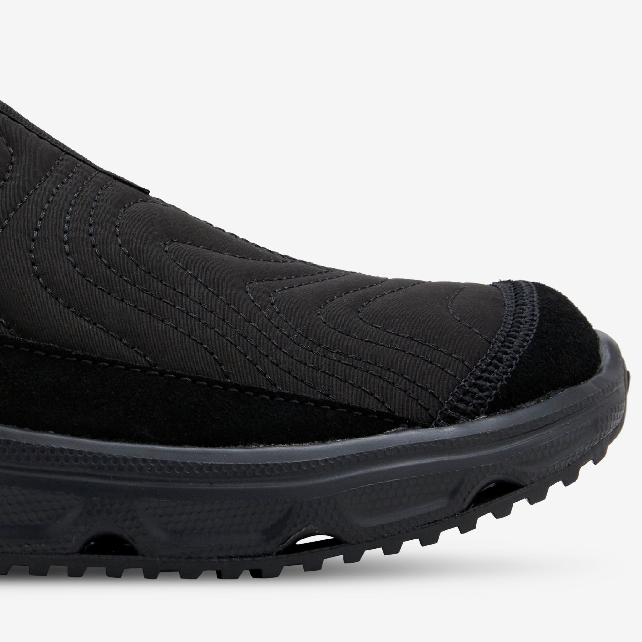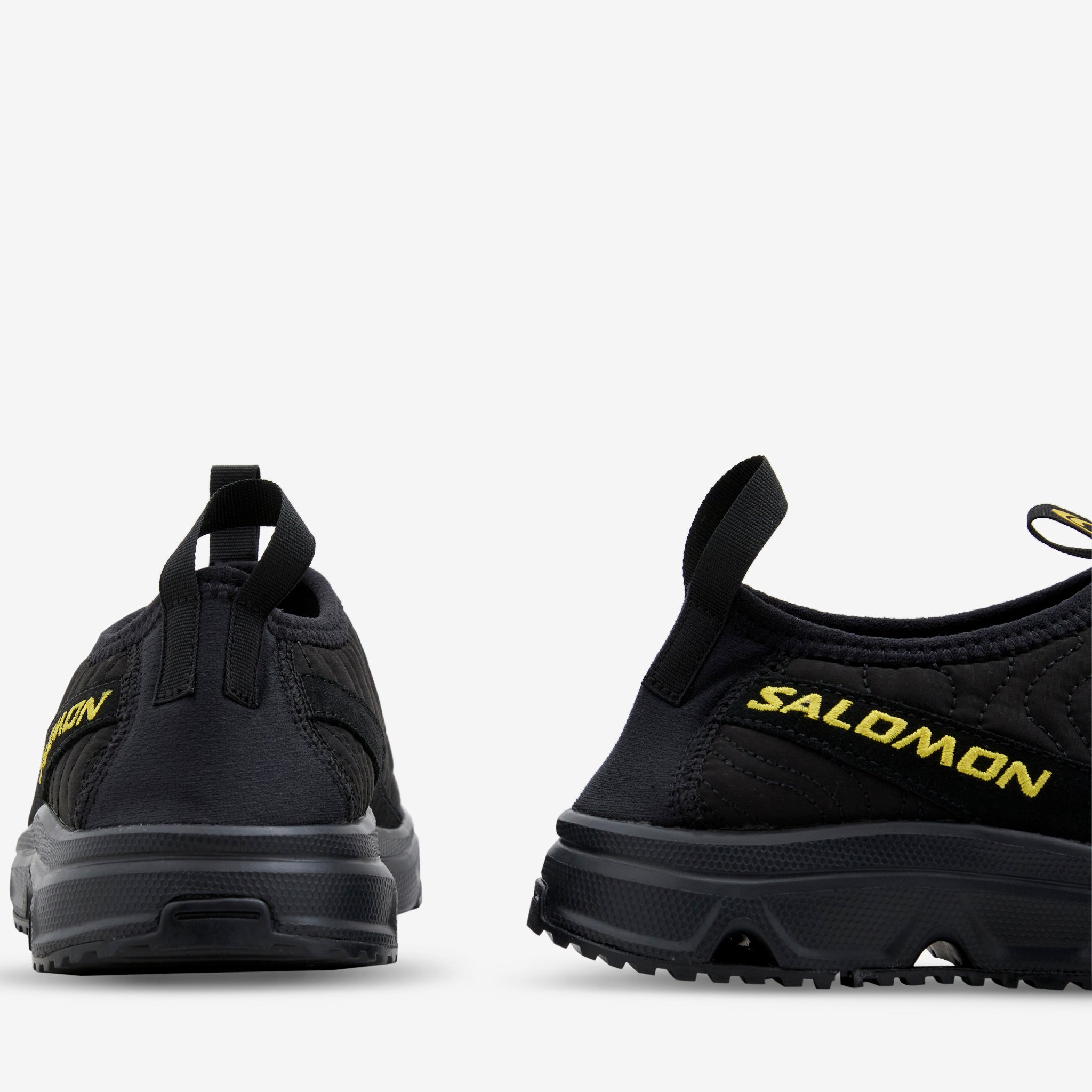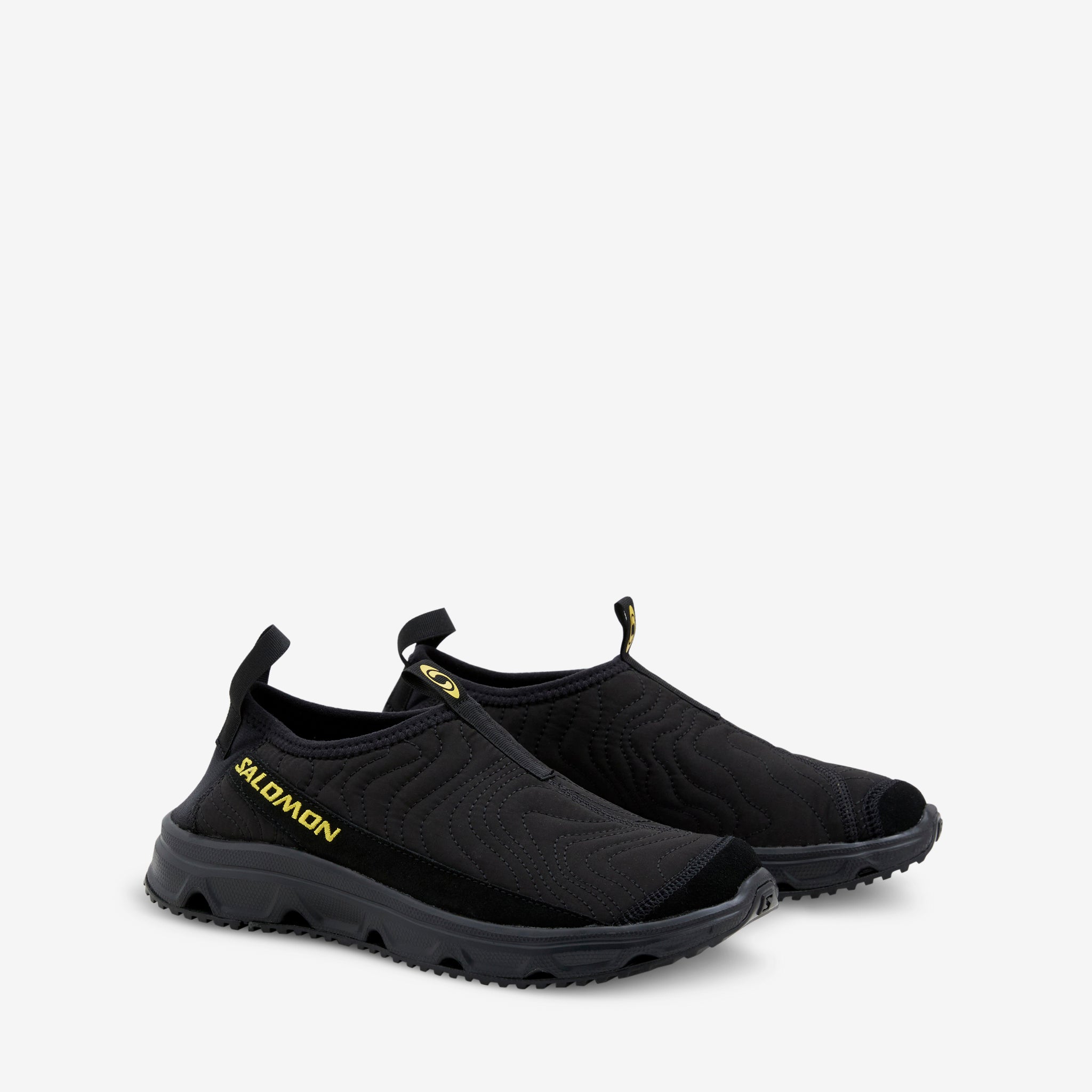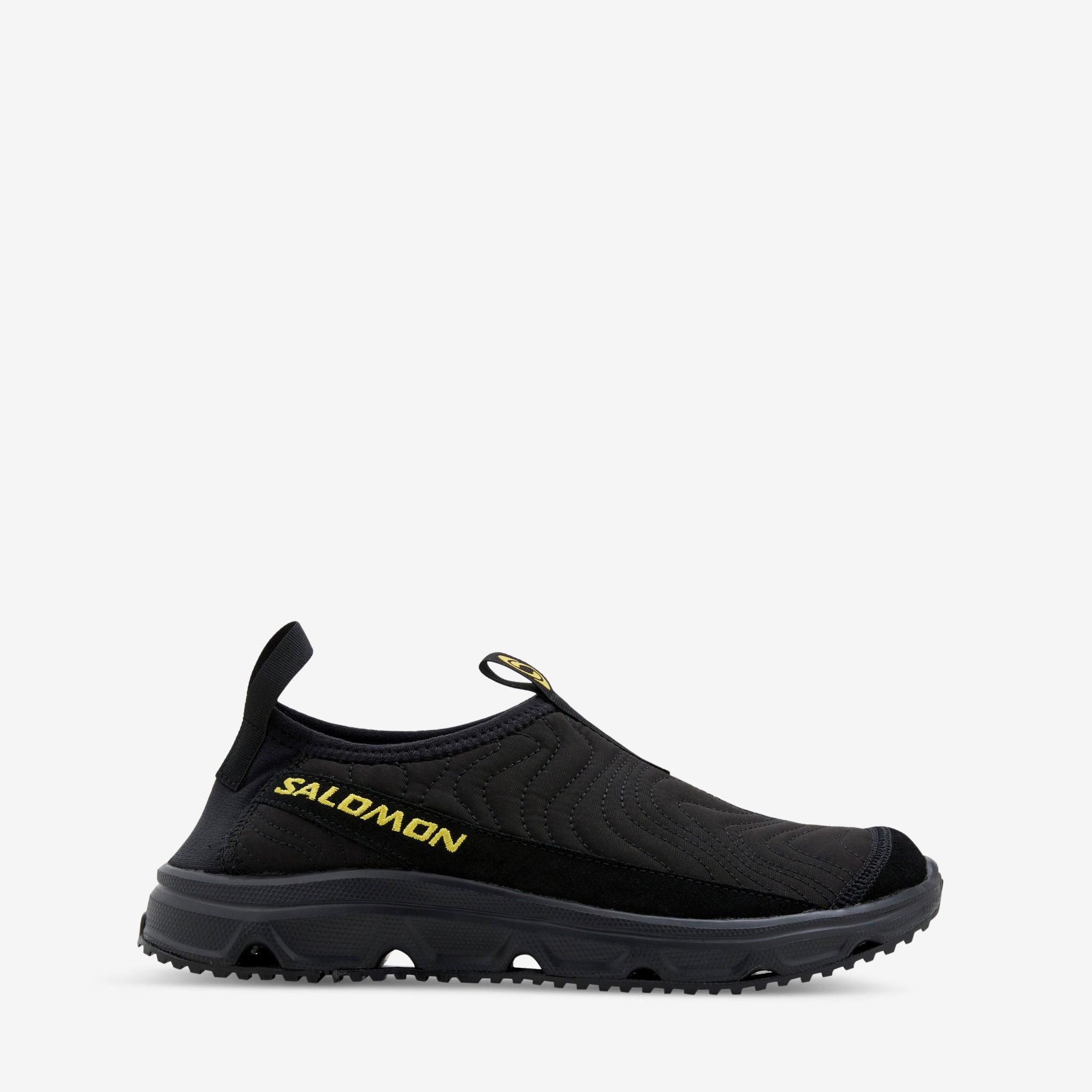 Men's RX Moc 3.0 ATQ in Black and Lemon from Salomon. Designed for rest and recovery, this moc features a laceless design with a soft quilted upper featuring topographical stitching and a protective toecap. Cork inlay sole and EVA sockliner provide unparalleled cushioning and comfort. Finished with an All Terrain Contagrip® outsole for durable traction.