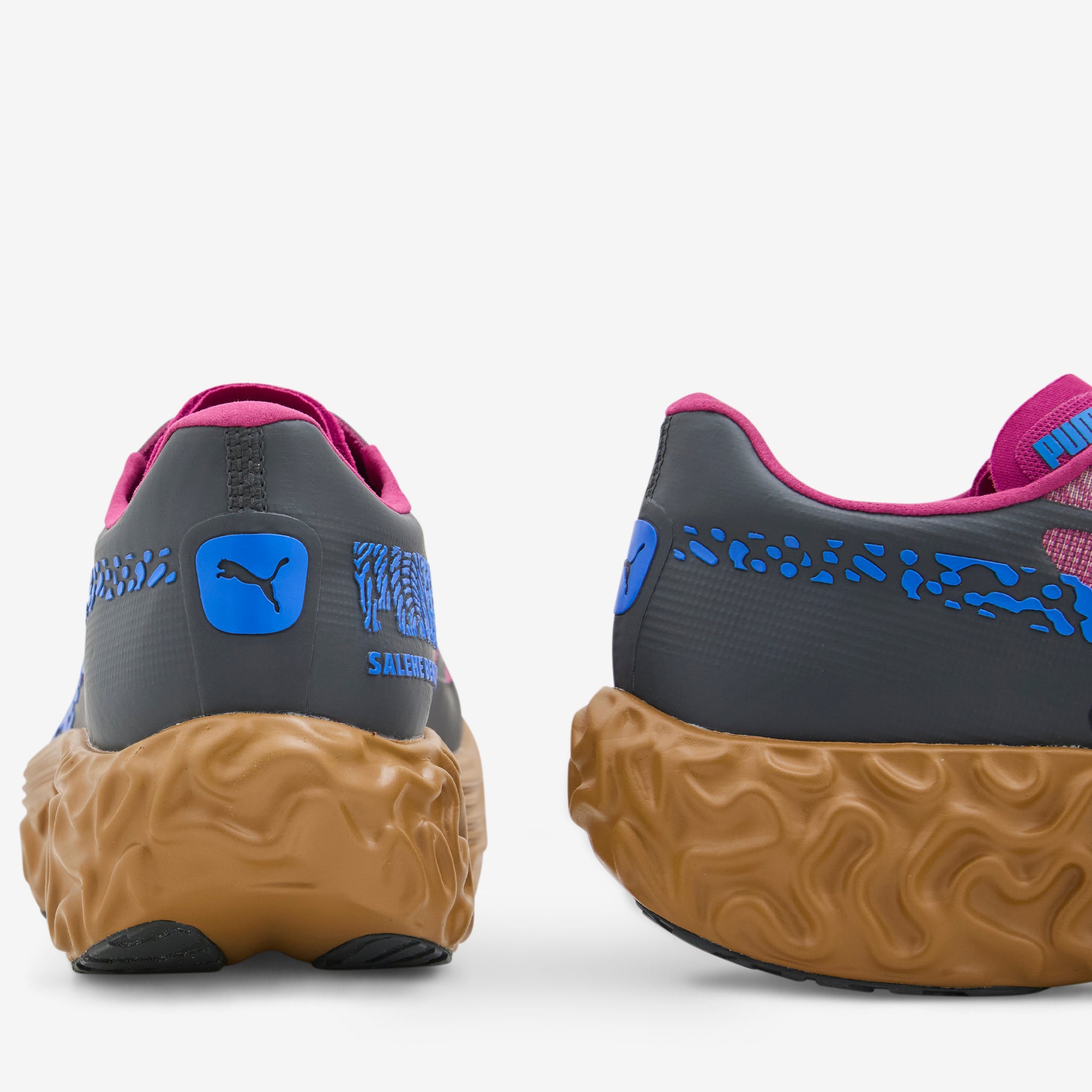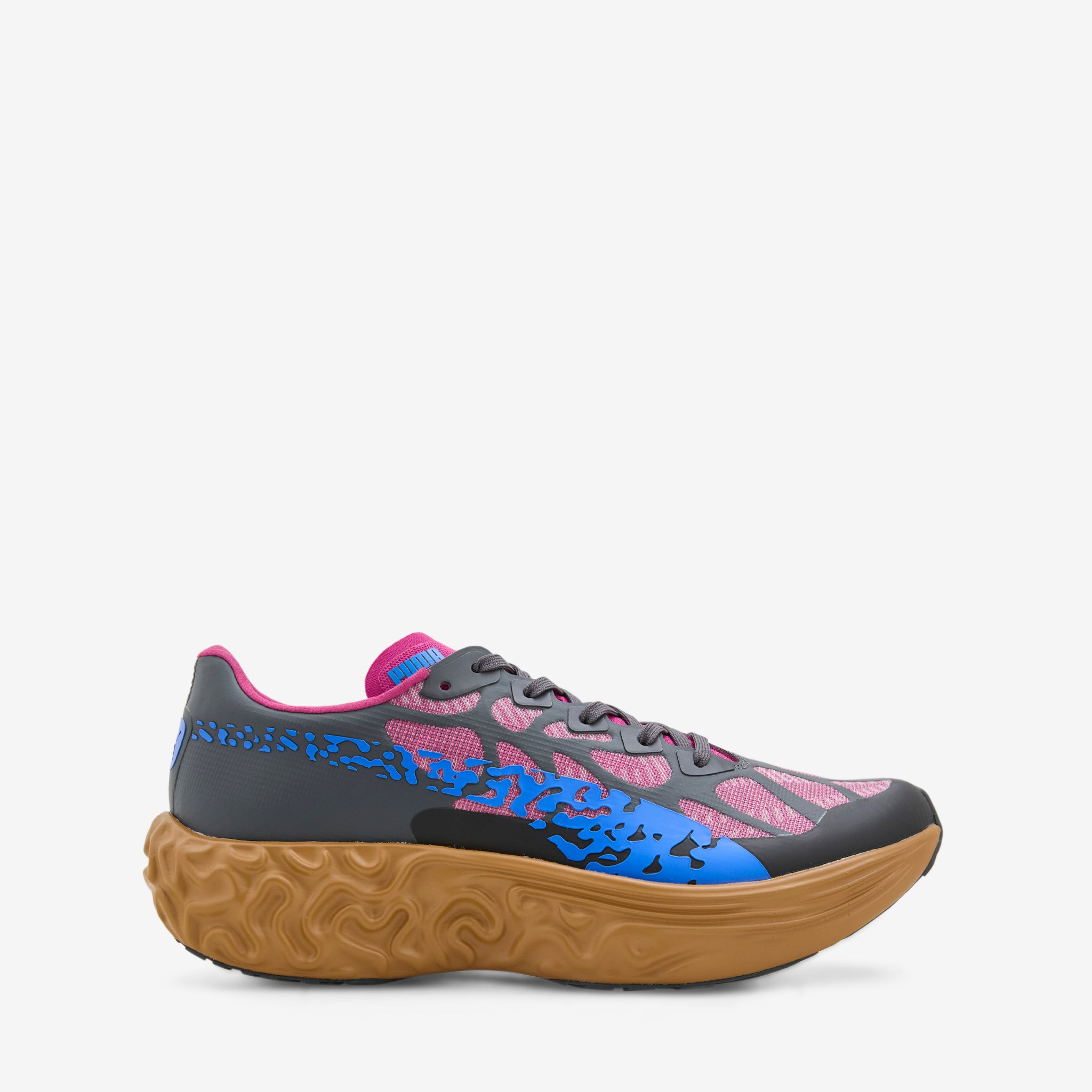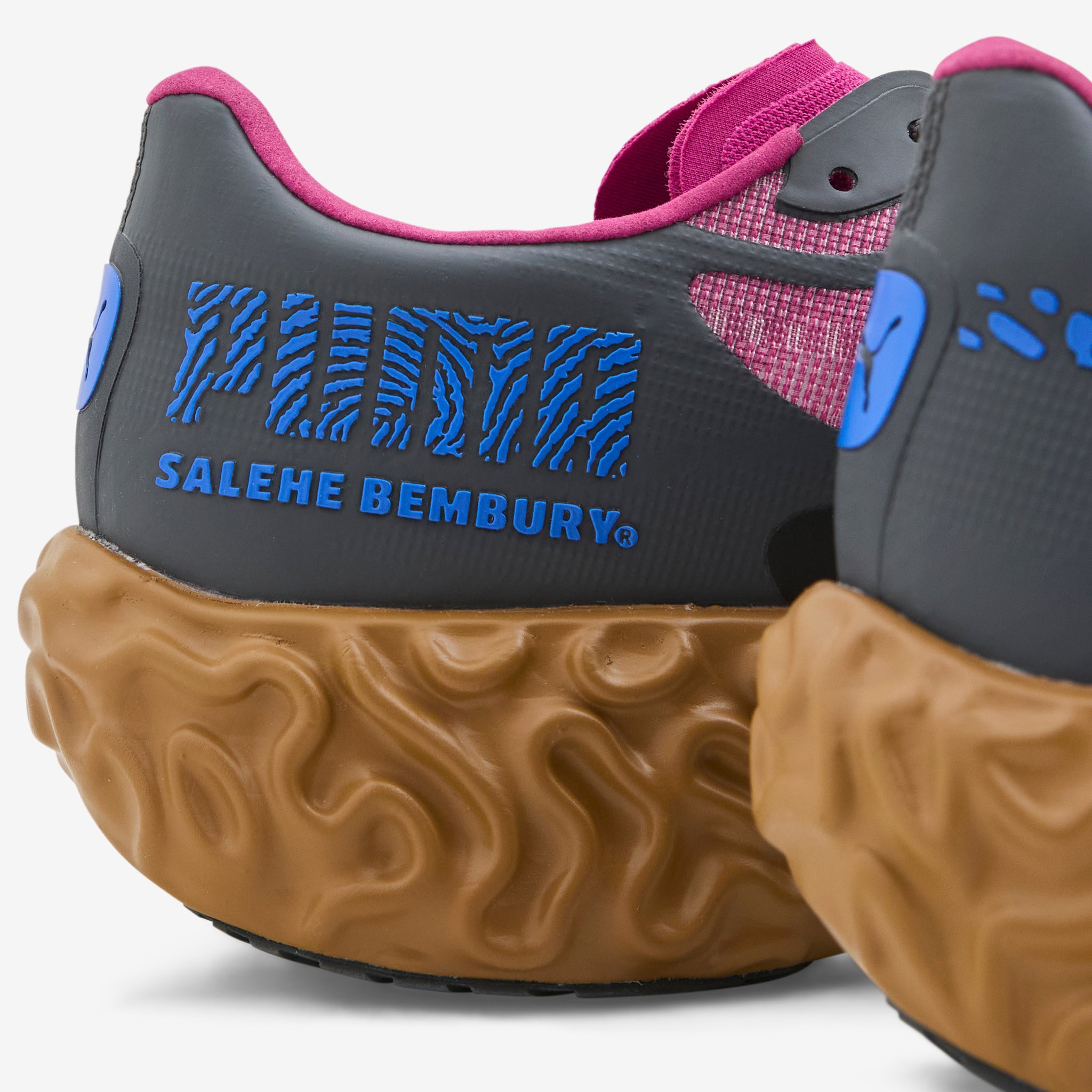 Salehe Bembury collaborates with Puma on theVelum Nitro in Magenta Gleam and Dusky Grey. Multi-layered mesh upper with finger-print inspired graphics and a constrast Formstrip. Sculpted NITROFOAM™ midsole adds cushion and support. Finished with a rubber outsole and collaborative branding details.