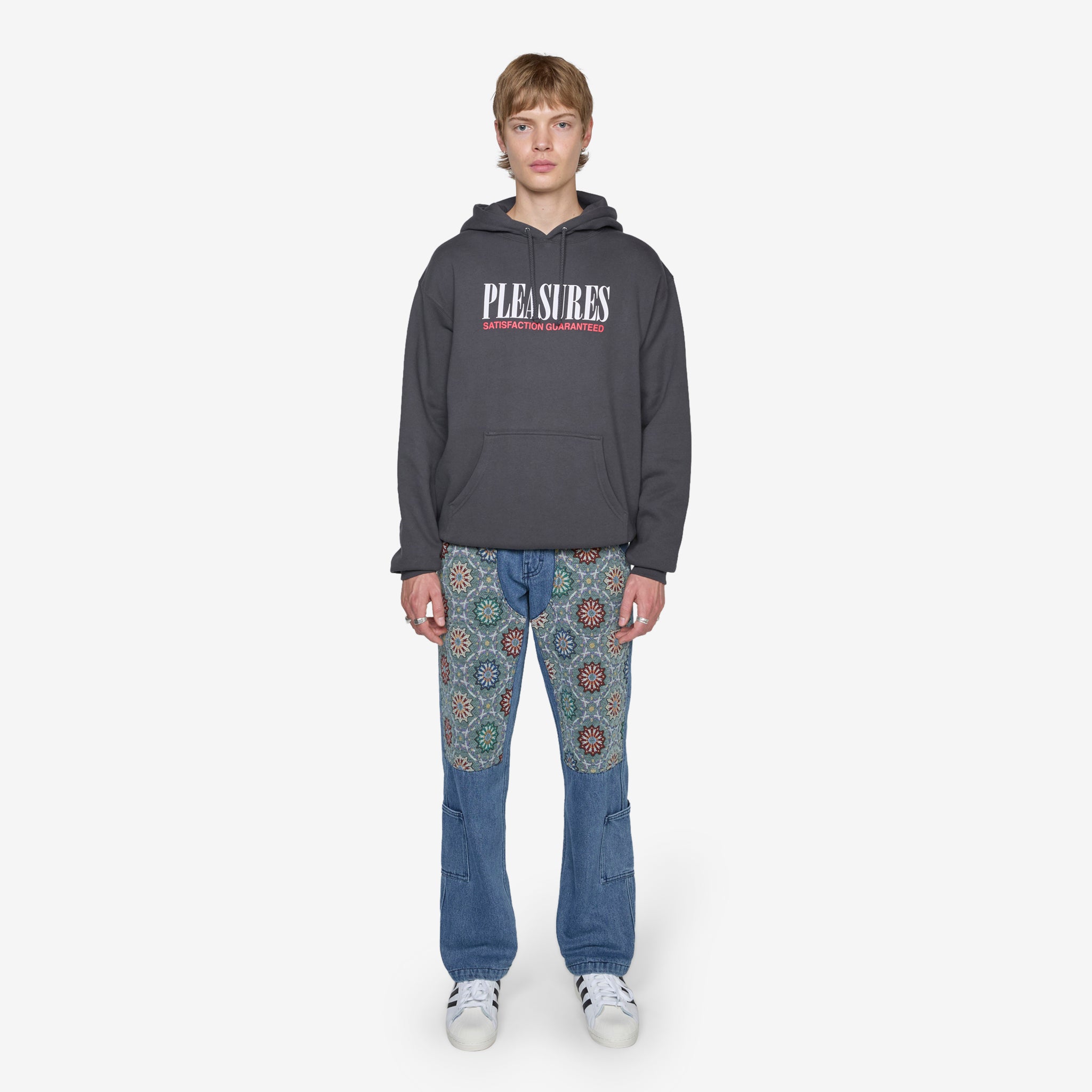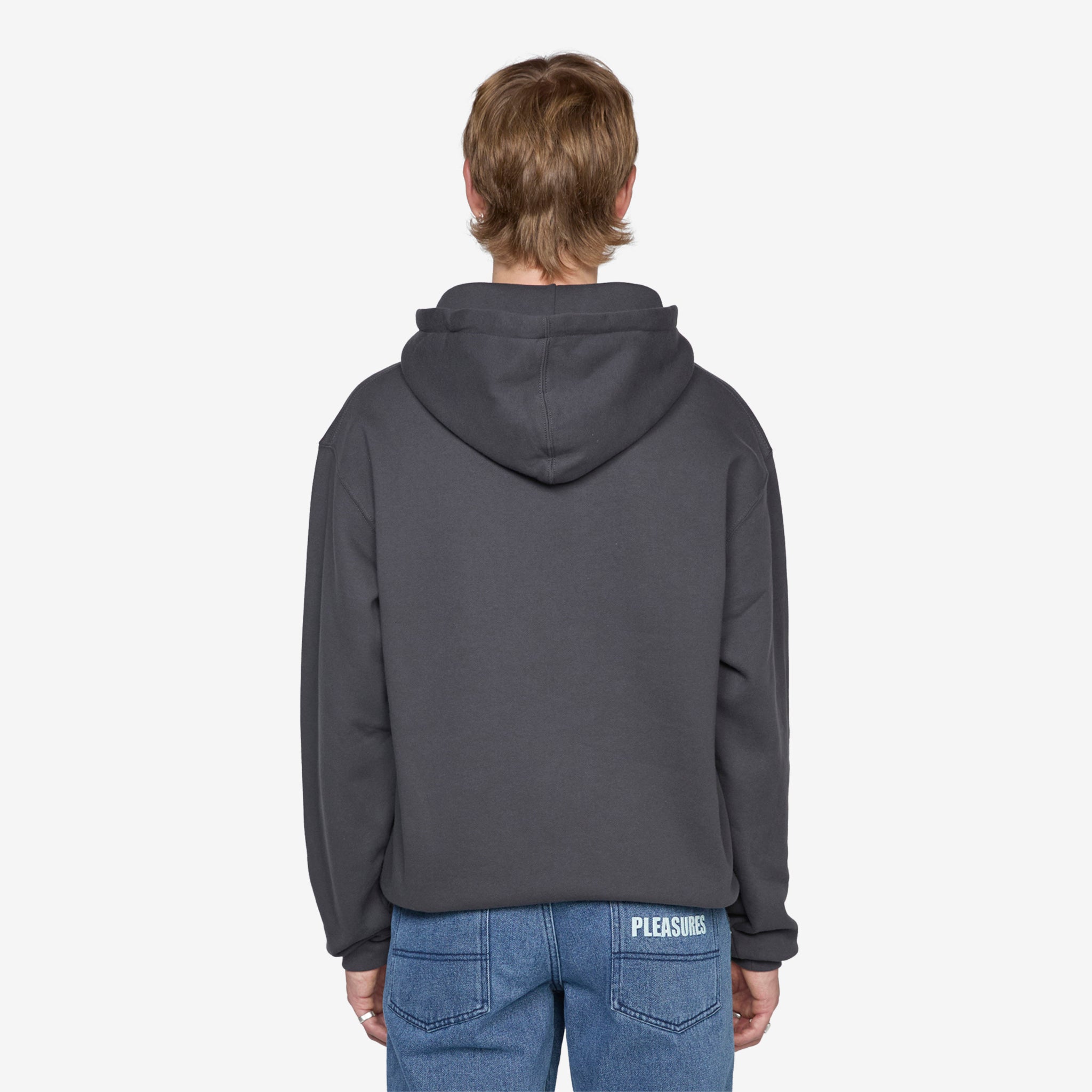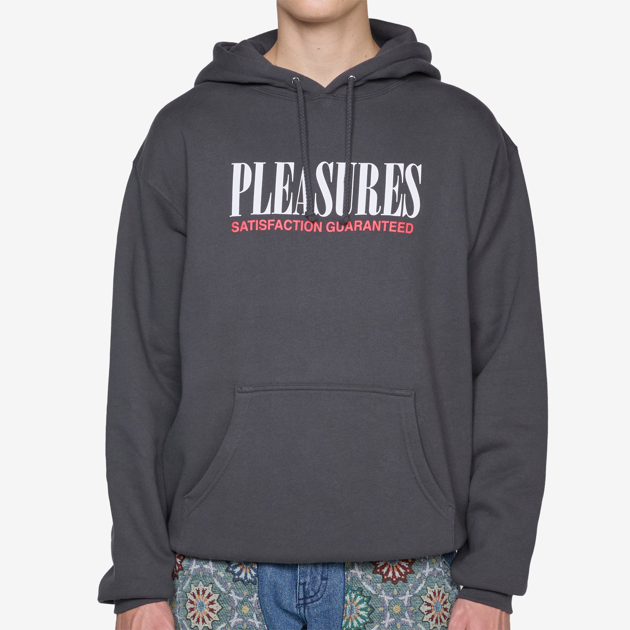 Satisfaction Hoodie in Asphalt from PLEASURES. Regular fit sweatshirt with a drawstring adjustable hood, kangaroo pocket and ribbed trims. Crafted from a heavyweight cotton blend and finished with printed branding at the chest.