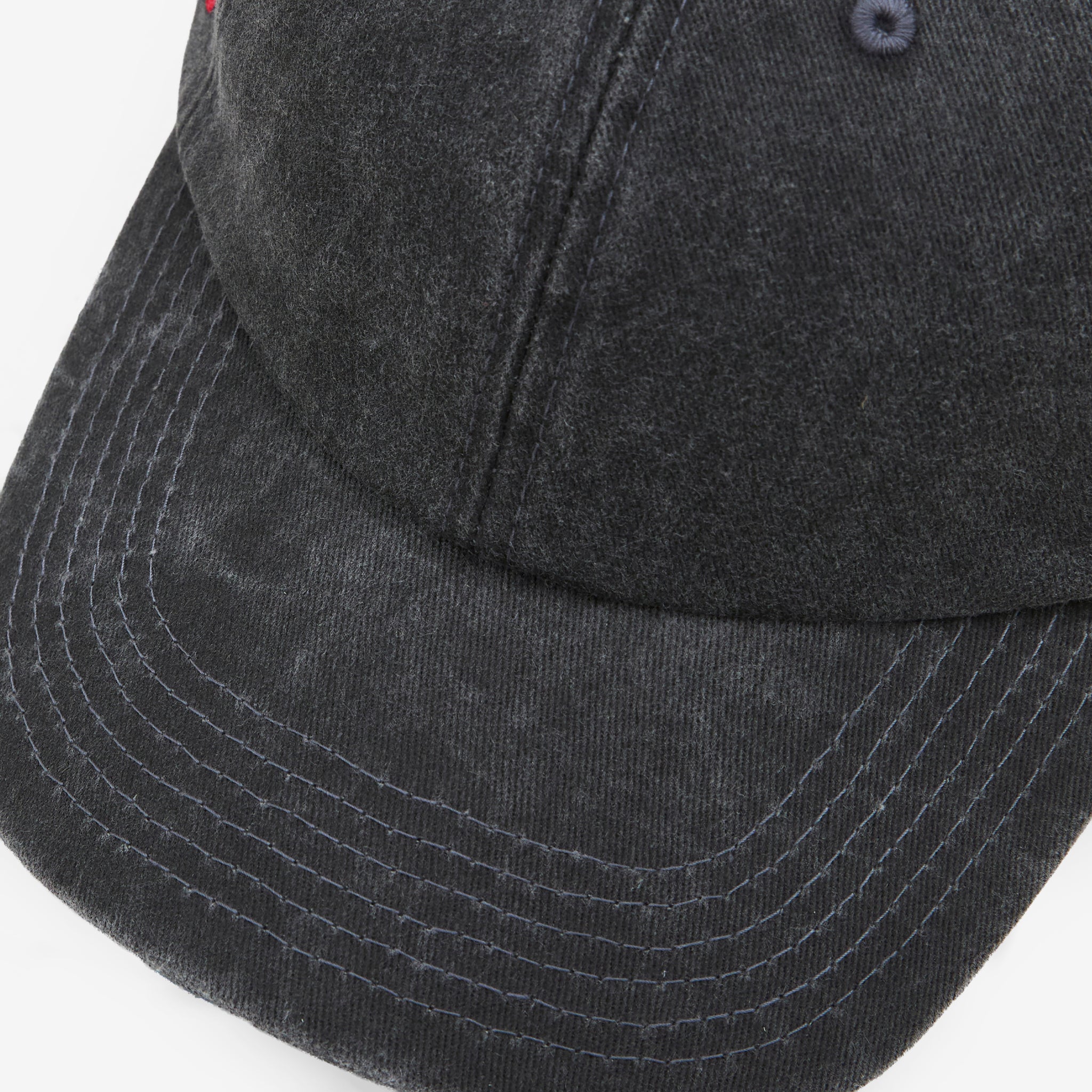 Scrawl Polo Cap in Black from PLEASURES. 6-panel cap with embroidered ventilating eyelets and an adjustable self-fabric backstrap. Crafted from distress-washed cotton and finished with Scrawl embroidered branding at both sides.