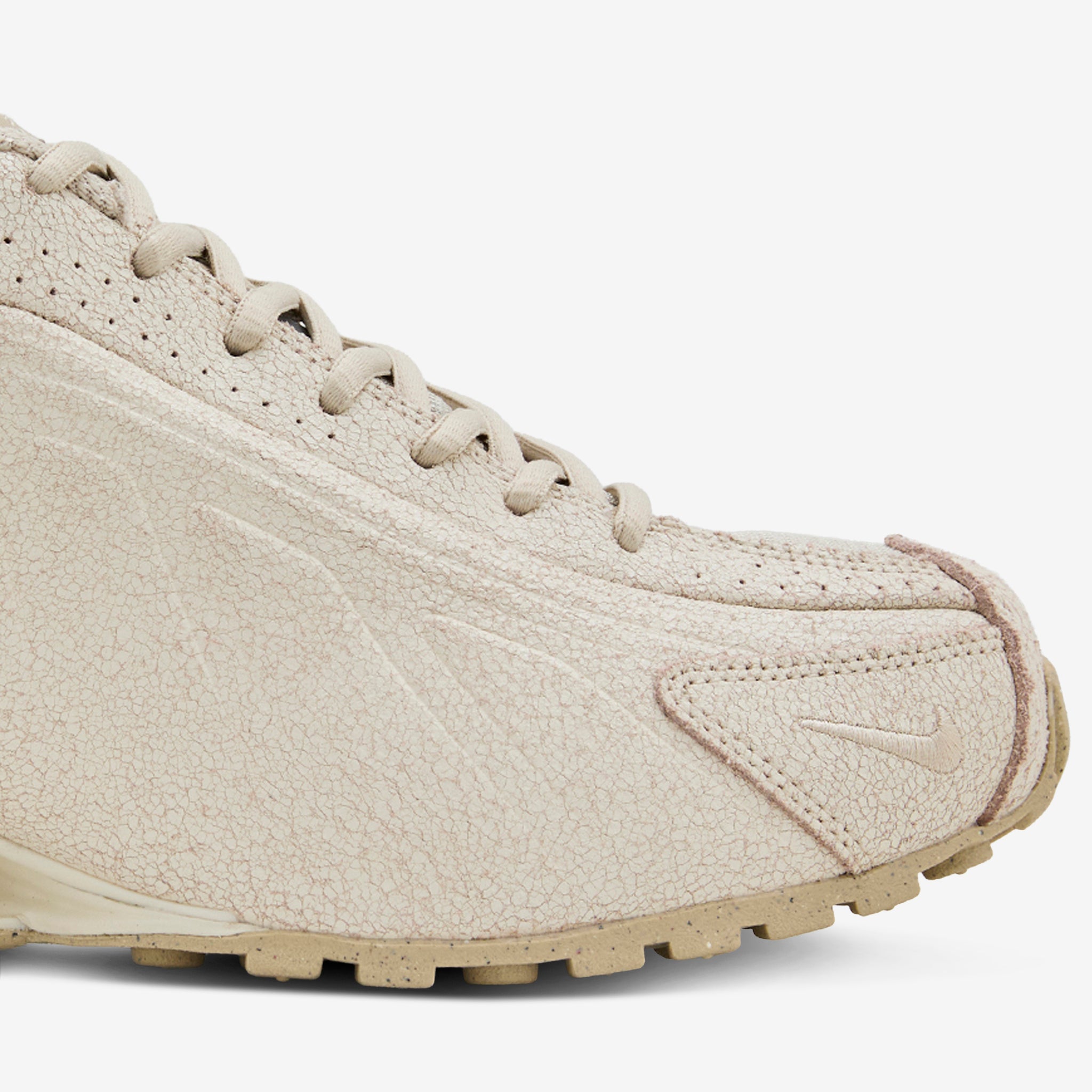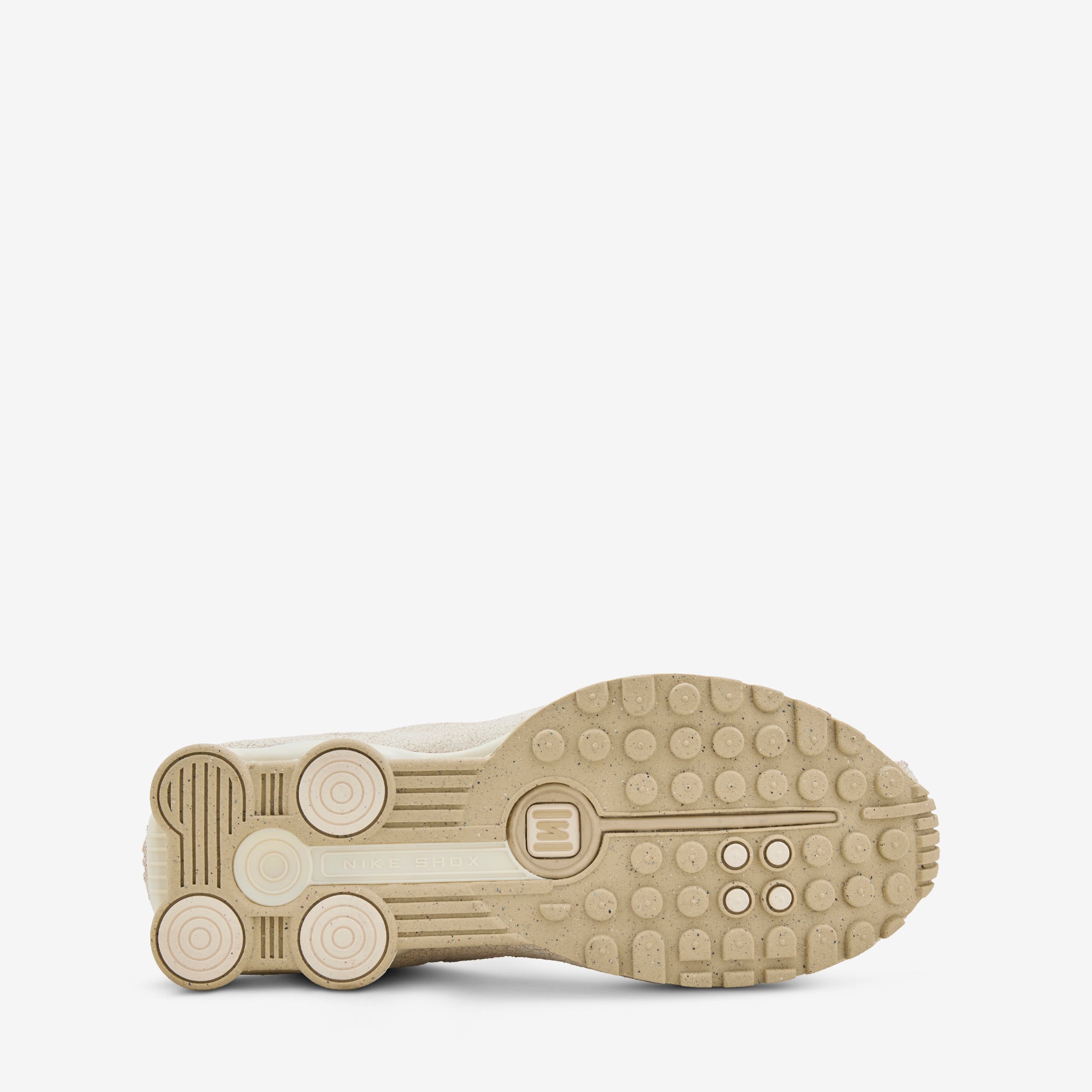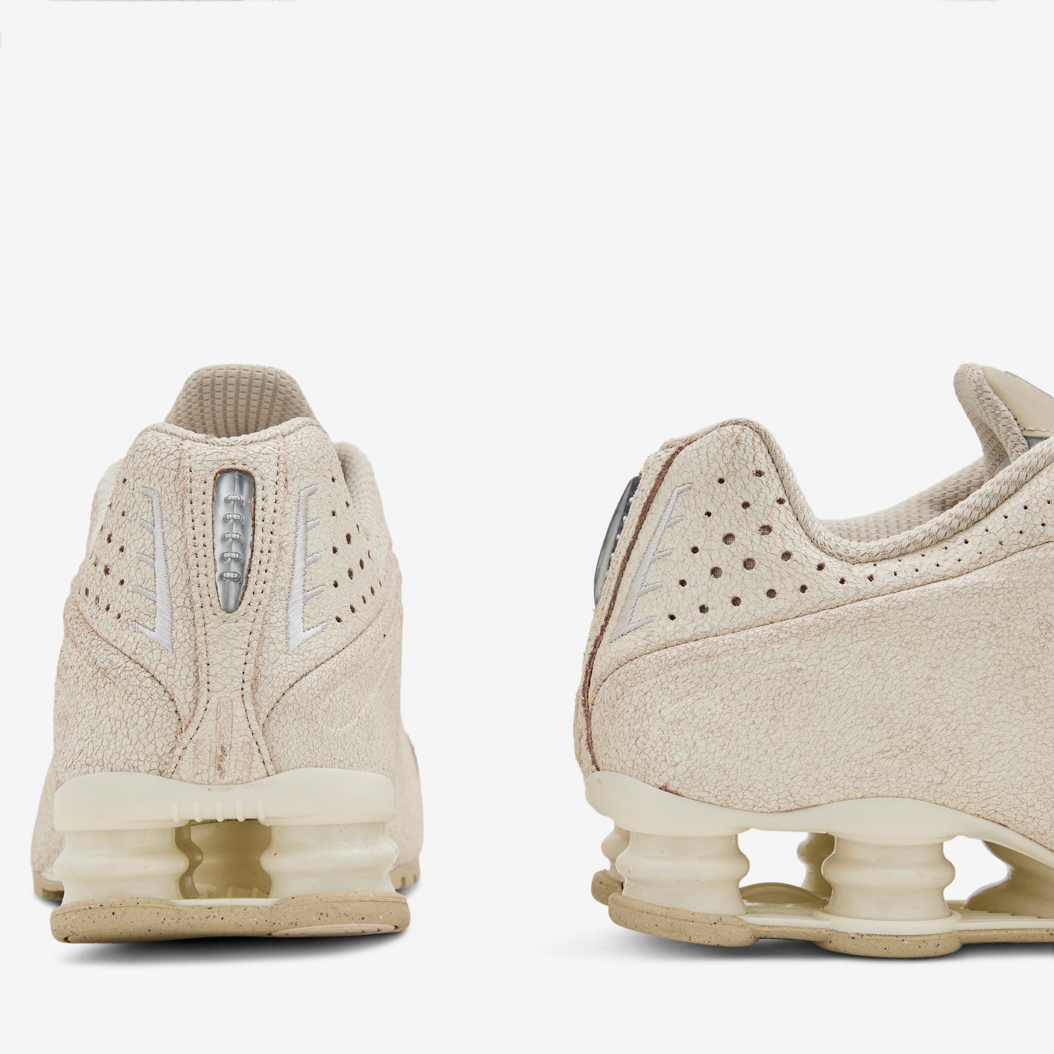 Men's Shox R4 in Natural, Net and Metallic Silver from Nike. Cracked natural suede upper features a minimalistic look with laser perforations and a unique toebox Swoosh replacing the classic side branding. Signature Shox cushioning and rubber outsole provide comfort and support.