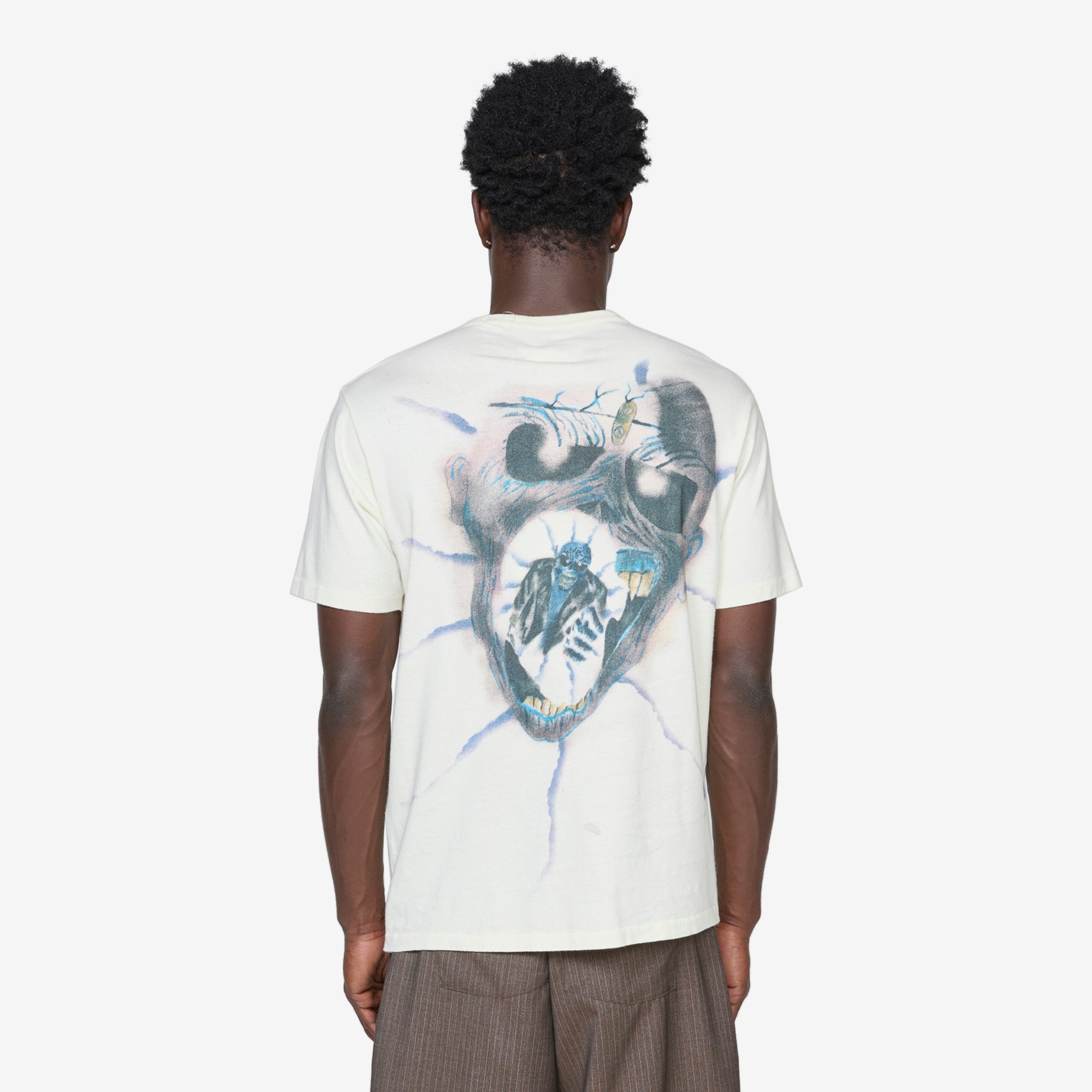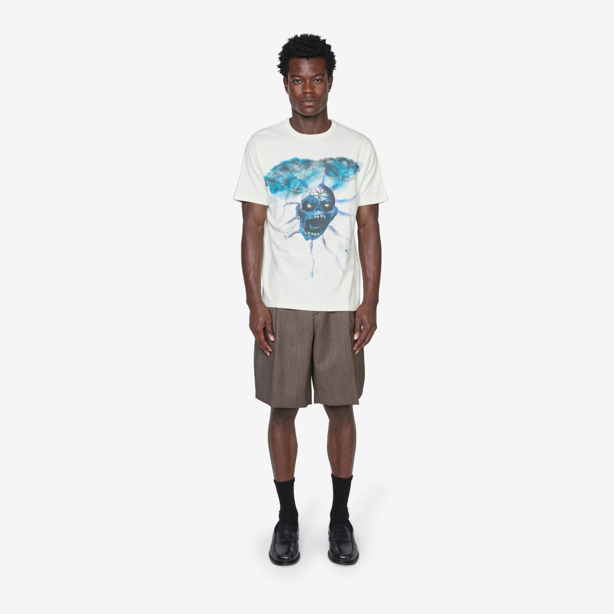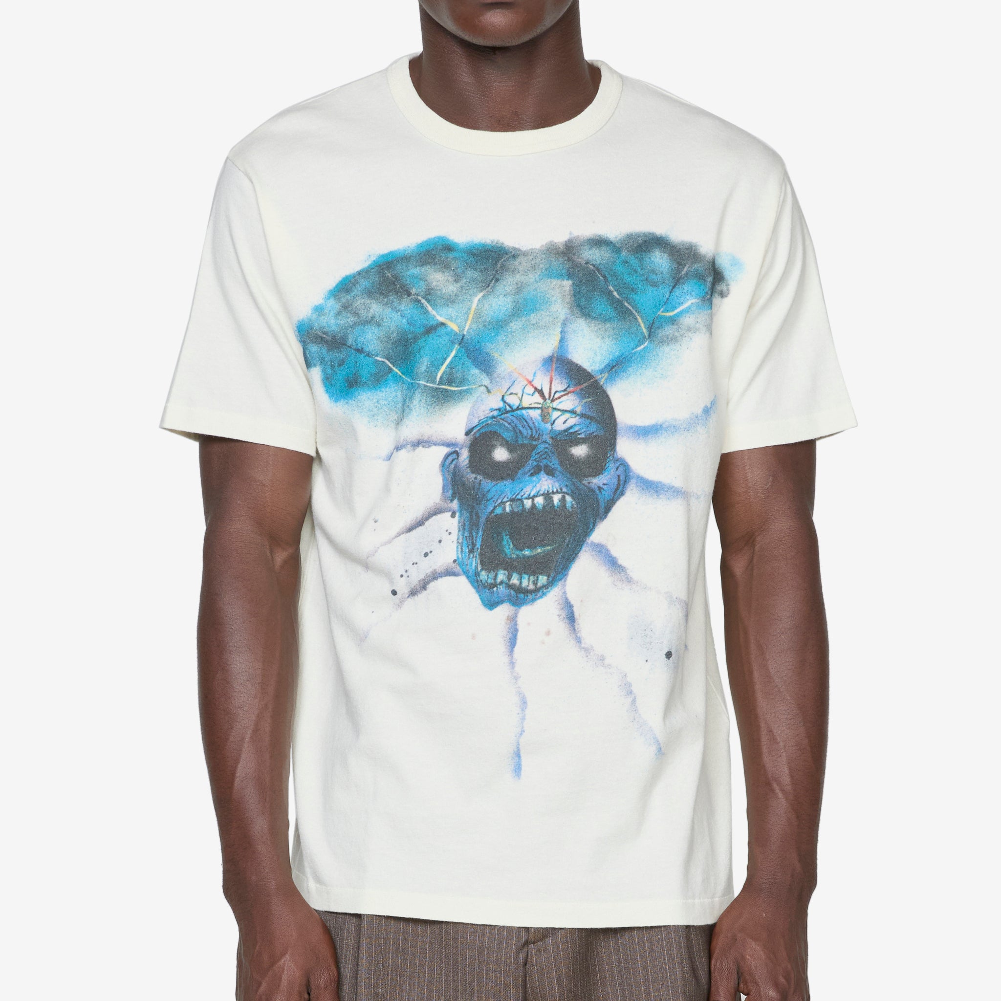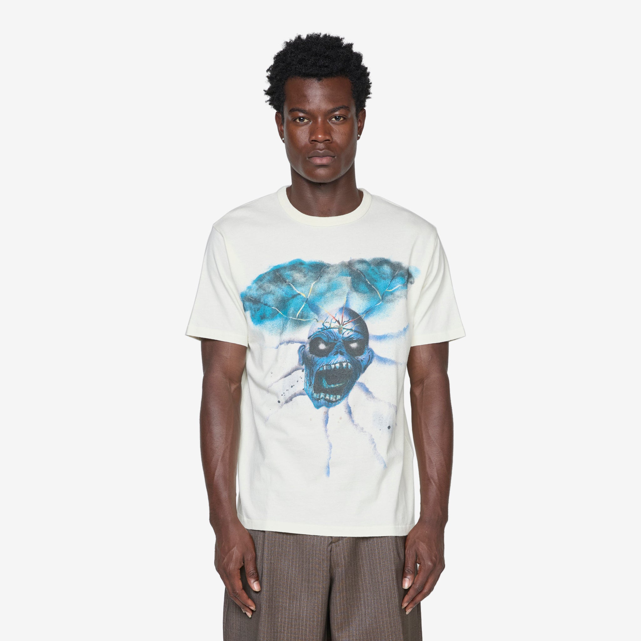 Skull T-Shirt in Skull Print from ERL. Boxy fit t-shirt with a ribbed crew neckline and shortened sleeves. Crafted from a soft premium cotton and finished with a custom skull print across the front.