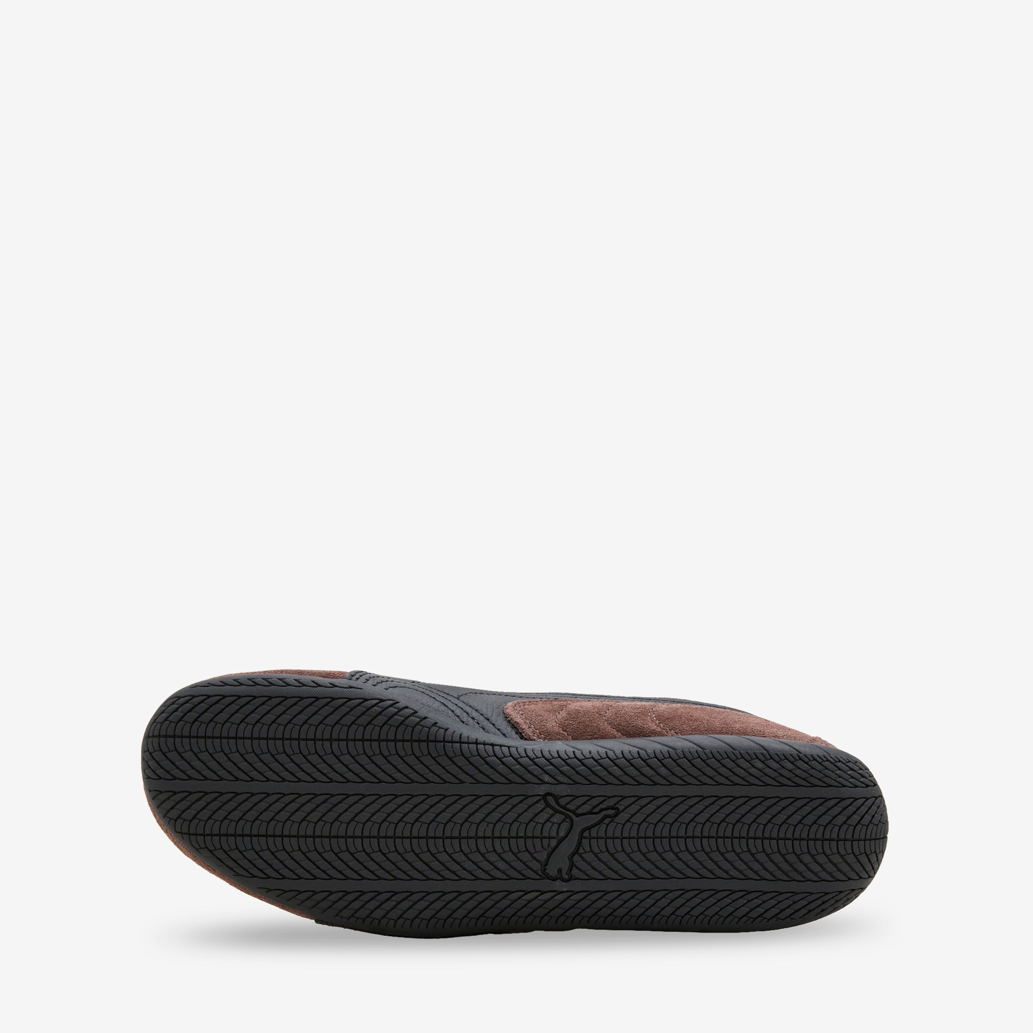 Unisex Speedcat in Chestnut Brown and PUMA Black from Puma. Low-profile race-inspired sneaker crafted with soft suede upper and signature Formstrip overlays. Gum rubber outsole provides traction and support. Finished with gold foil branding and embroidery at the toe.
