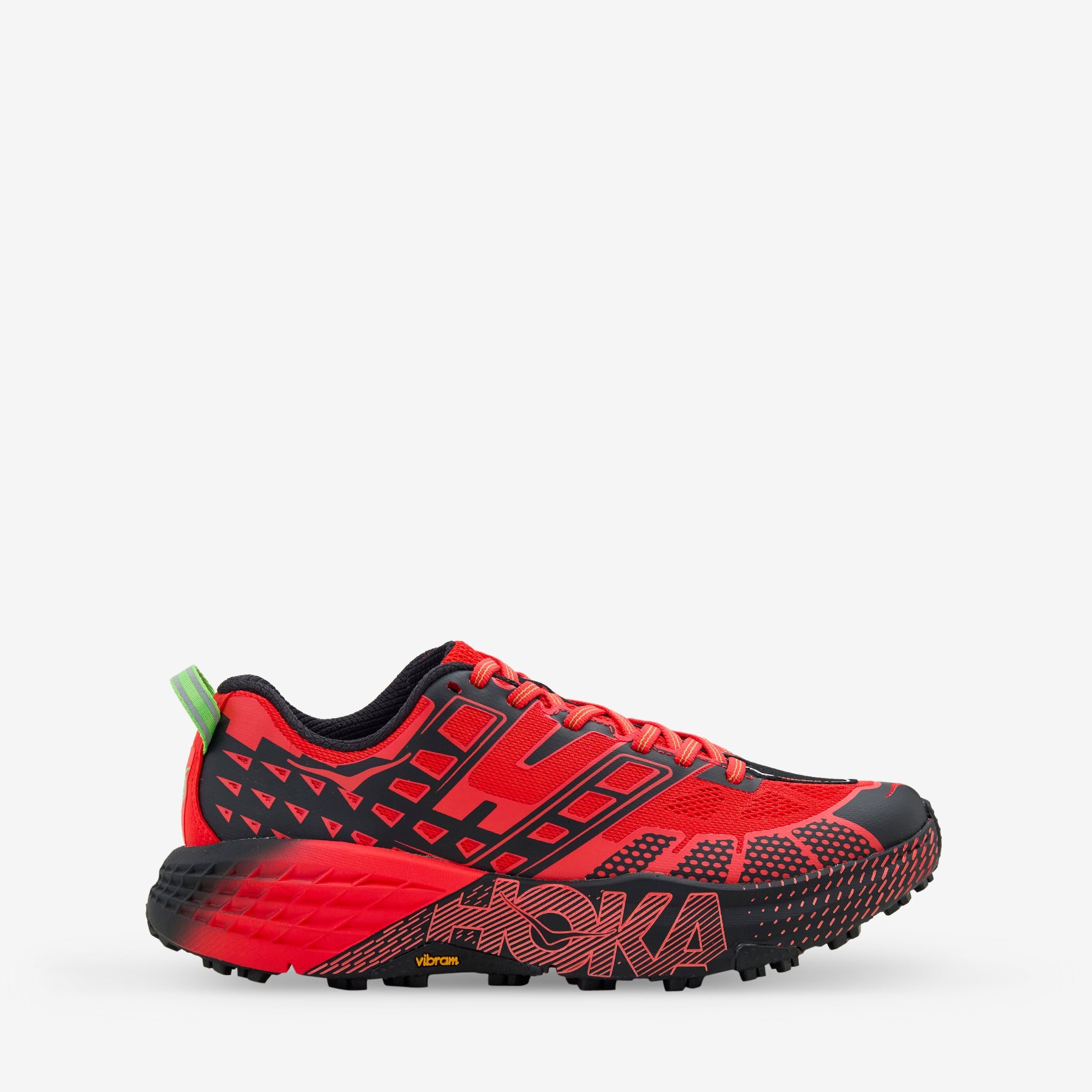 Men's Speedgoat 2 Low in Tomato and Electric Green from Hoka. Lightweight trail-running silhouette featuring an open engineered mesh upper with protective fused overlays and a midfoot cage. Wider forefoot EVA midsole provides stable cushioning. Finished with an aggressively lugged Vibram® Megagrip outsole for unparalleled traction on a range of terrains.