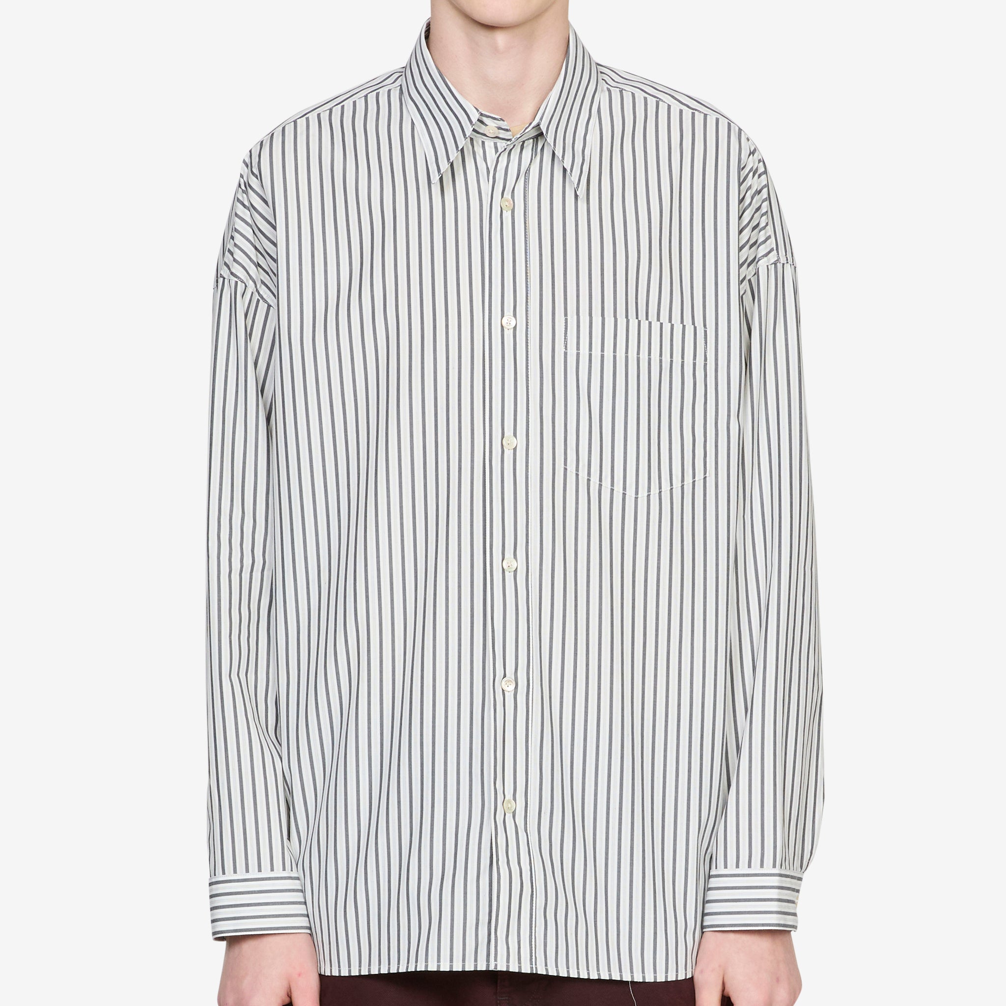 Stable Shirt in Antracite Stripe from Sunflower. Relaxed fit shirt with a classic collar, slightly dropped shoulders, mother-of-pearl button closure and a curved hem. Crafted from a lightweight 60's style cotton poplin in a yarn-dyed stripe. Finished with a patch pocket at the chest.