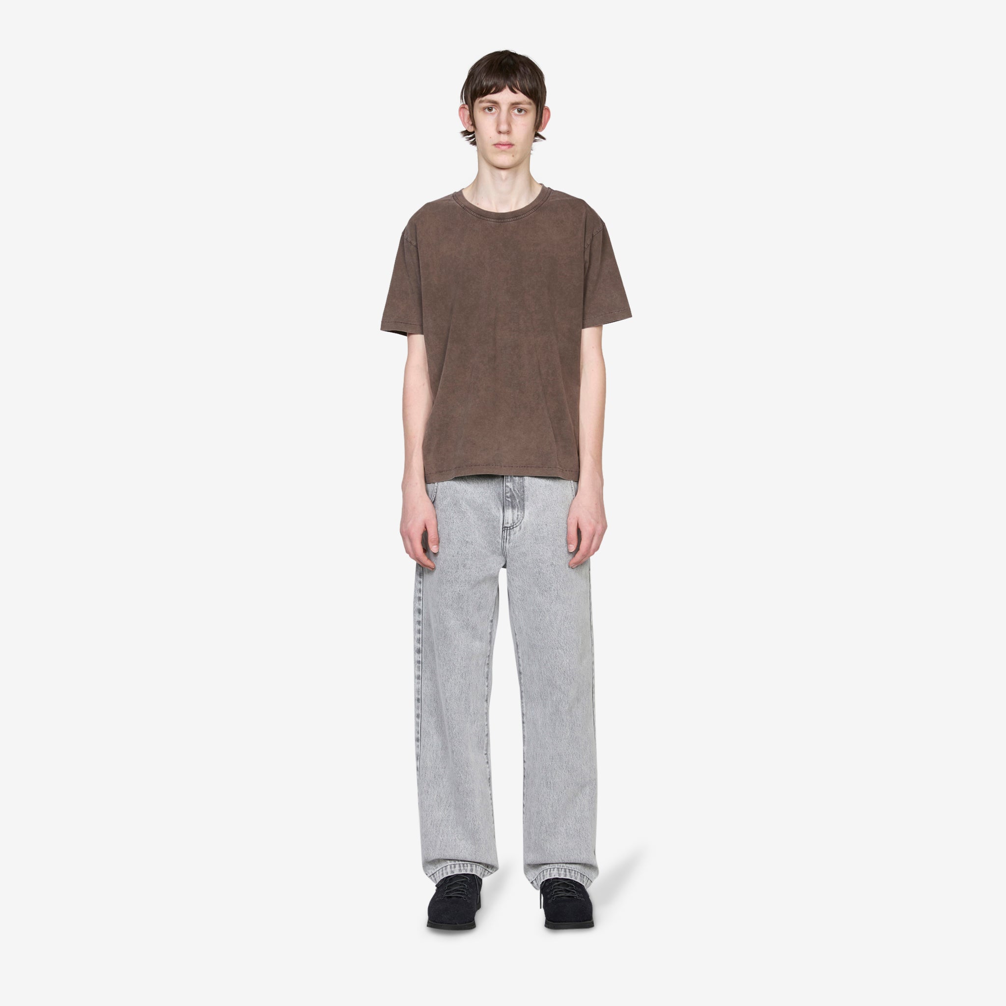 Straight Cut Jeans Acid Wash from mfpen. Relaxed straight-leg jeans with a mid-rise, cut from organic Cotton denim in a washed light grey tone. Features side pockets, rear patch pockets, a metal button closure, and a YKK zip fly. Finished with a dry hand feel and clean construction.