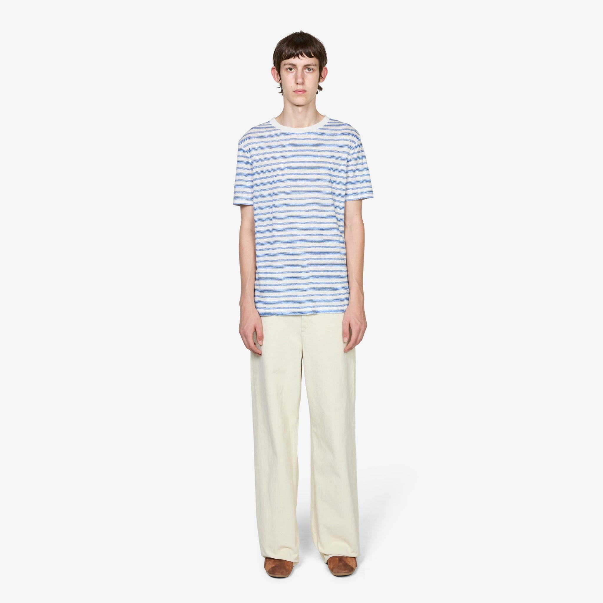 Striped T-Shirt in Blue from A.P.C. Regular fit t-shirt with a contrast ribbed crew neckline. Crafted from soft, breathable linen in a blue stripe. Finished with tonal embroidered branding at the left hem.