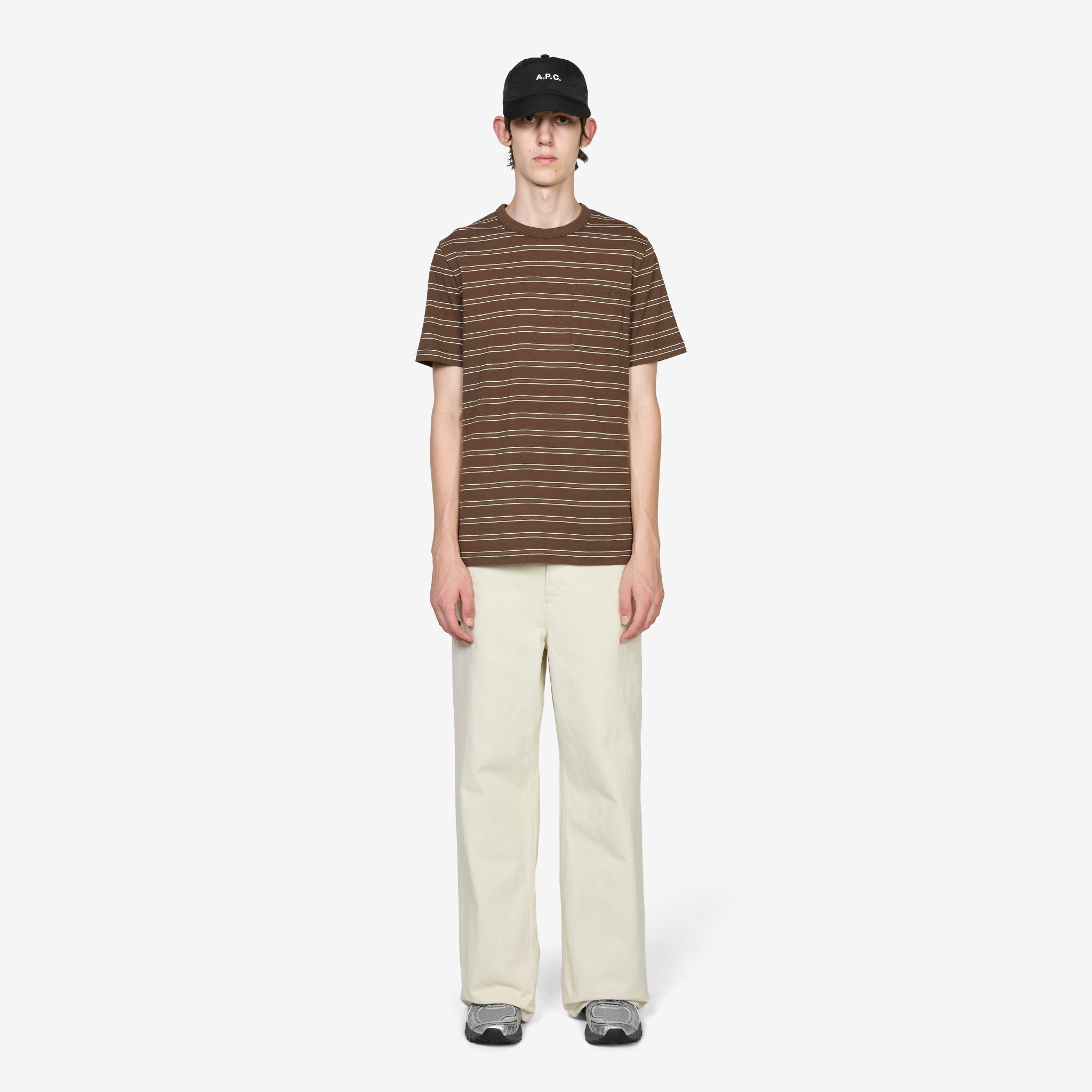 Striped T-Shirt in Chestnut Brown from A.P.C. Regular fit t-shirt with a contrast ribbed crew neckline and patch pocket at the chest. Crafted from organic cotton in a brown and white stripe. Finished with tonal embroidered branding at the chest pocket.