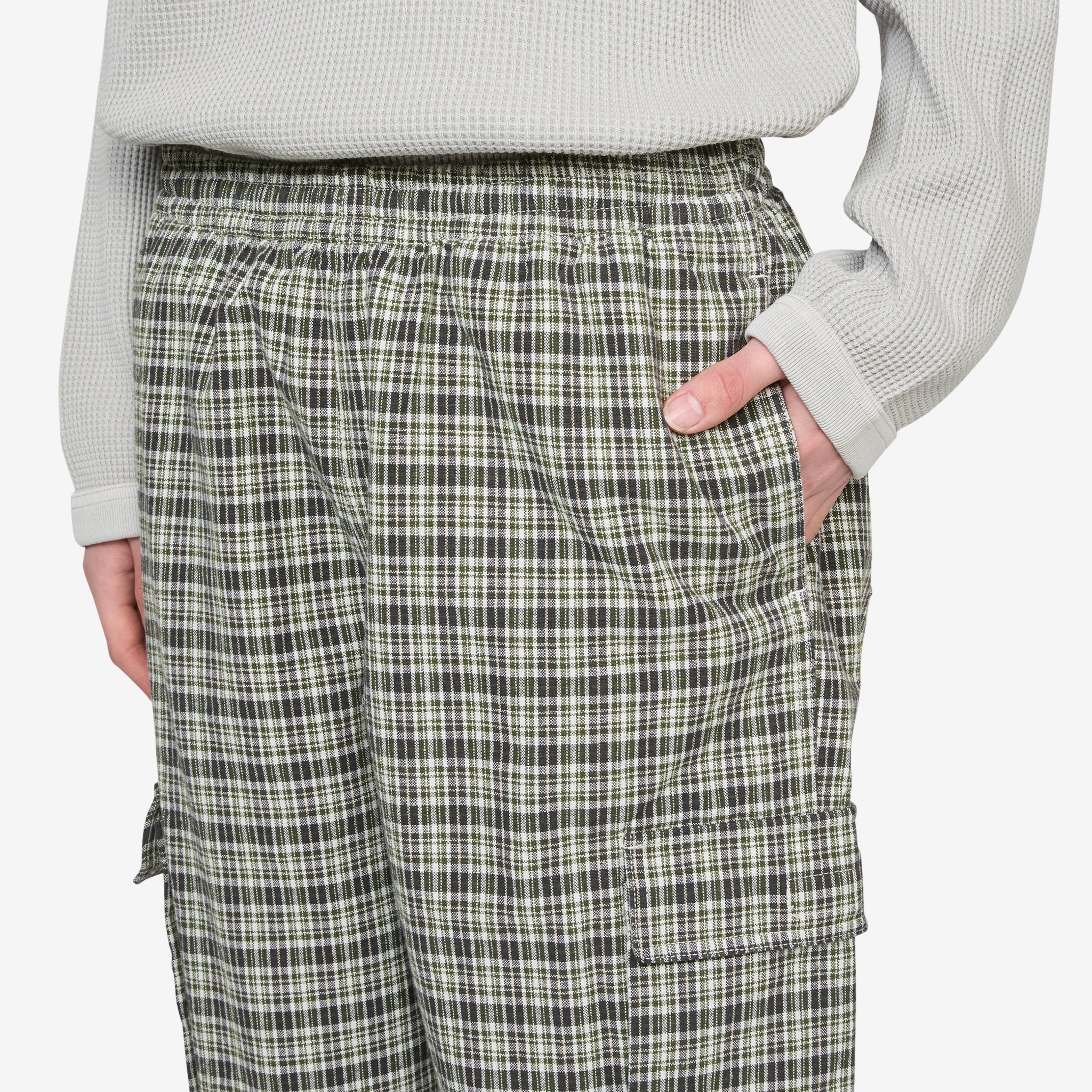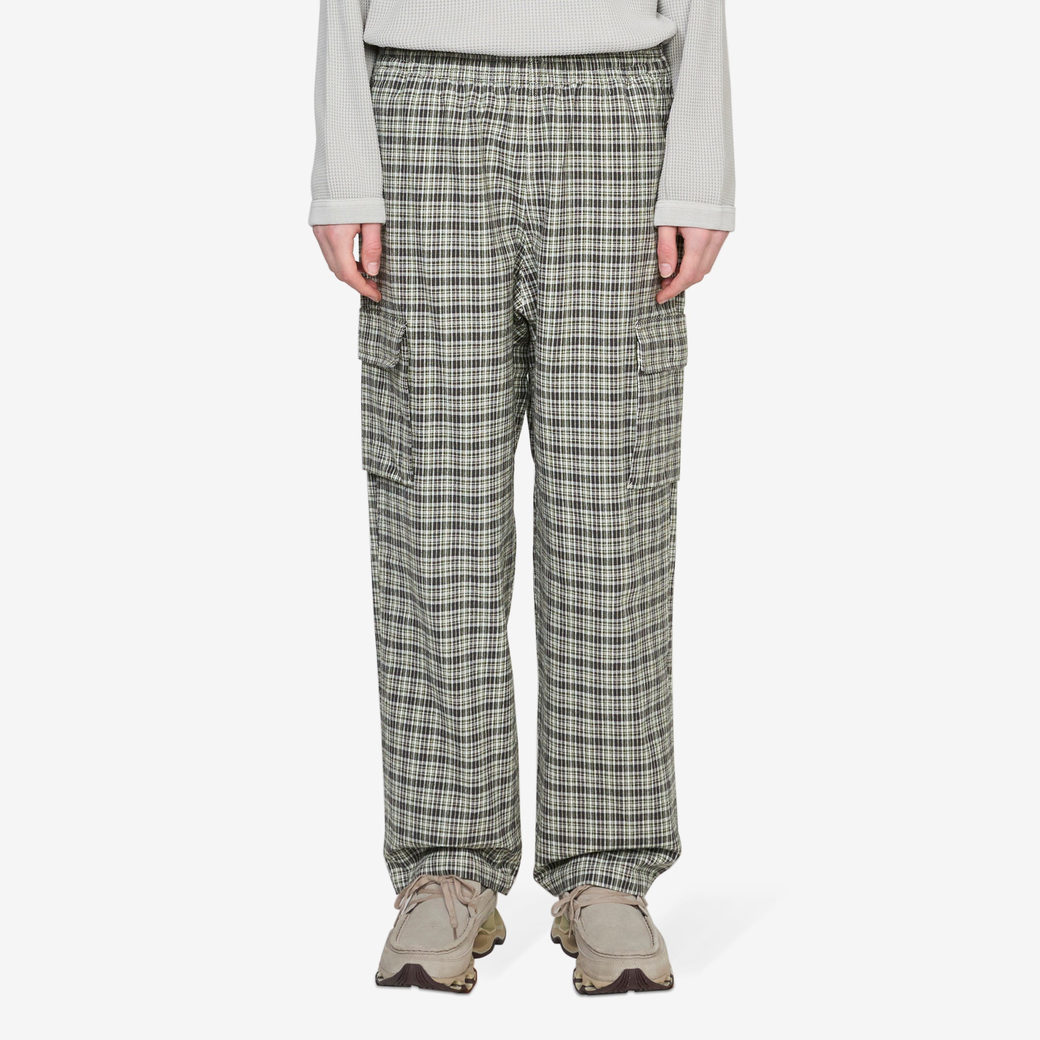 Swell Cargo Pant in Checkered Plaid from Gramicci. Relaxed fit pants with an elasticated belt loop waistband, side pockets and a diamond shaped crotch gusset for ease of movement. Crafted from checkered brushed cotton with a slightly tapered leg. Finished with roomy cargo pockets at the thighs.