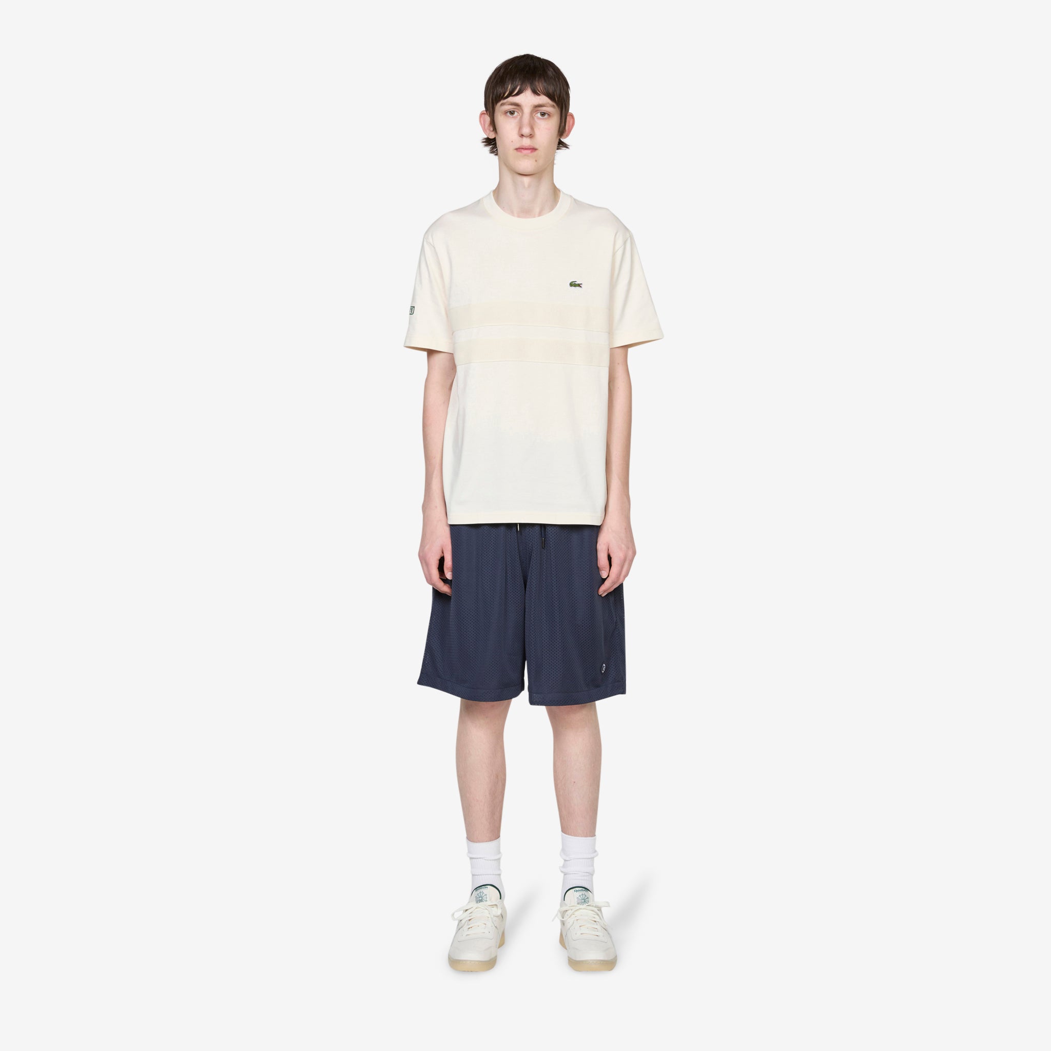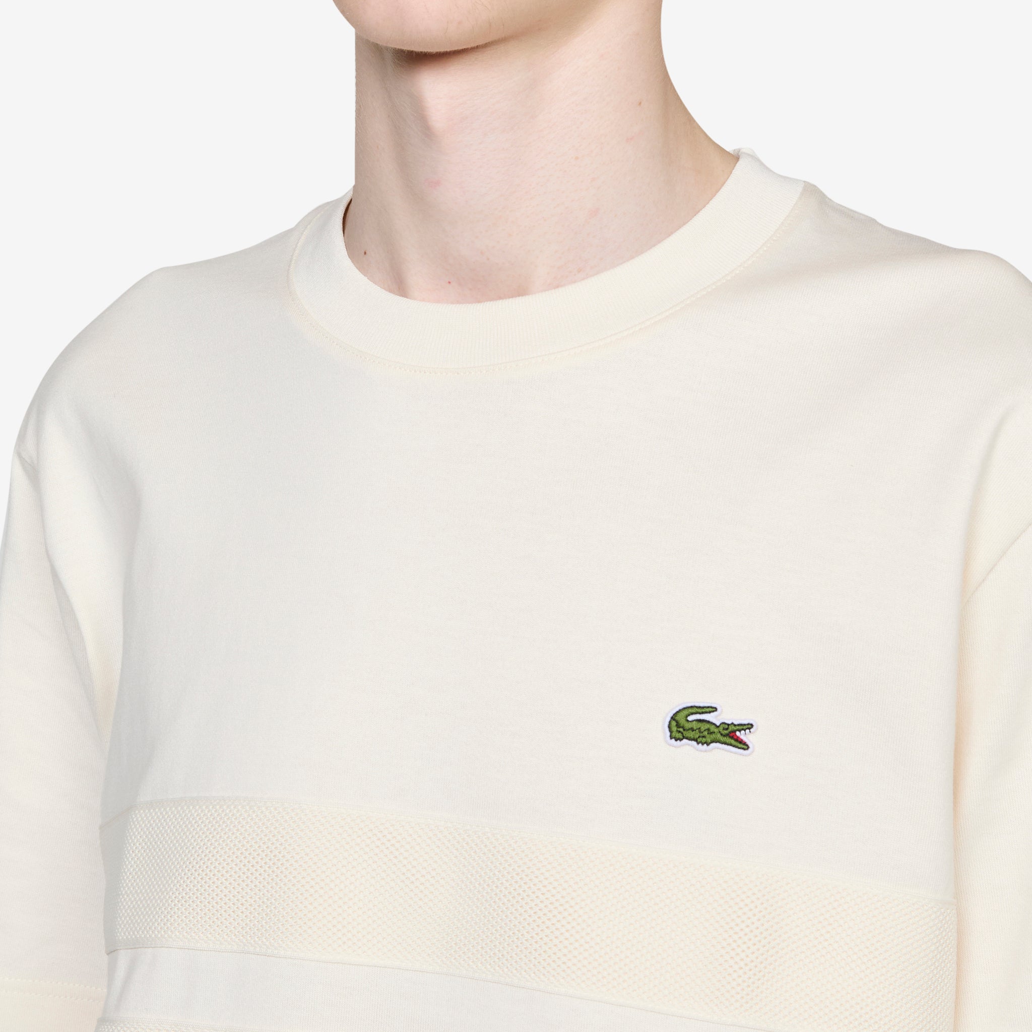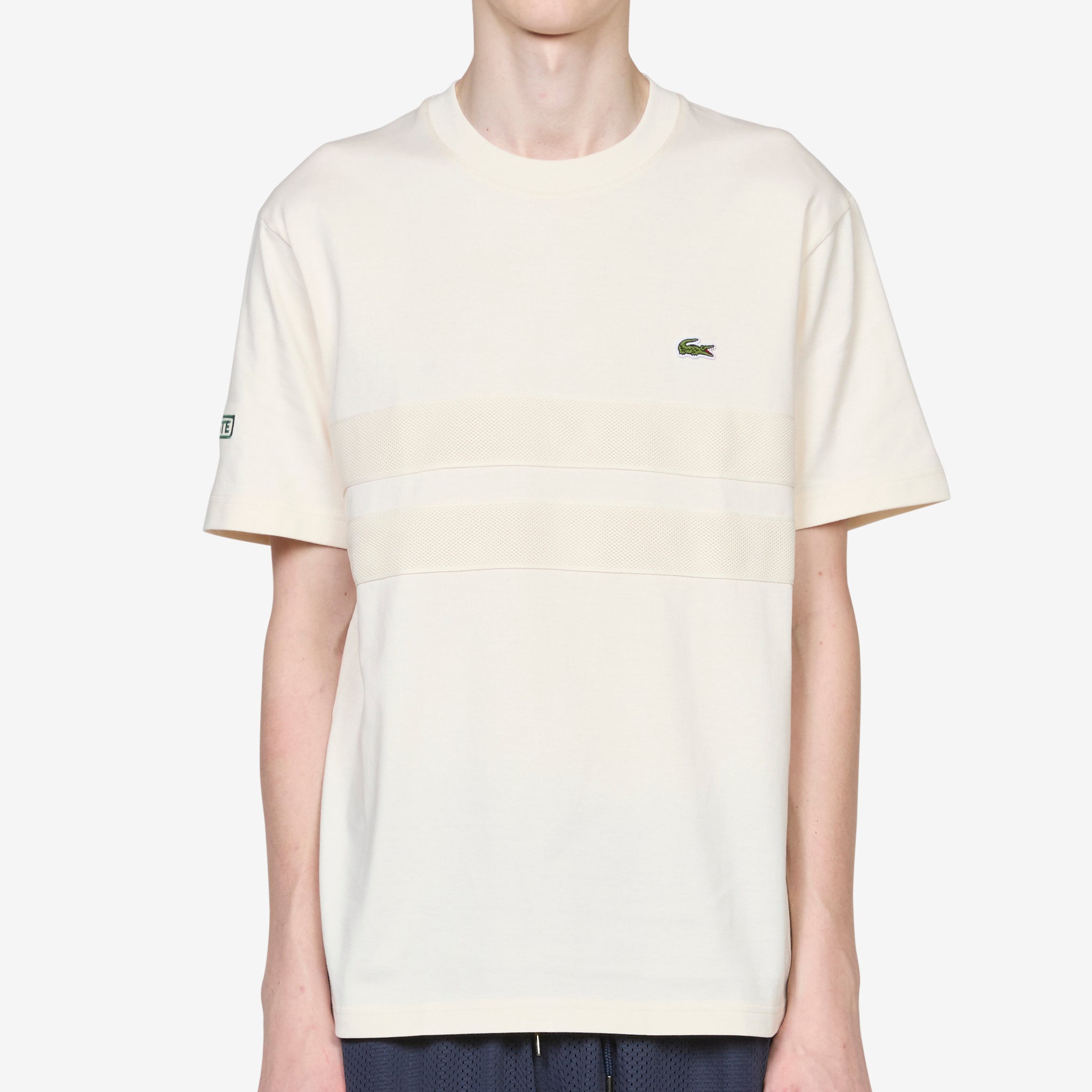 Tennis Heritage Heavy Jersey T-Shirt in Lapland from Lacoste. Classic fit crewneck t-shirt crafted from heavy organic cotton jersey. Mesh stripe detail across chest. Finished with Lacoste embroidery on sleeve and sewn- on crocodile on chest.