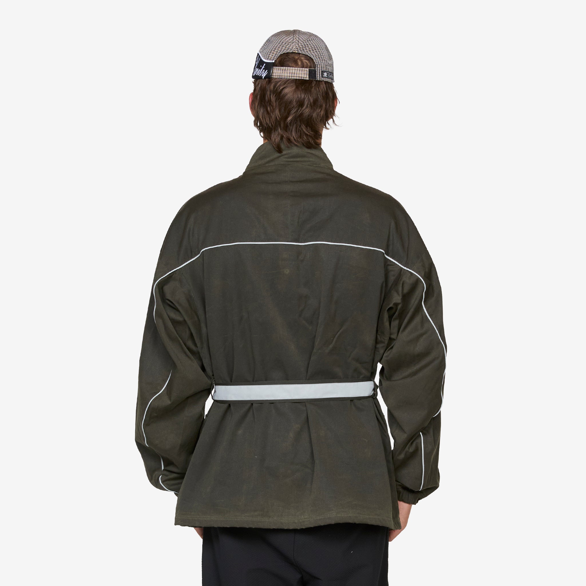 Trainer Waxed Jacket in Dark Olive from Umbro. Relaxed fit jacket crafted with a waxed cotton fabric for water-repellent protection. Features adjustable reflective waist belt, two front flap pockets, elasticated cuffs and classic tartan lining. Finished with embroidered logo and contrasting piping.