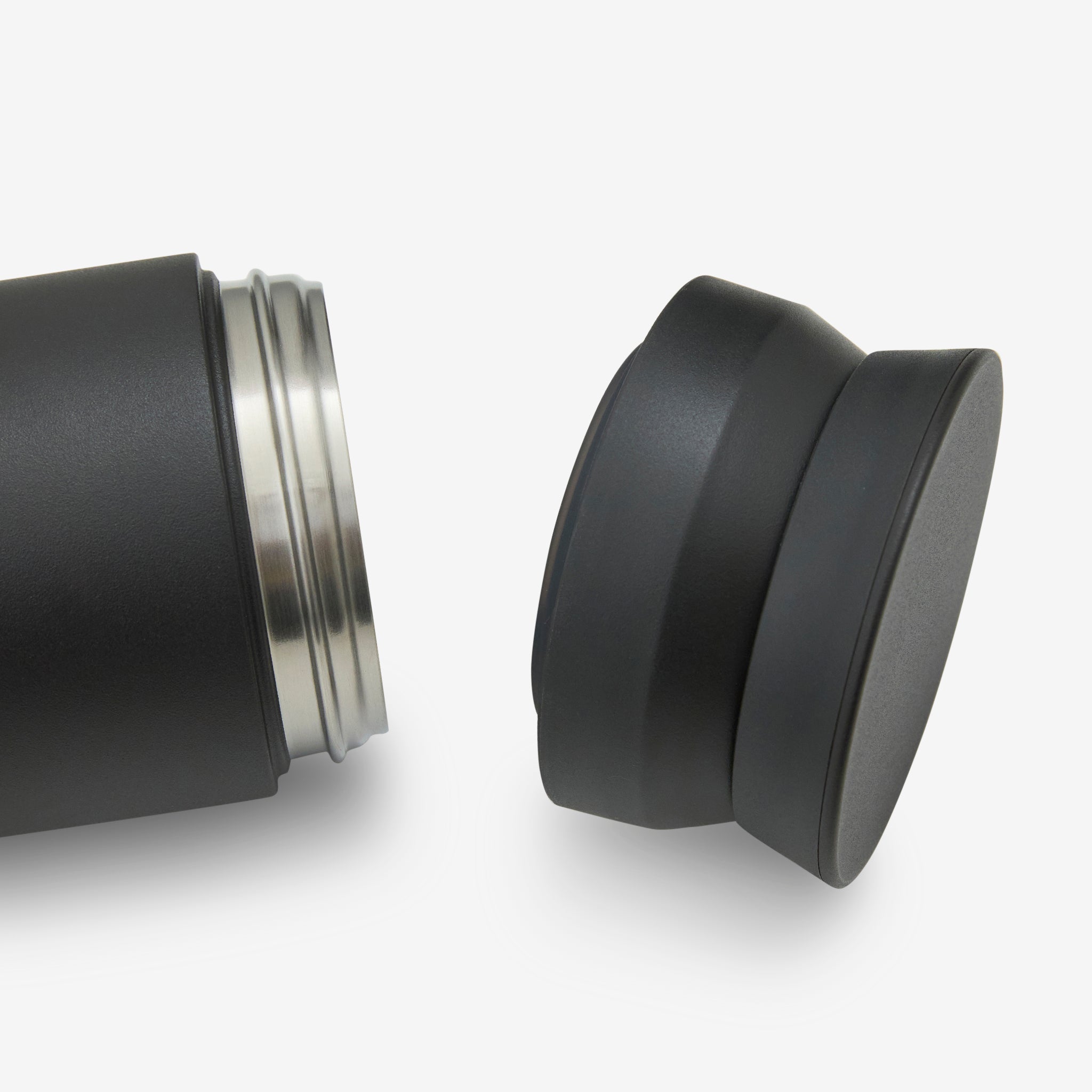 Travel Tumbler 500ml in Black from Kinto. The minimal design of the cap makes it easy to drink from any angle and is designed to catch ice cubes and maintain a smooth flow for hot drinks. This tumbler is vacuum insulated to prevent heat transfer, keeping drinks hot (69℃) or cold (7℃) for 6hrs. The high quality stainless steel preserves the flavour of your drinks whilst the smooth electro-polished interior prevents stains.