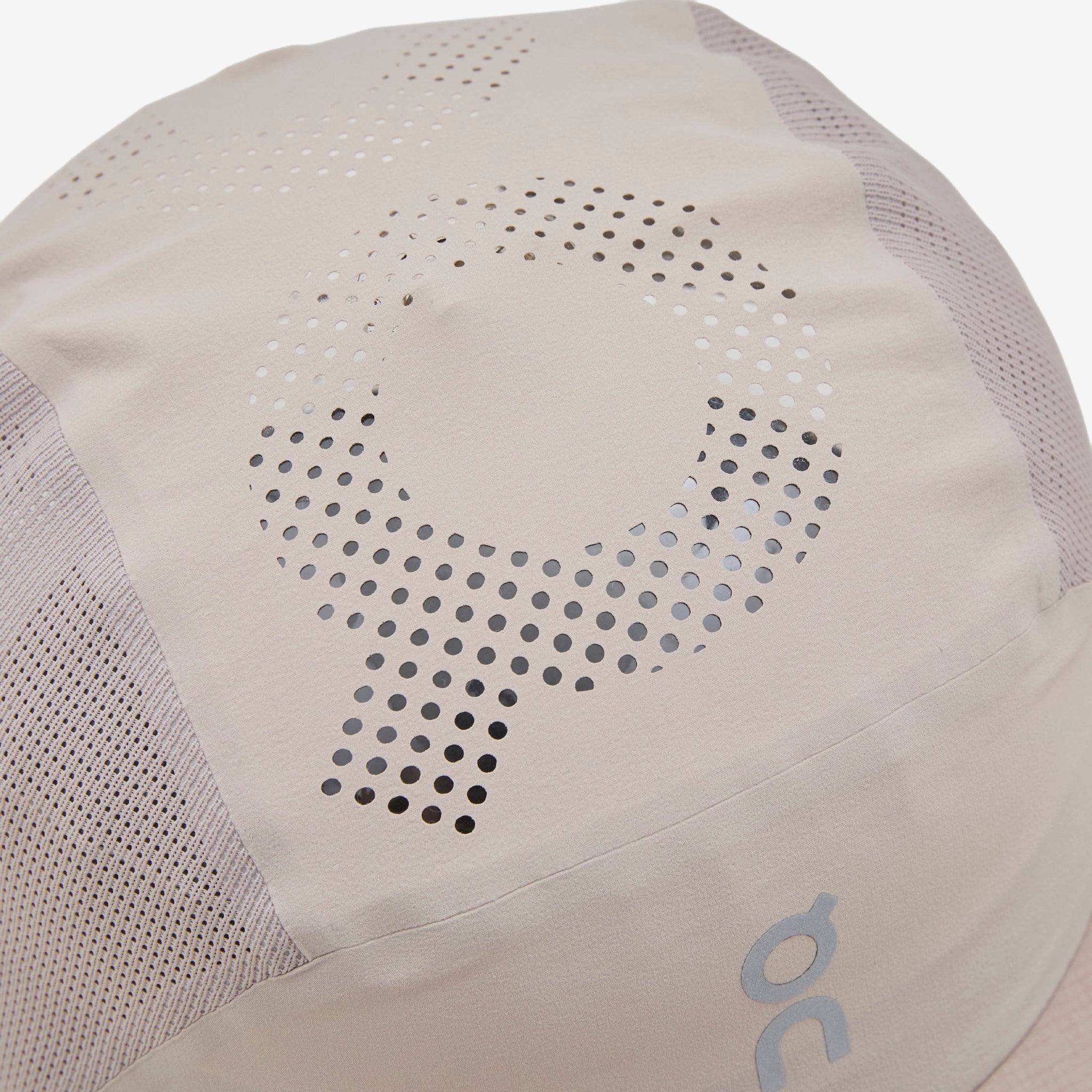 Ultra Cap in Fog from On. Ultra-lightweight 4-panel cap with a soft flat brim, quick-drying interior sweatband and toggle-adjustable backstrap. Crafted from a recycled polyamid blend with laser perforation and mesh side panels for maximum breathability. Finished with printed branding at the front.