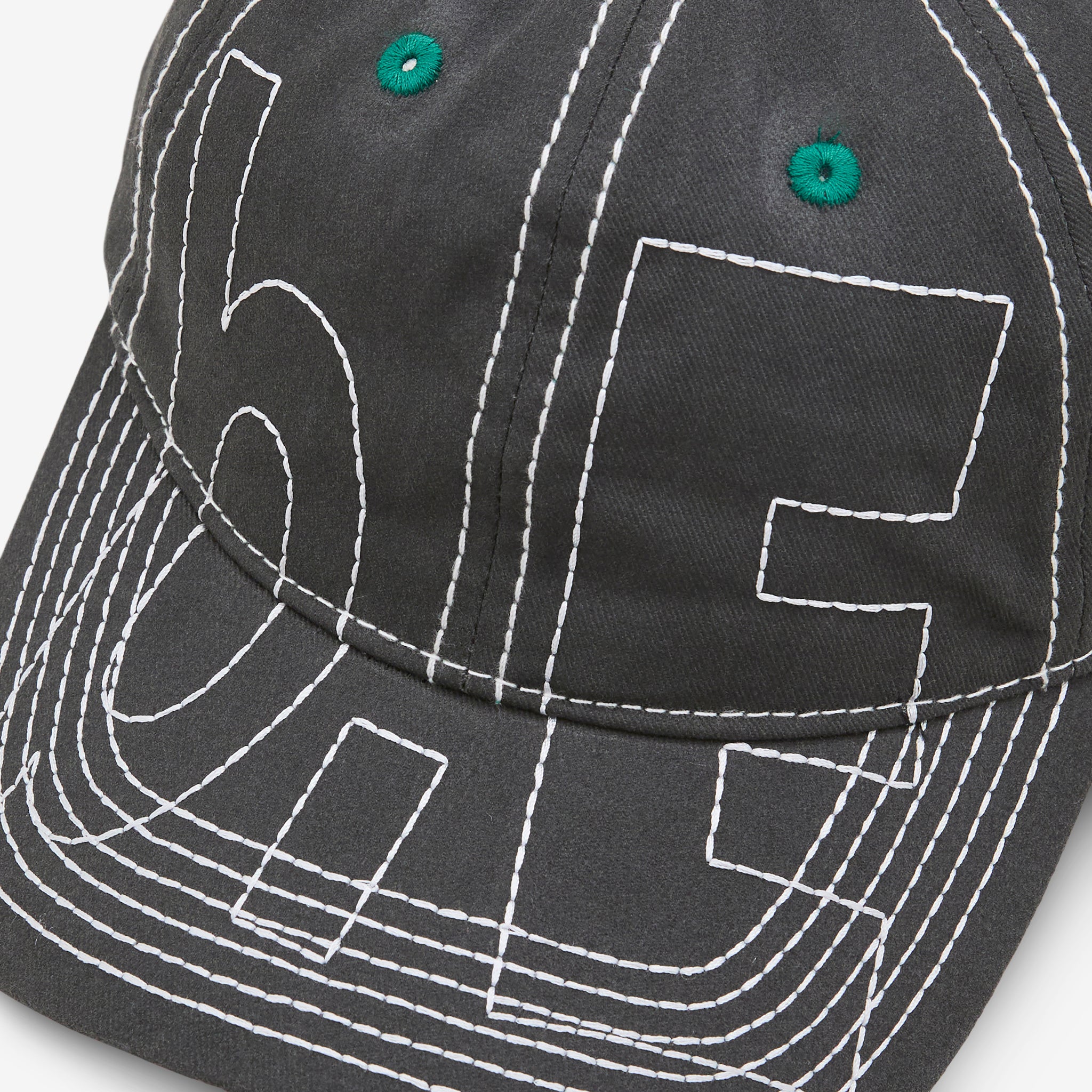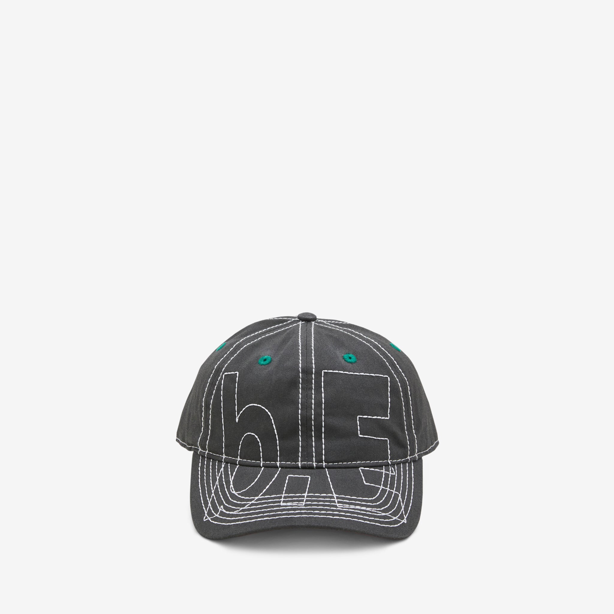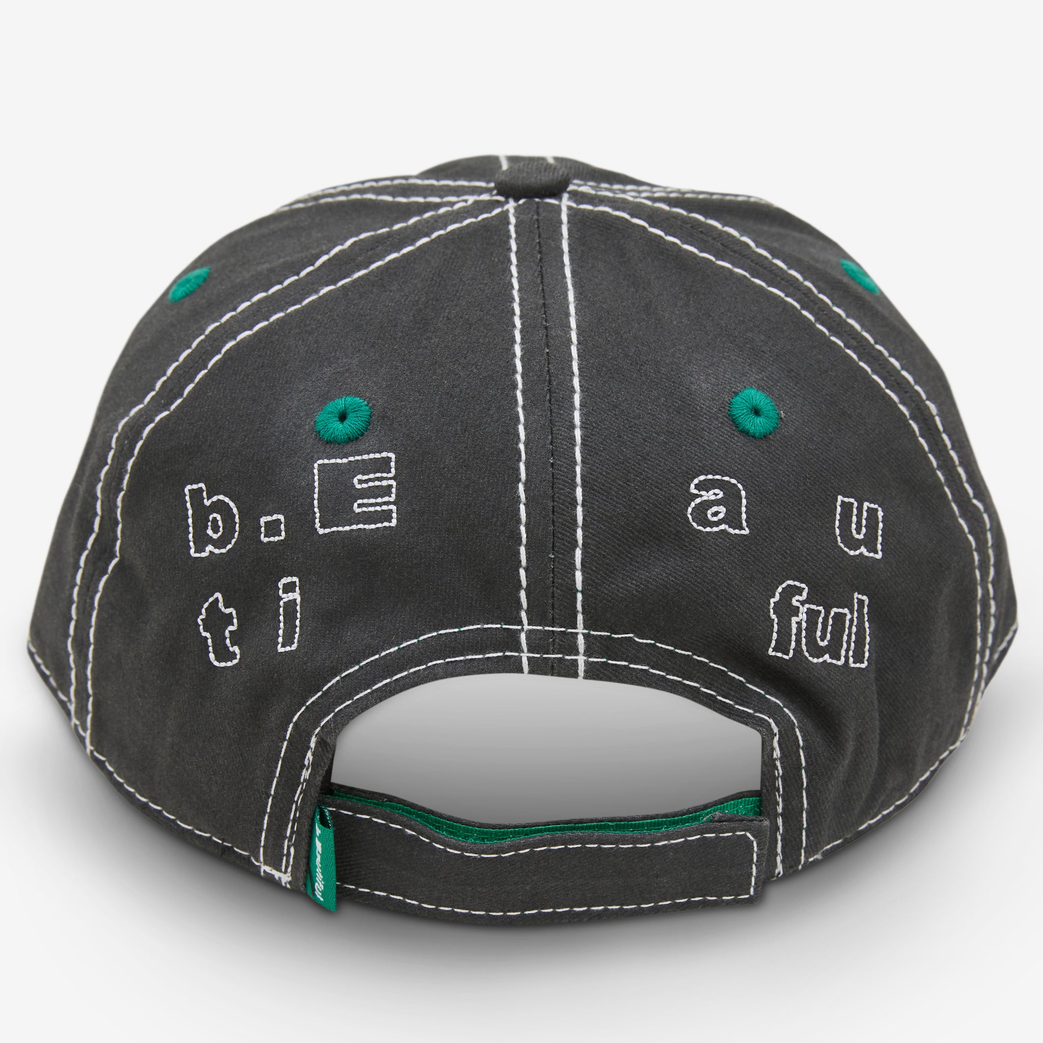 Vapor 6 Panel Hat in Off-Black and White from b.Eautiful. 6-panel hat with a low crown silhouette, contrast embroidered eyelets and velcro-adjustable back strap. Crafted from cotton and finished with contrast embroidered branding throughout.