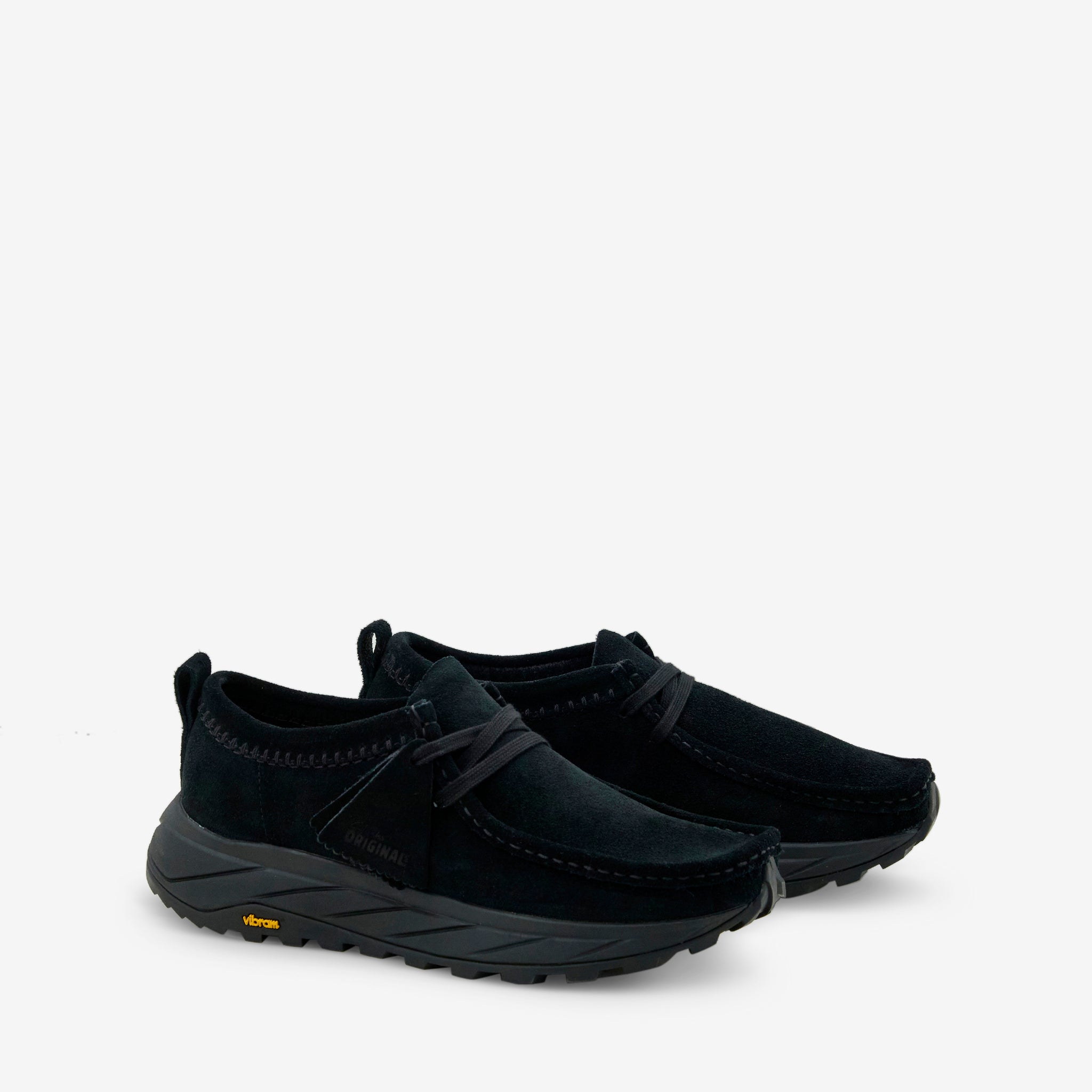 Men's Walla Eden Lo in Black and Black Suede from Clarks. A low-cut alternative to the Wallabe Eden featuring a soft suede moccasin upper with decorative blanket stitching at the collar. Durable Vibram® sole provides improved traction. Finished with two suede Clarks fobs.
