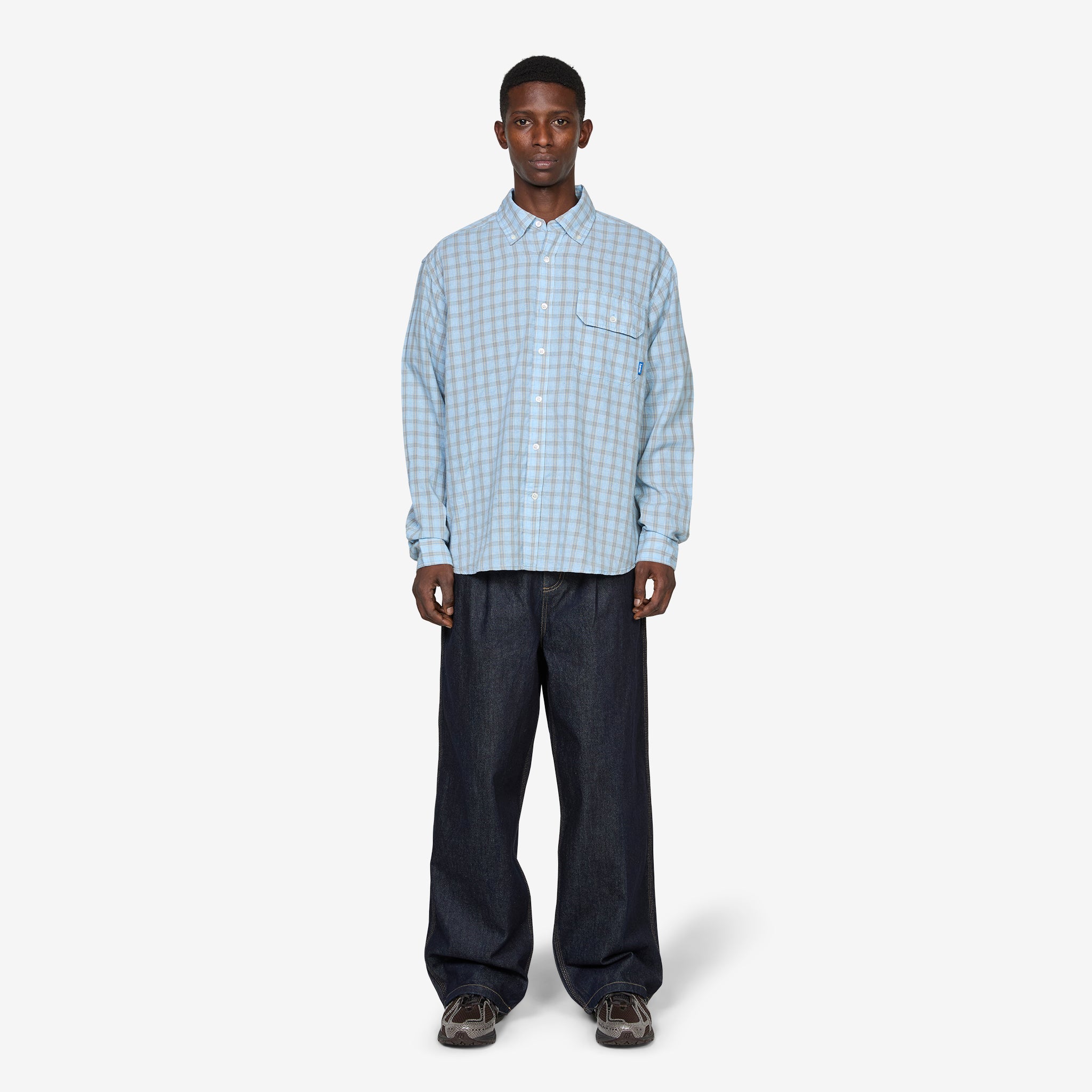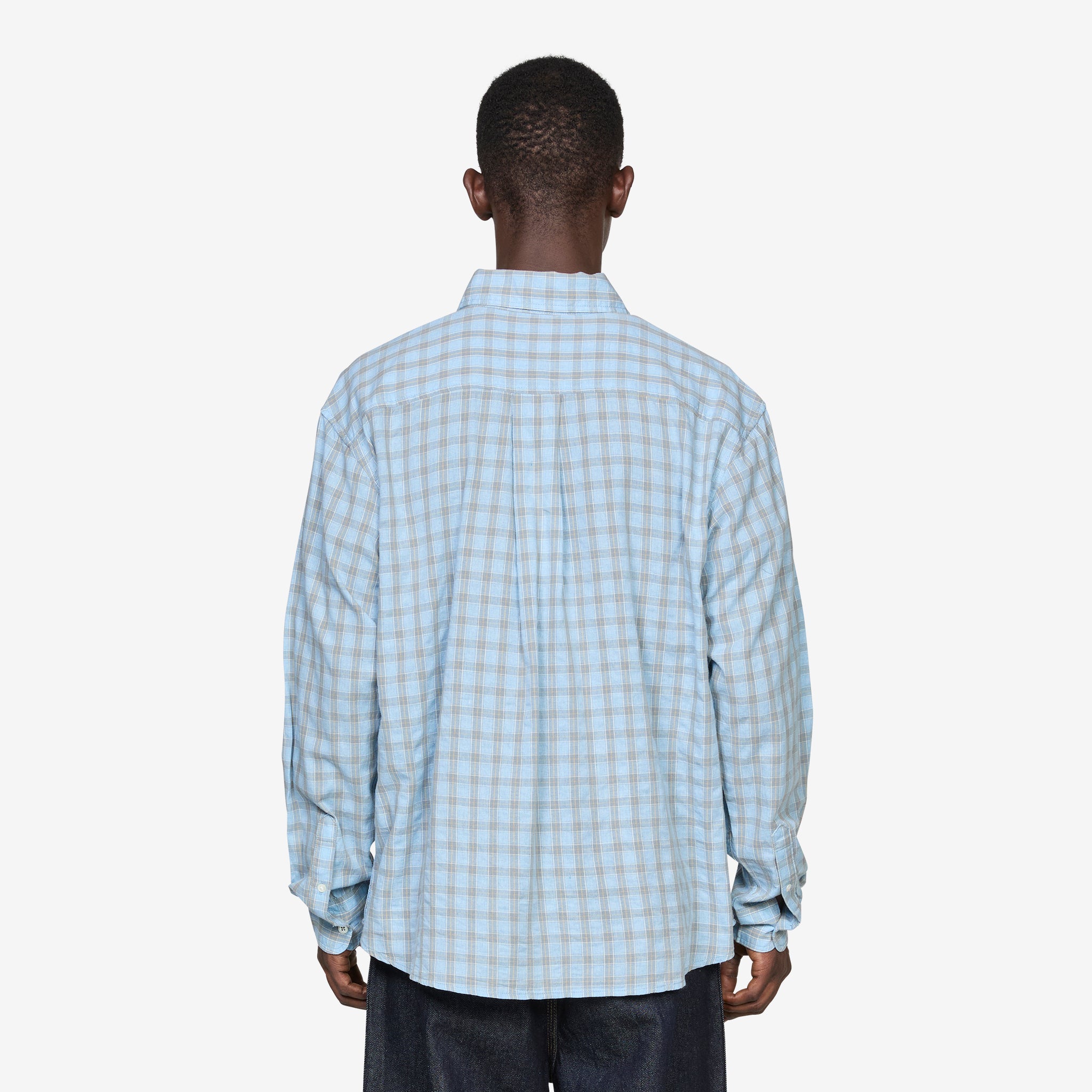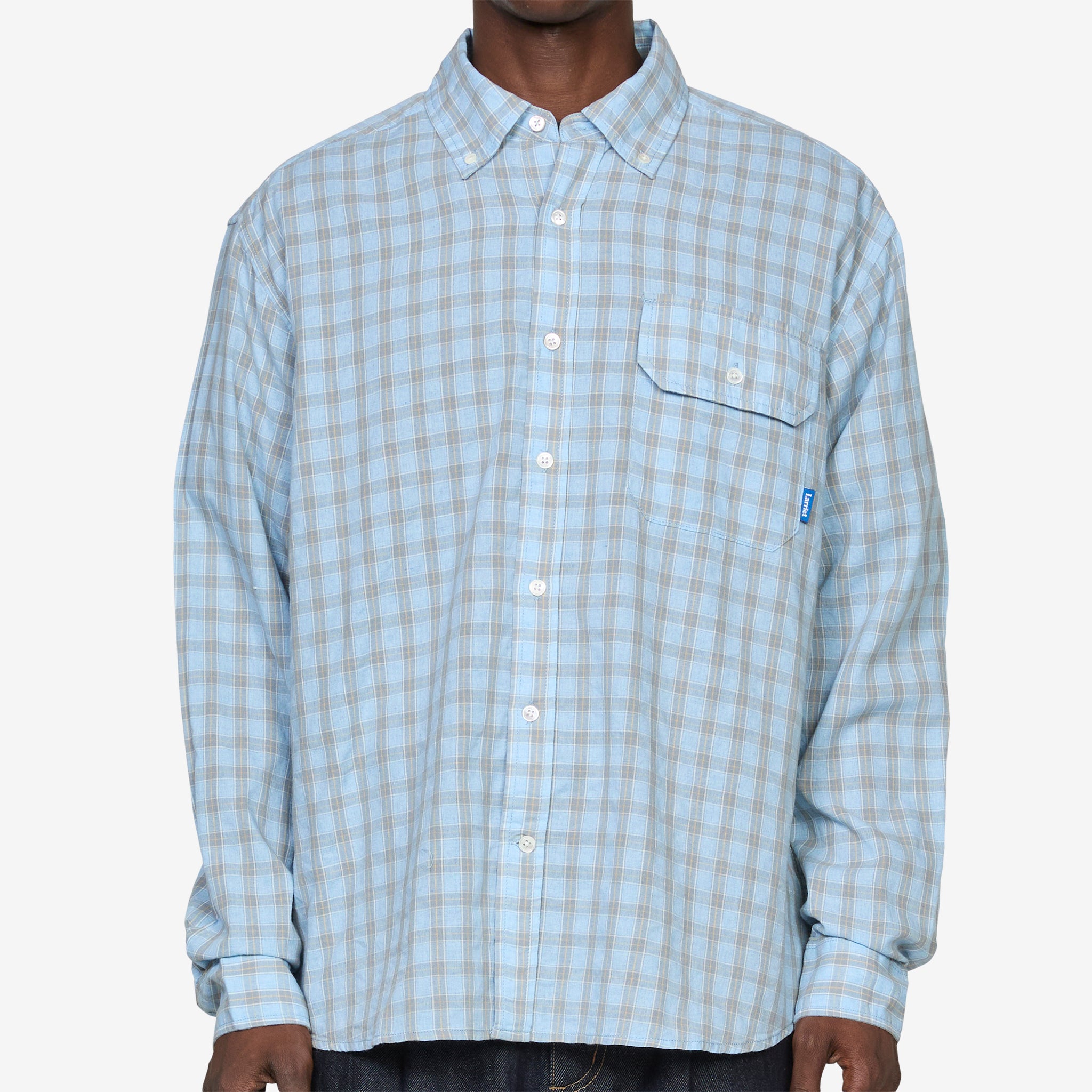 Weisner Shirt in Rain Plaid from Larriet. Relaxed shirt with a traditional button-down stand collar, slightly curved hem and full button closure. Crafted from a breathable cotton plaid fabric. Finished with a flap-closure pocket and woven brand label at the chest.