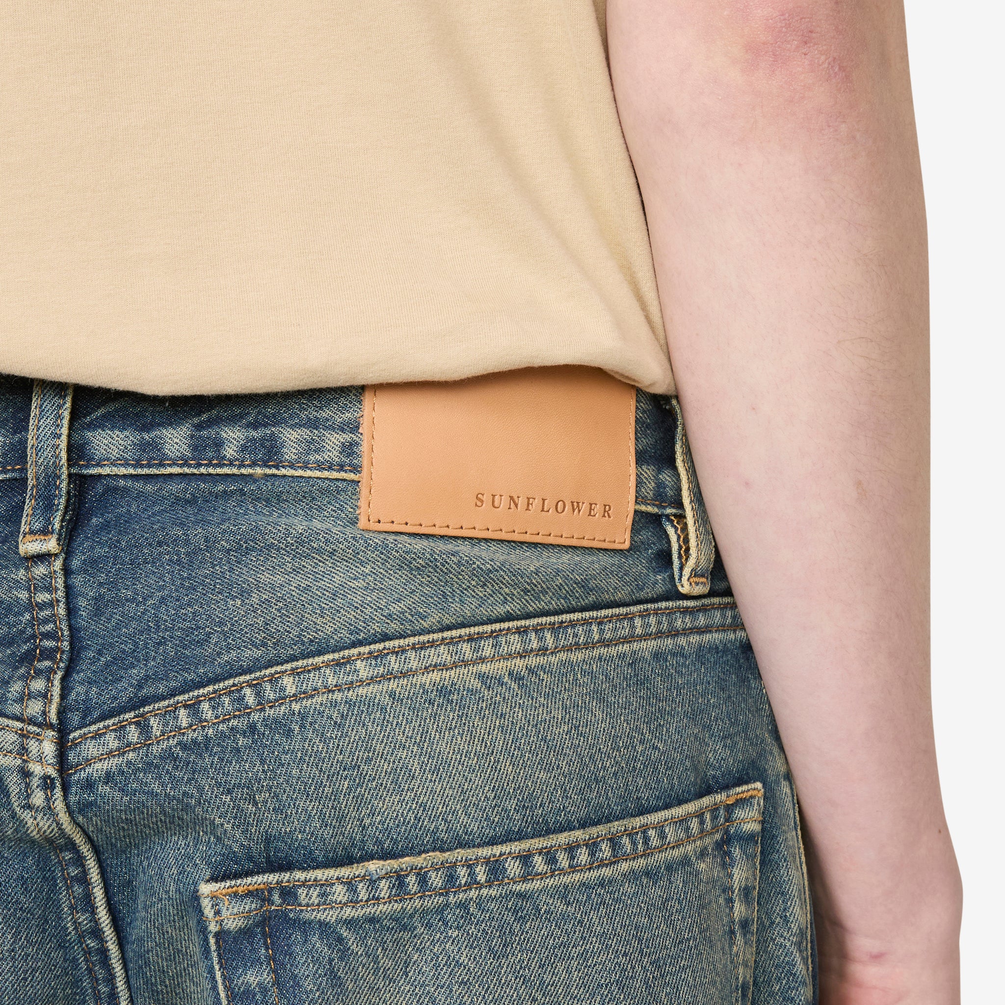Wide Twist Jeans in Dirty Blue from Sunflower. Relaxed cut jeans in a loose, wide leg silhouette with a belt loop waistband and signature twisted outseam detailing. Crafted from a 14.5oz organic Italian denim which has been washed with a dirty tint for a vintage look and feel. Finished with recycled metal trims and a branded jacron at the rear waistband.