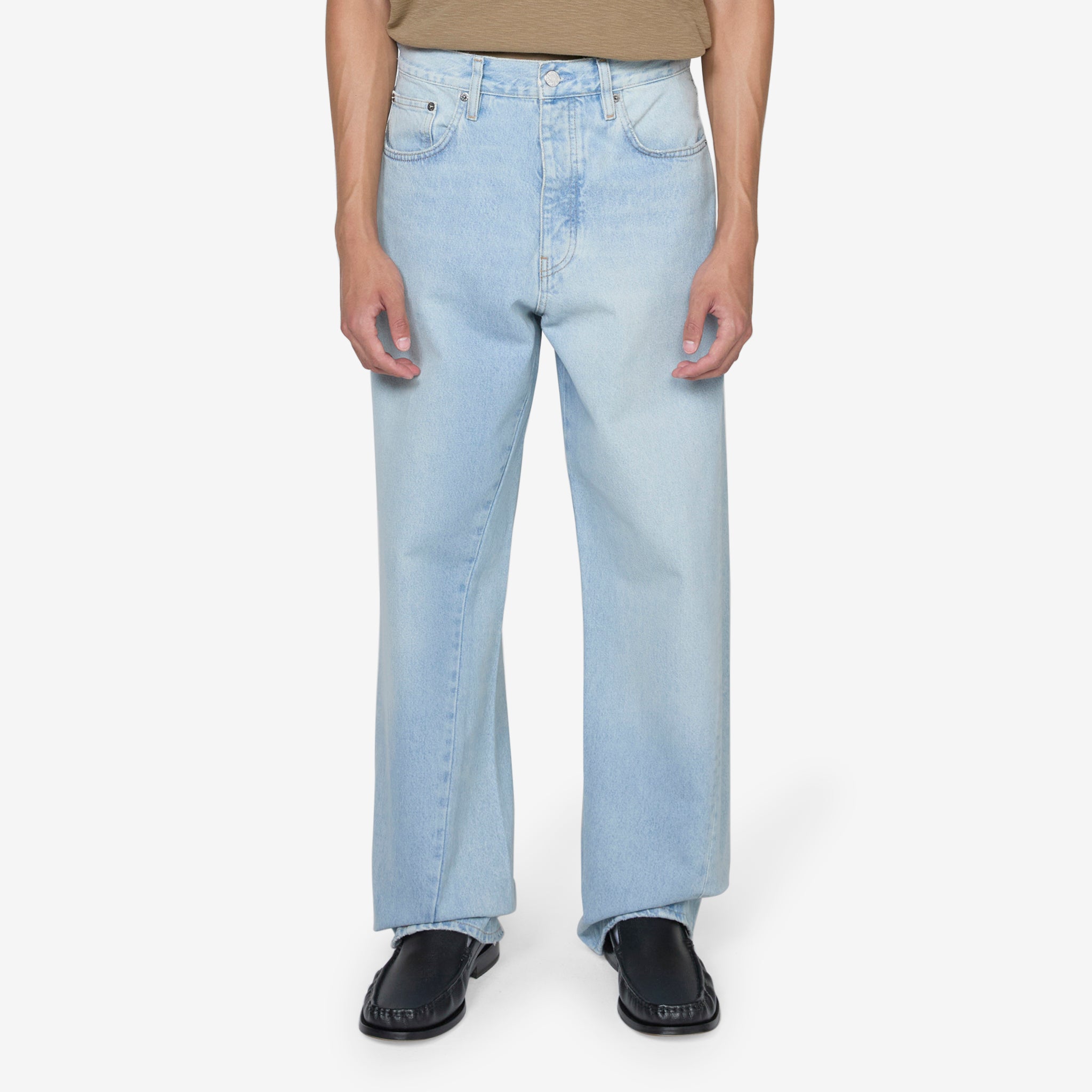 Wide Twist Jeans in Light Vintage from Sunflower. Wide-fit jeans with 5-pocket construction, a belt loop waistband and twisted seam details. Crafted from a 13.5oz washed-down indigo denim and finished with a branded leather jacron at the rear waistband.