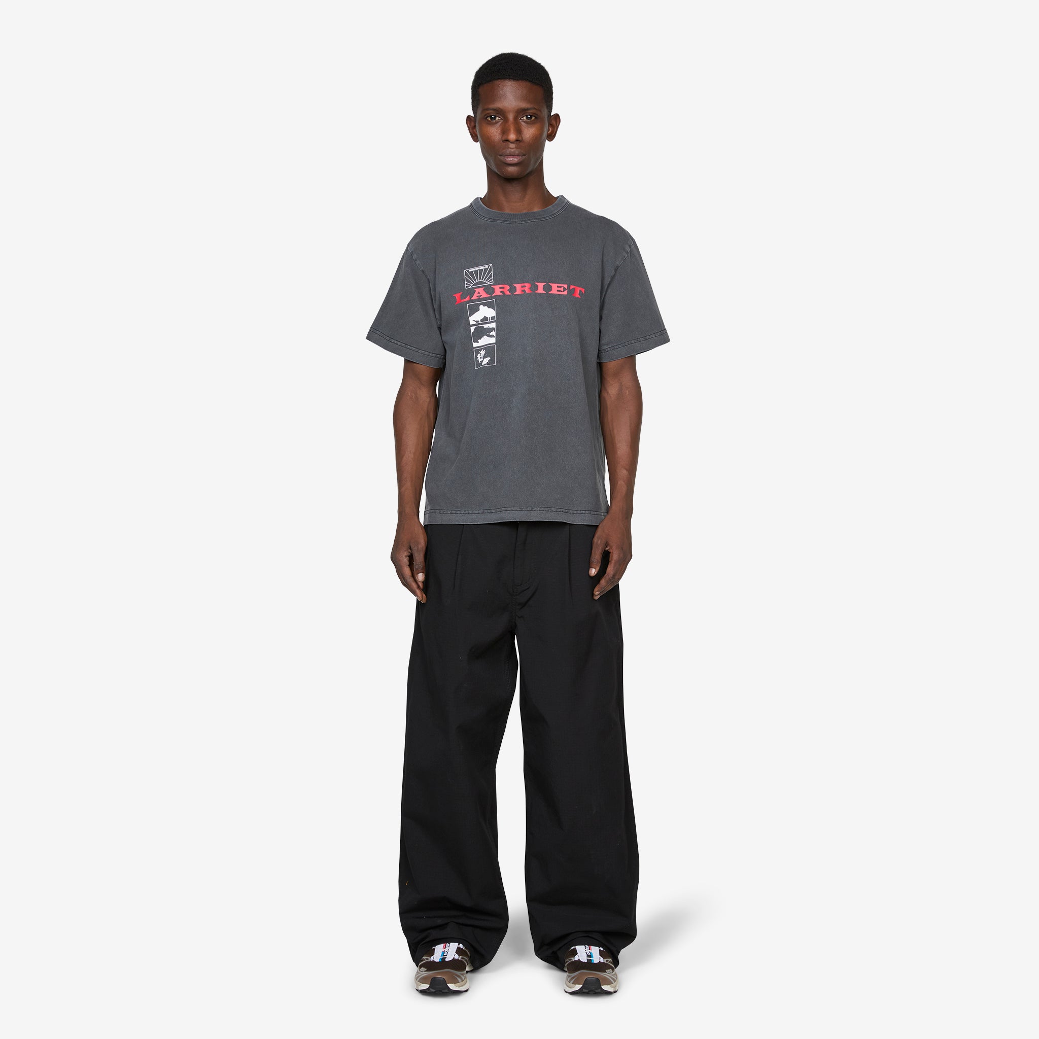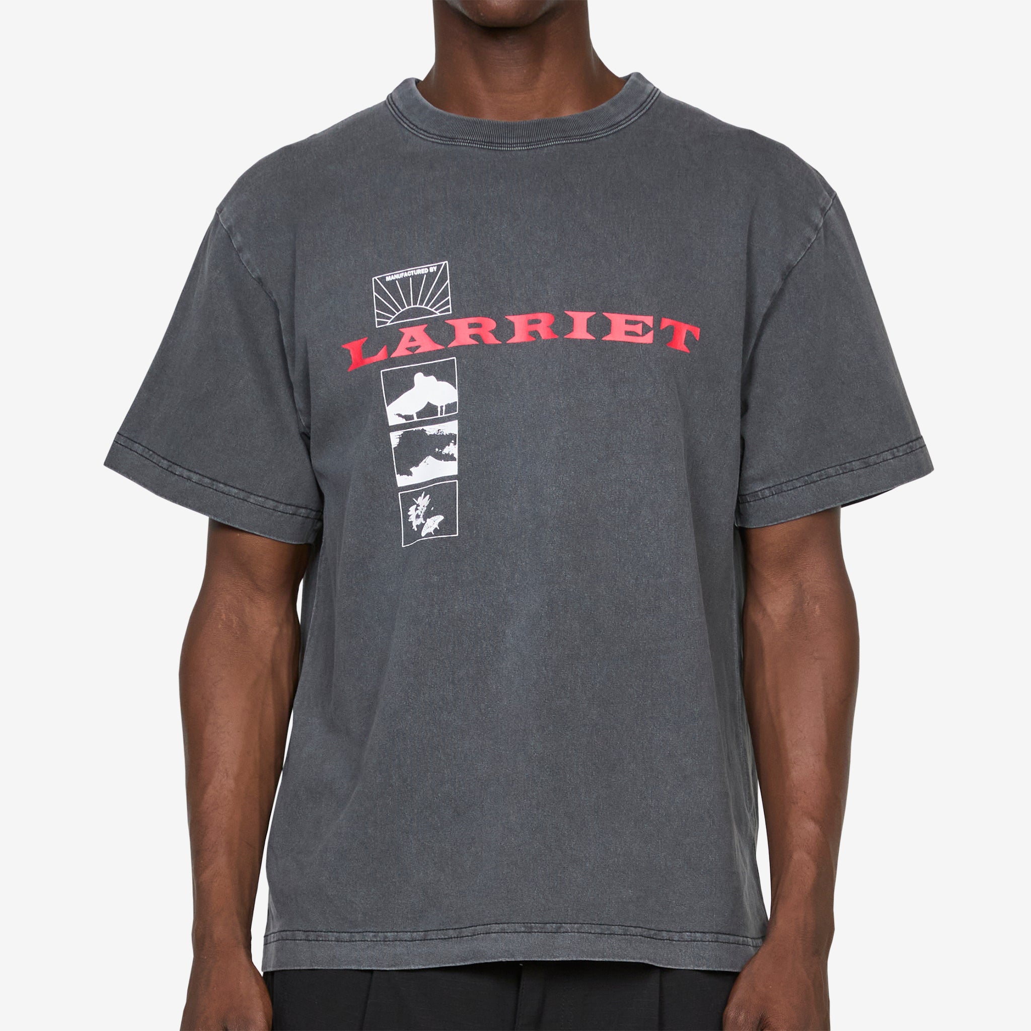 Wings T-Shirt in Used Black from Larriet. Relaxed fit t-shirt with a ribbed crew neckline, interior shoulder taping and a twin-need-stitched hem and sleeves. Crafted from a pigment-dyed, hard-wearing cotton jersey which has been pre-shrunk to maintain its shape. Finished with a printed graphic at the chest.