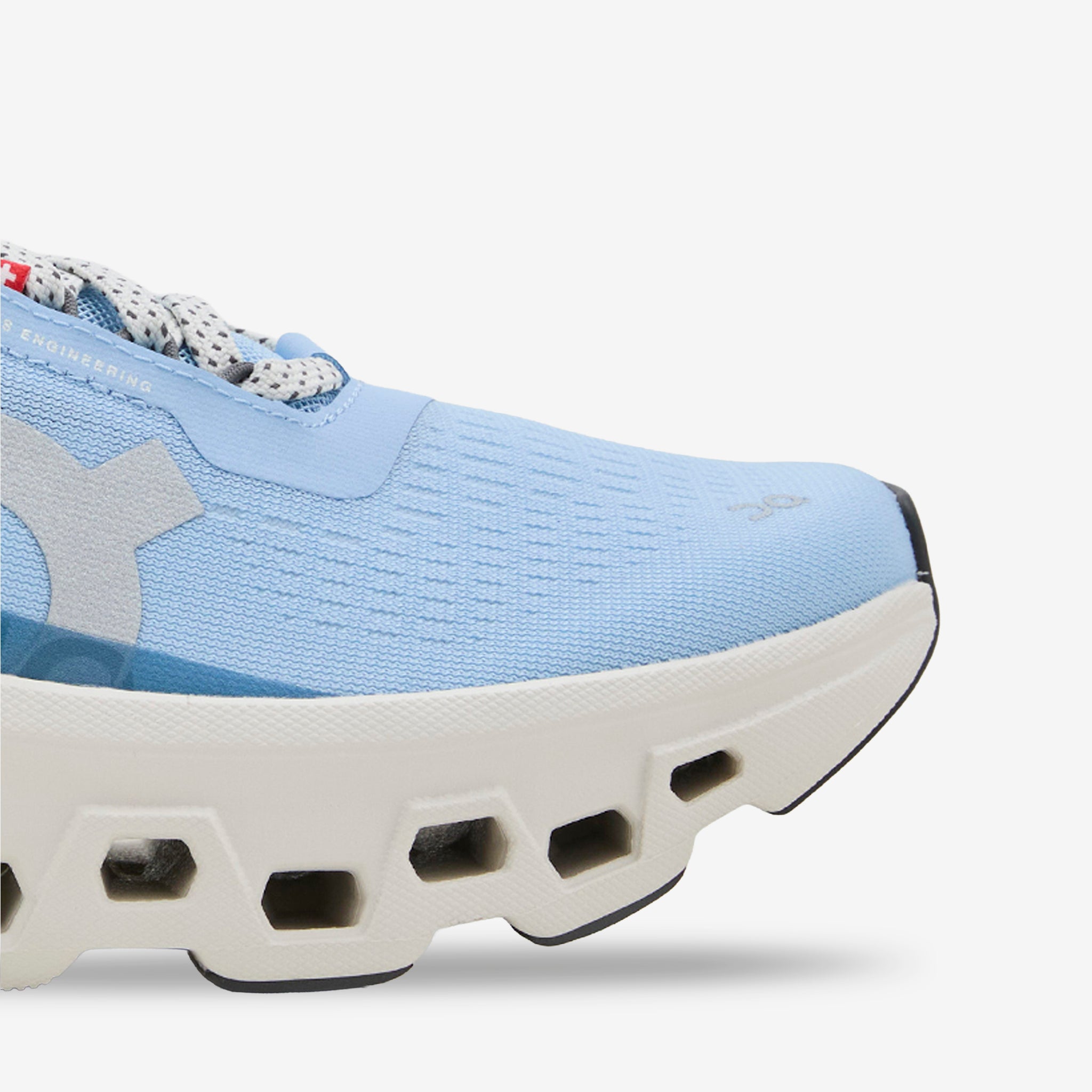 Women's Cloudmonster 1 in Cerulean and Ice from On. A reimagined version of the classic Cloudmonster, reimagined for everyday style and comfort. Recycled polyester upper featured supportive TPU overlays and hidden eyelets for a clean aesthetic. CloudTec® cushioning system is engineered for all-day wear with a Speedboard® for added spring. Finished with Helion™ foam and a rubber outsole for impact absorption and traction.