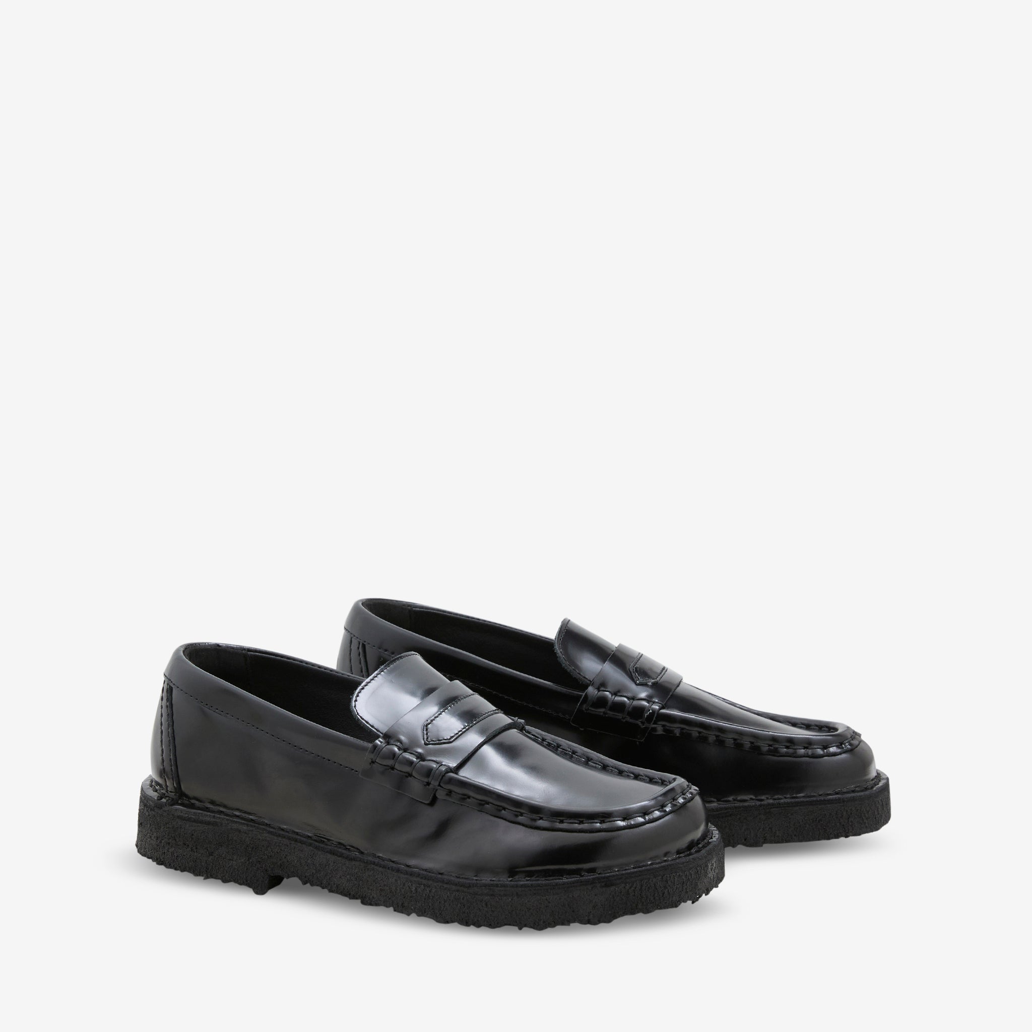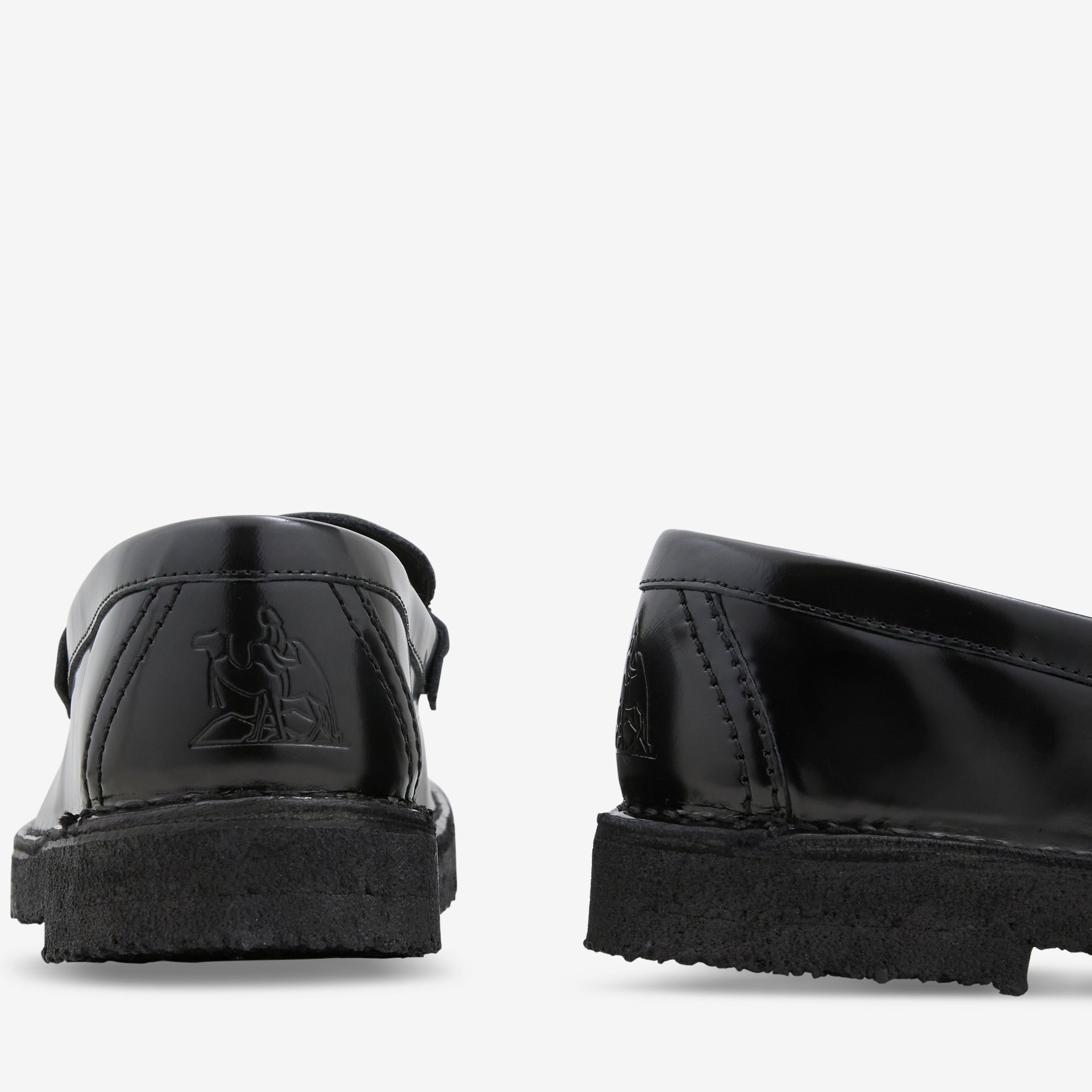 Women's Nomad Loafer in Patent Black from Clarks. Patent black leather upper featuring hand-stitched apron seams and a wider Trek shape. Amber pebble crepe sole. Camel Trek Man logo embossed onto heel counter. Finished with Clarks Originals metallic foil heat-embossed logo on the sock.