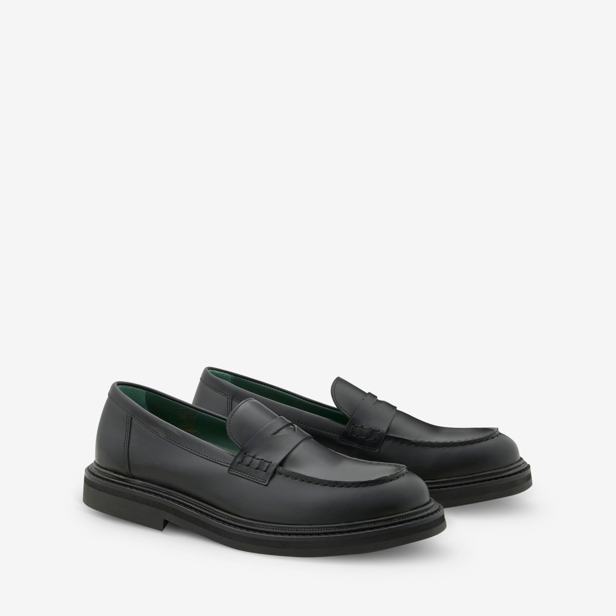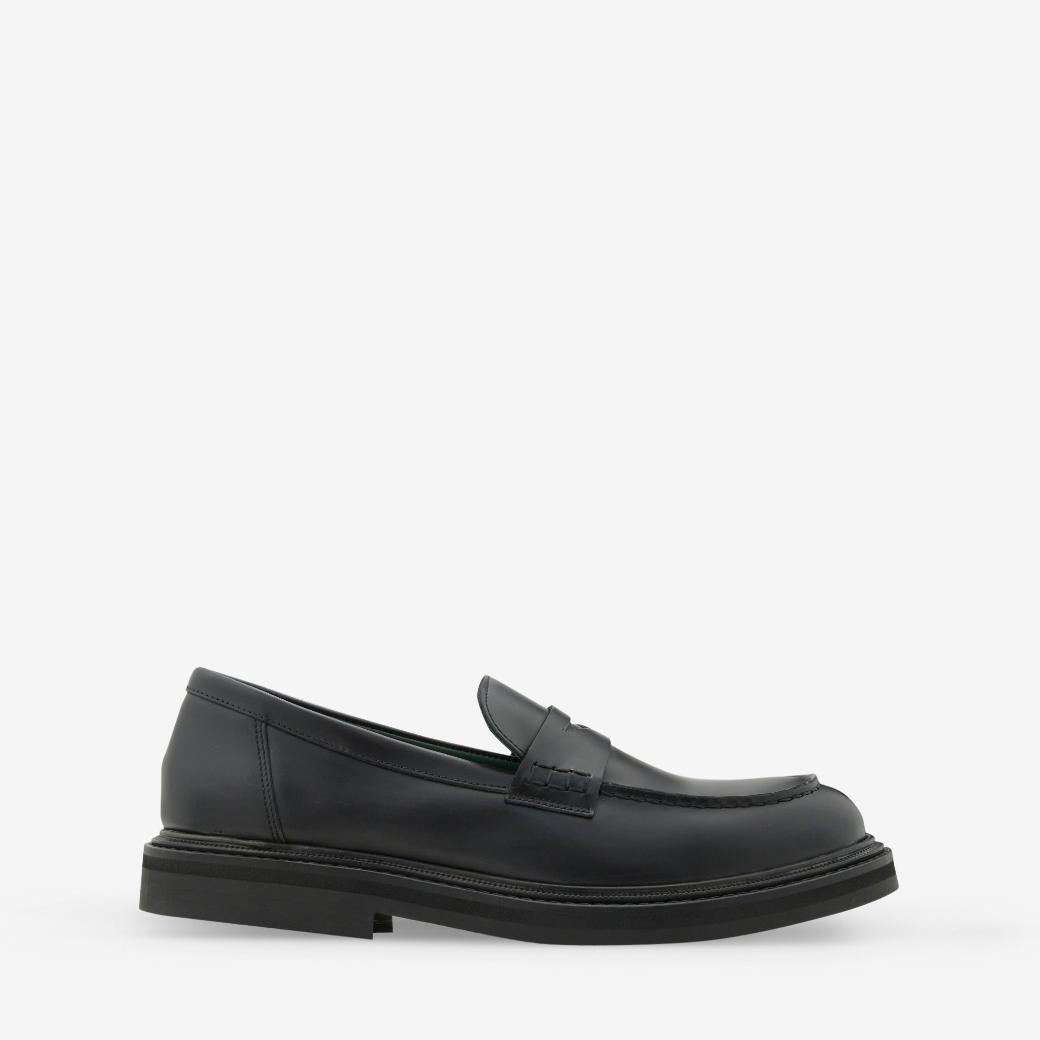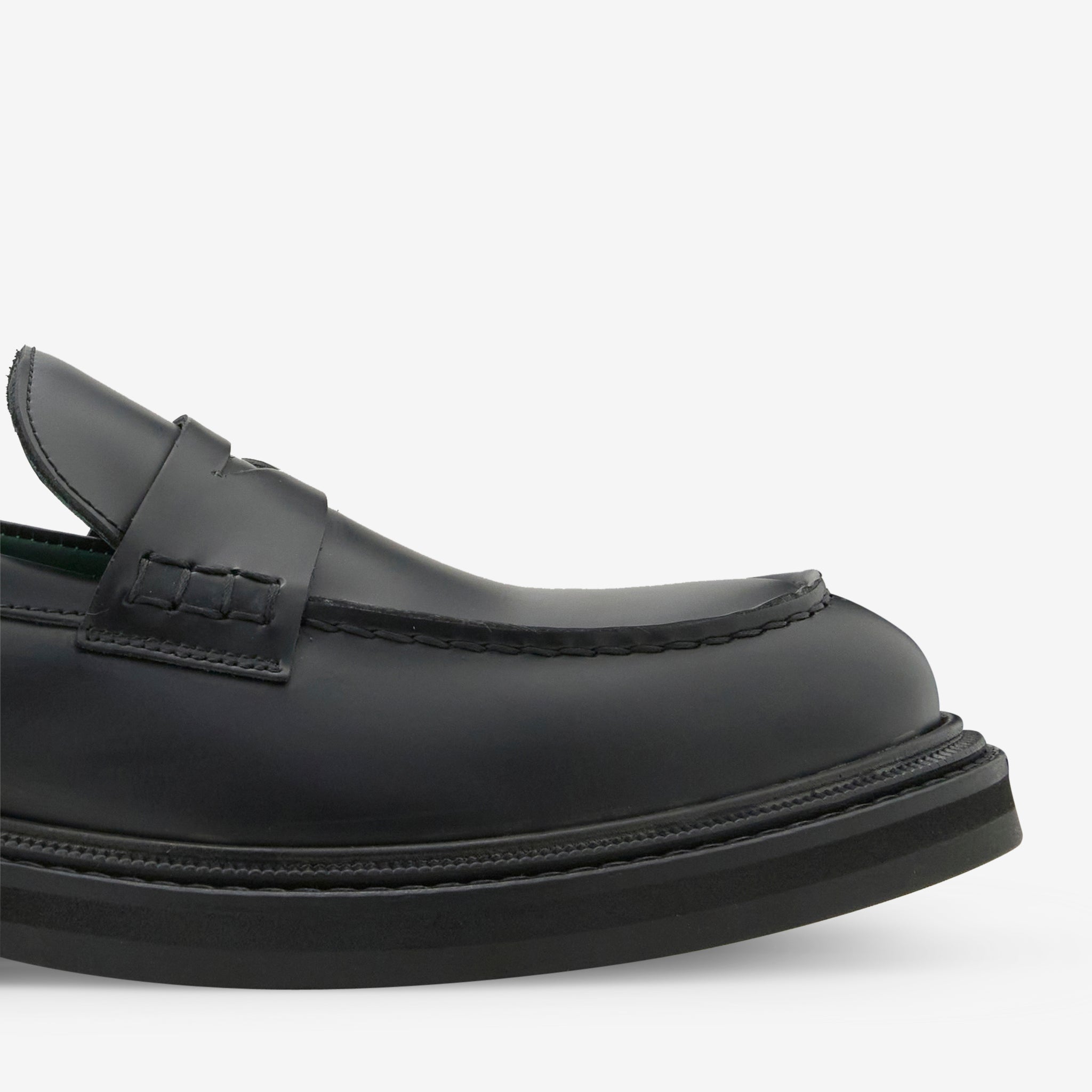 Women's Vinnee Penny Loafer in Black Polido Leather from VINNY's. Hand crafted in Portugal with a wide-fitting full Polido leather upper on a cushioned footbed.