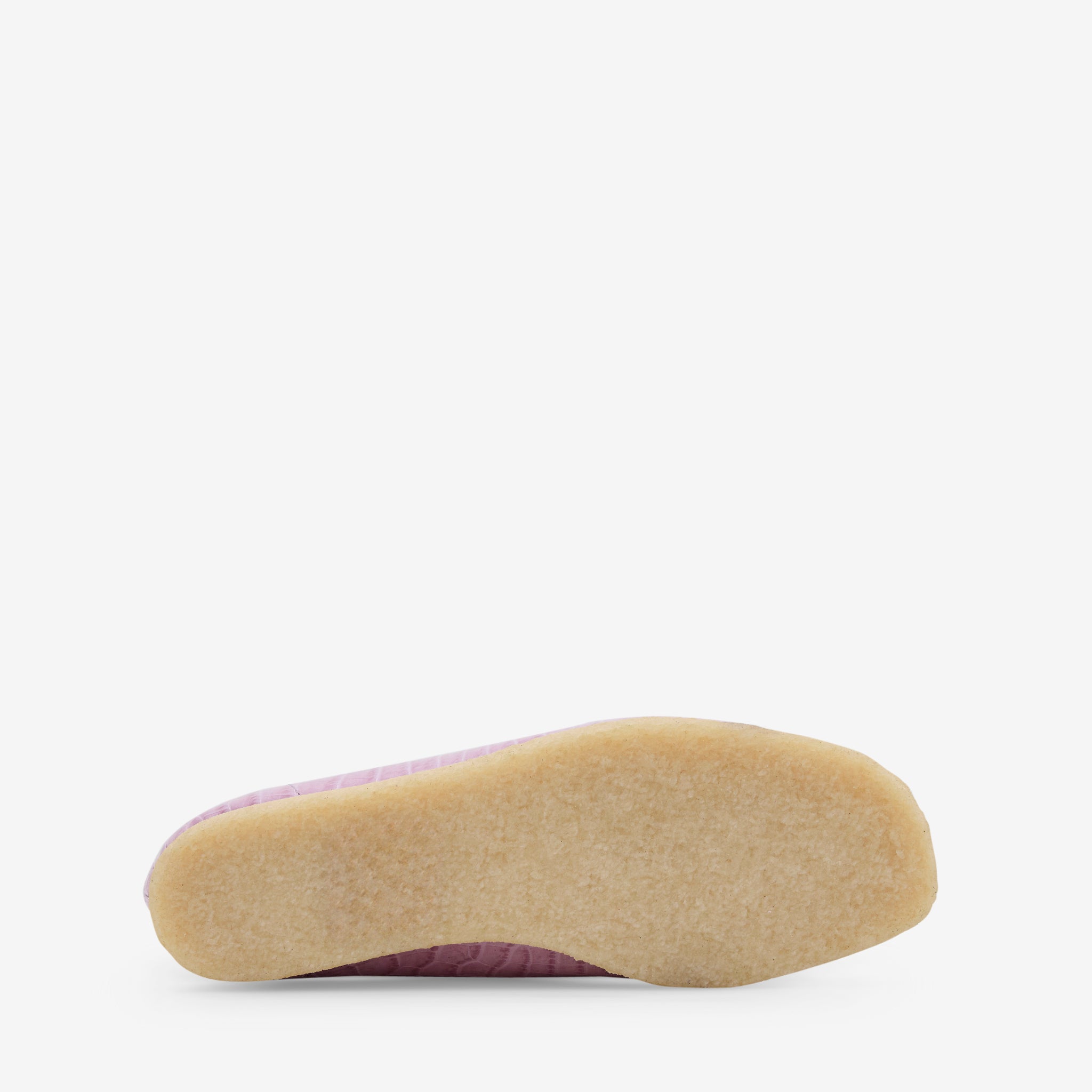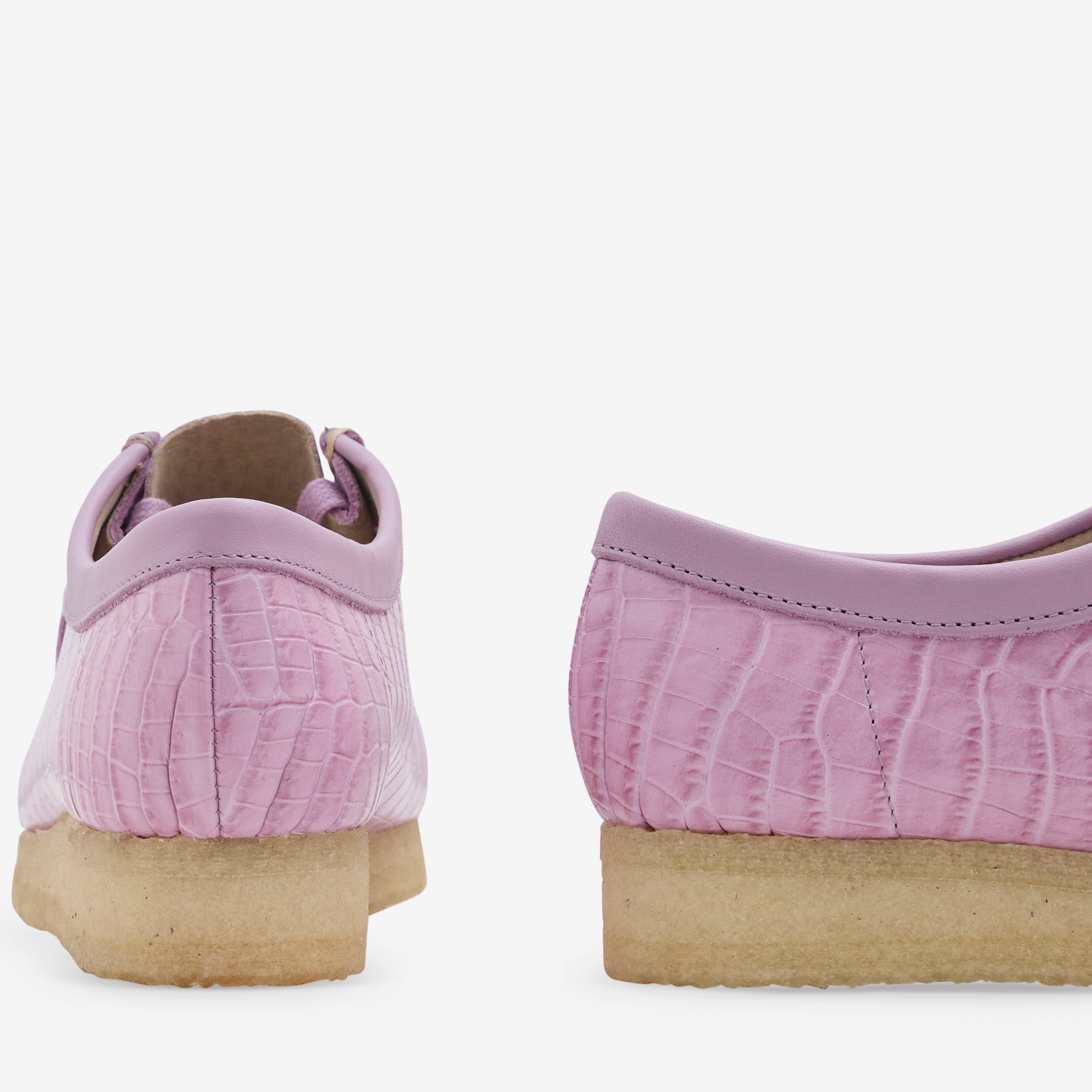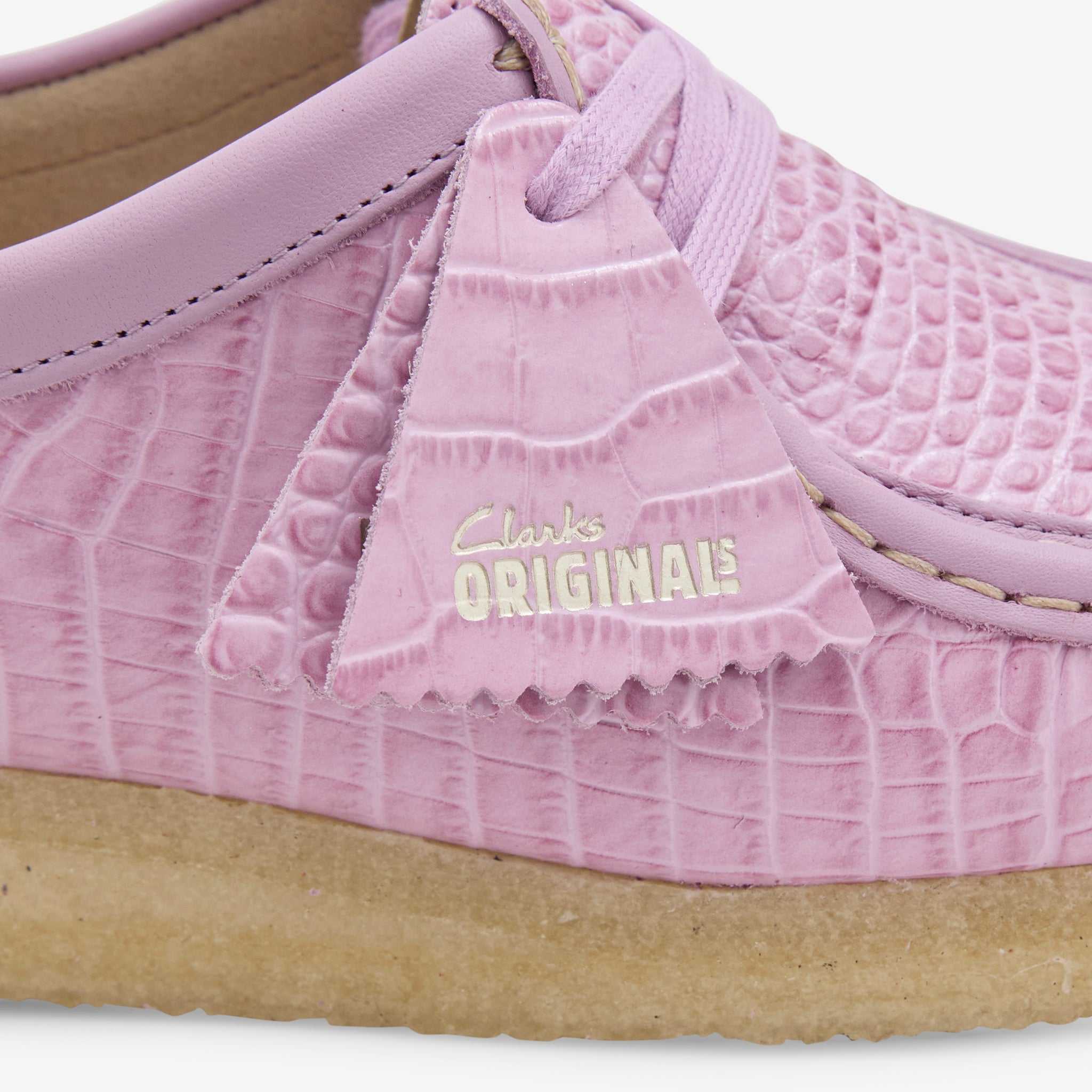 Women's Wallabee in Mauve Croc from Clarks. Premium croc-effect leather upper with heritage stitching and a signature natural rubber pebble crepe sole and tonal Clarks Originals fobs. Finished with metallic foil branding at the footbed and fobs.