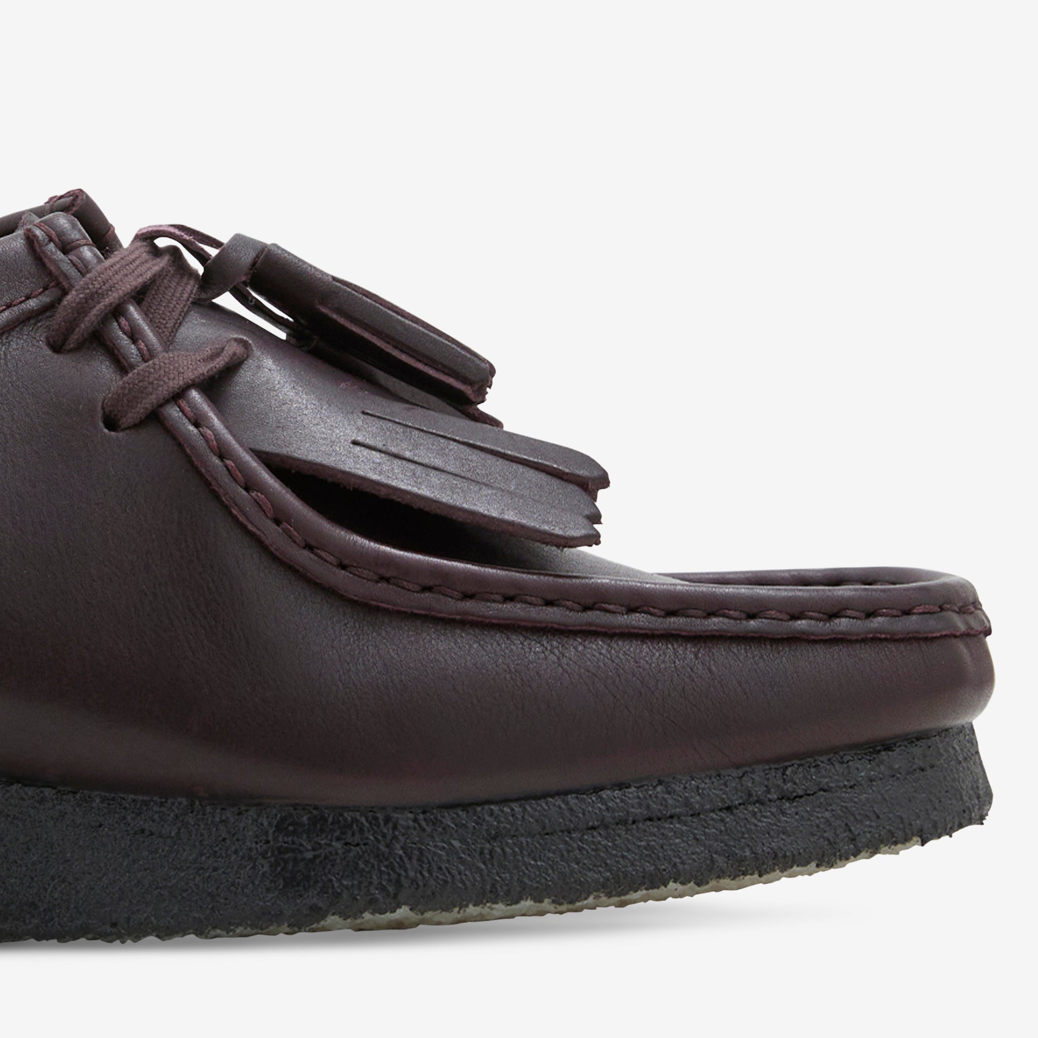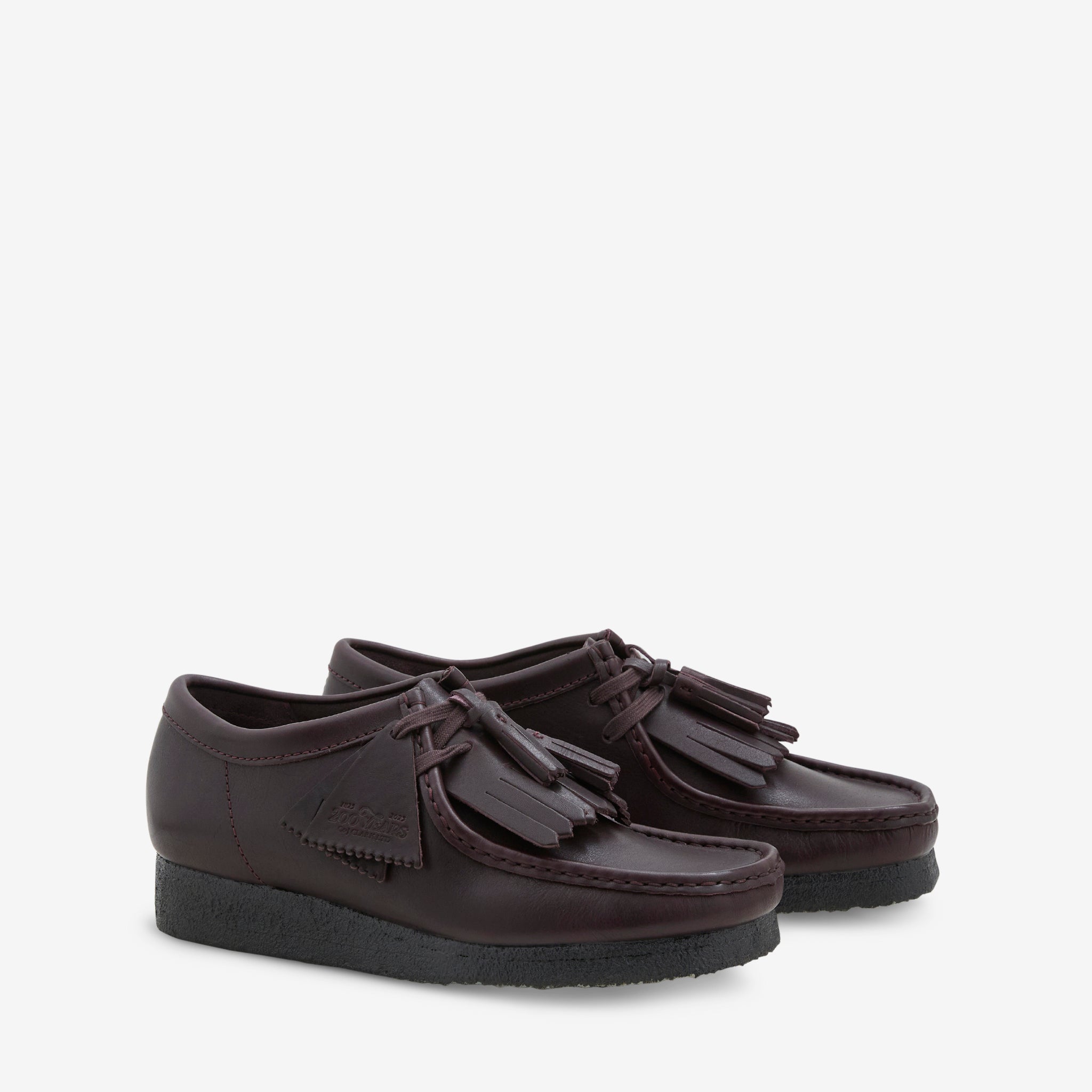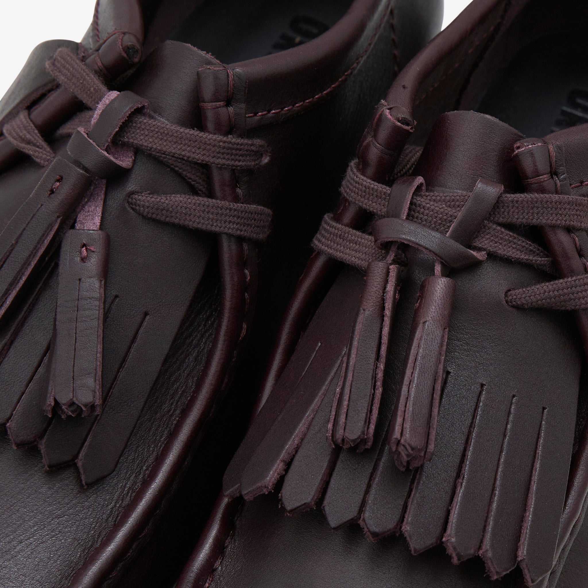 Women's Wallabee in Purple Grape from Clarks. Dress-polished leather upper featuring removable lace tassels and a tonal kiltie. Natural pebble crepe sole with tonal black spray. Moccasin construction with hand-stitched apron seam. Finished with Clarks Originals heat-embossed logo on the sock and three fobs, including a special 200-year anniversary edition fob.