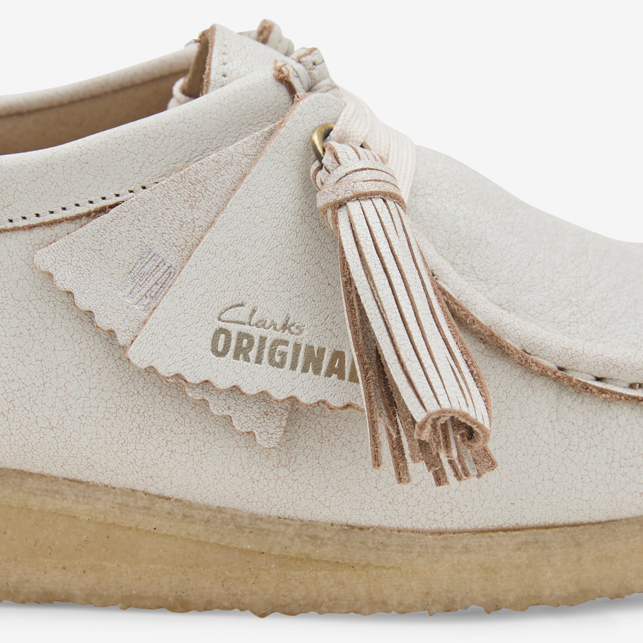 Women's Wallabee in White Leather from Clarks. Premium overdyed leather upper with heritage stitching and a signature natural rubber pebble crepe sole and tonal Clarks Originals fobs. Finished with metallic foil branding at the footbed and fobs.