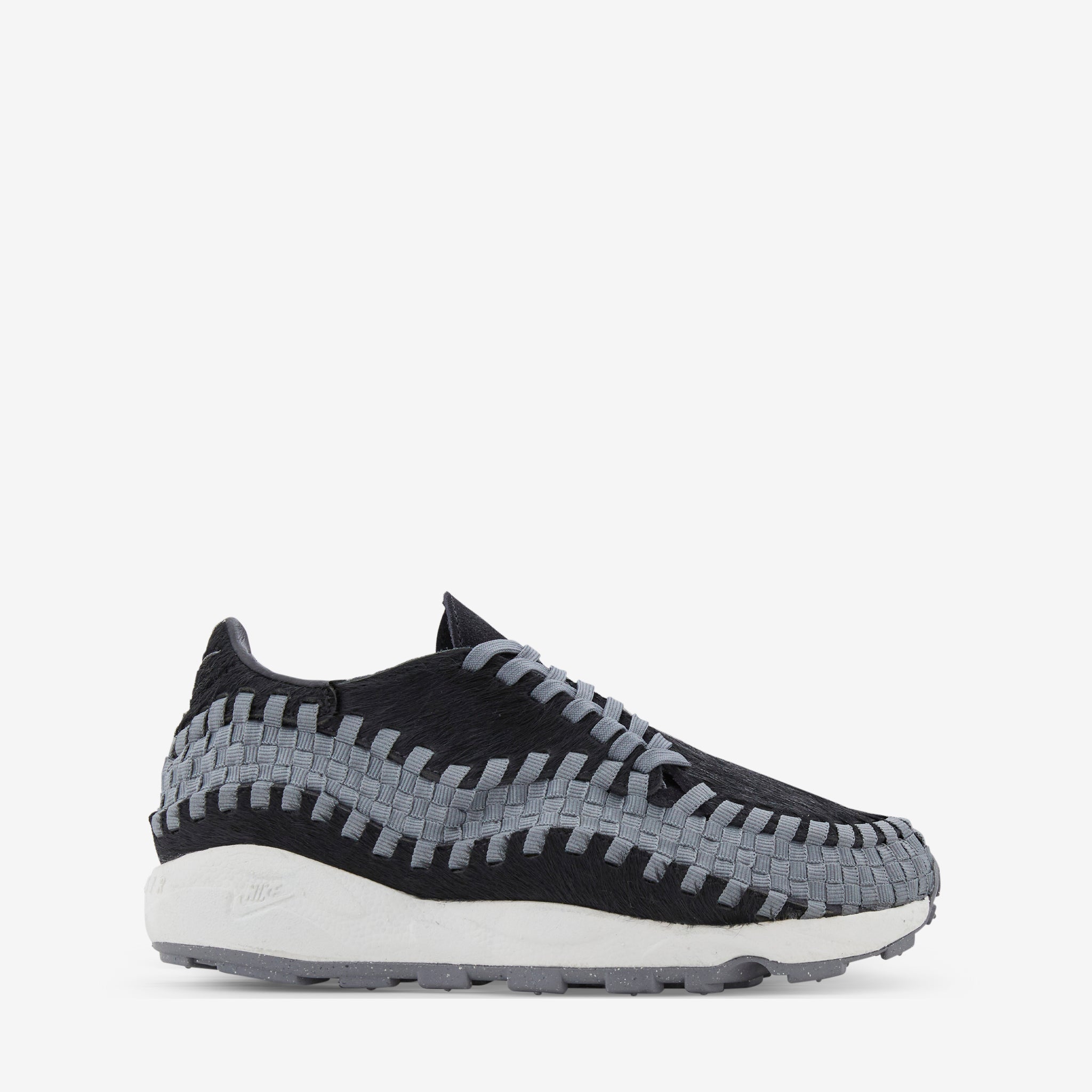 Women's Air Footscape Woven in Black, Smoke Grey and Sail from Nike. Taken from the Nike archives with the original paneled upper with woven lateral and medial sidewalls and asymmetric lacing system. Foam midsole for comfort and a durable Waffle outsole.