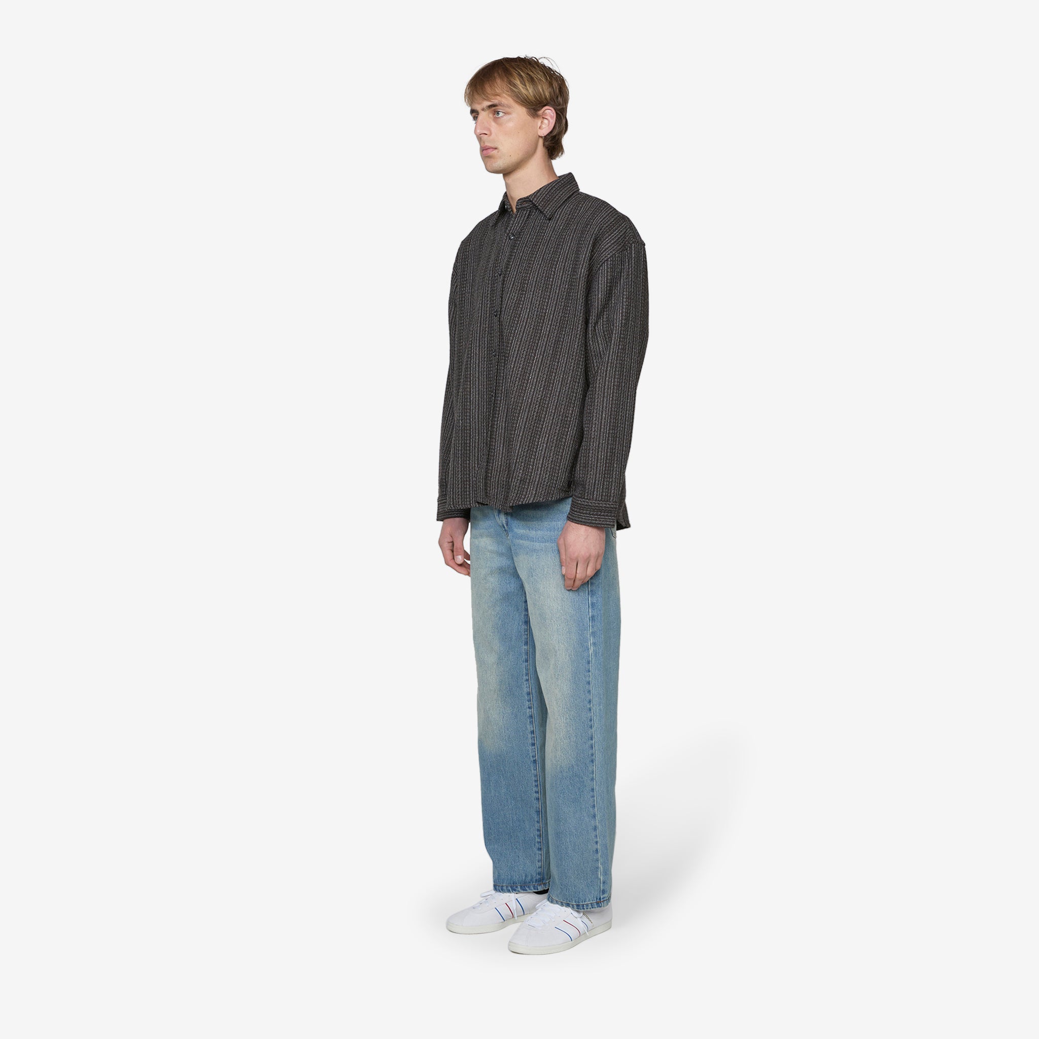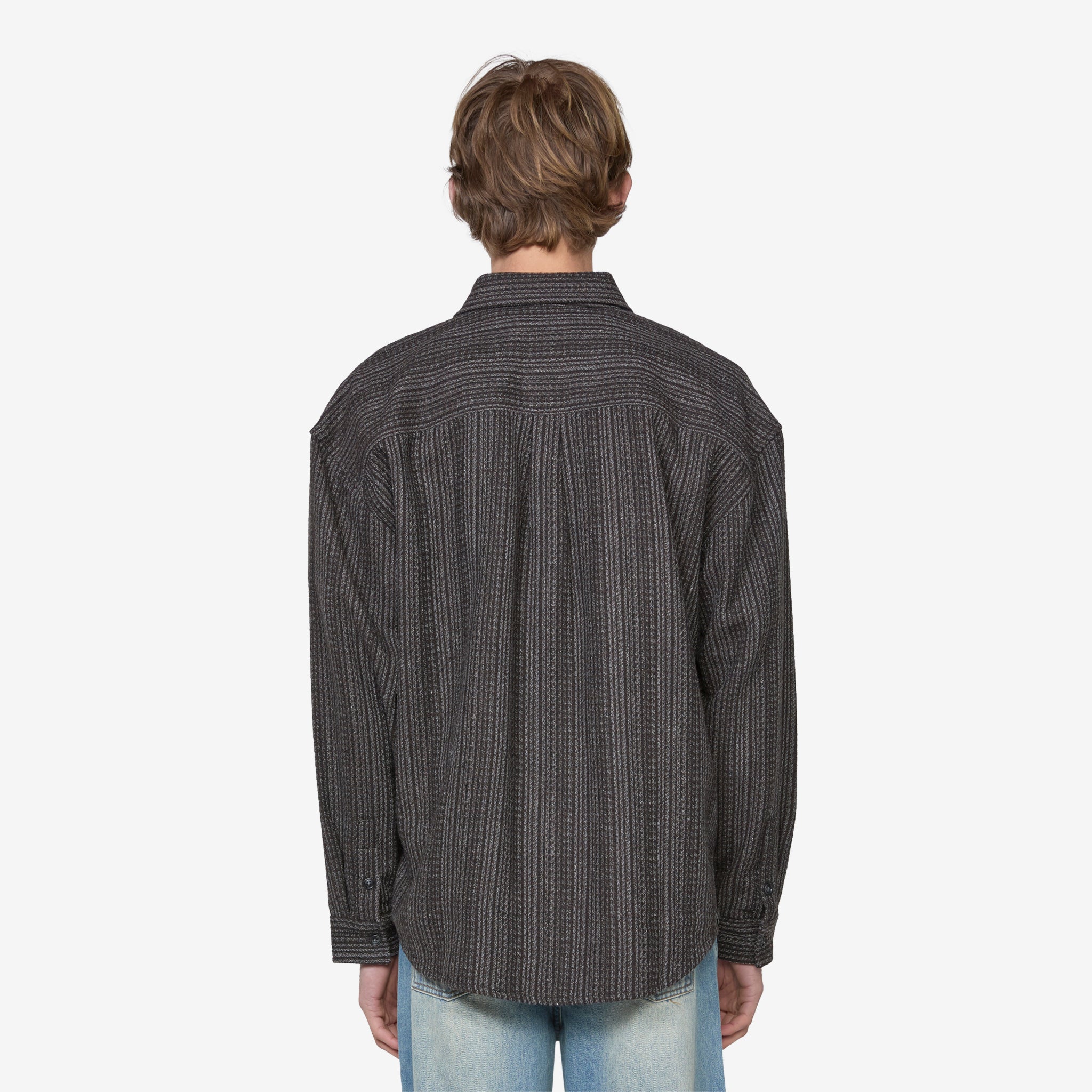 Men's Big Longsleeve Shirt in Dark Brown from Beach Brains. Heavyweight longsleeve shirt with a curved dual hem, large collar, dropped shoulder and boxy fit. Crafted from a wool blend with all-over stripes.