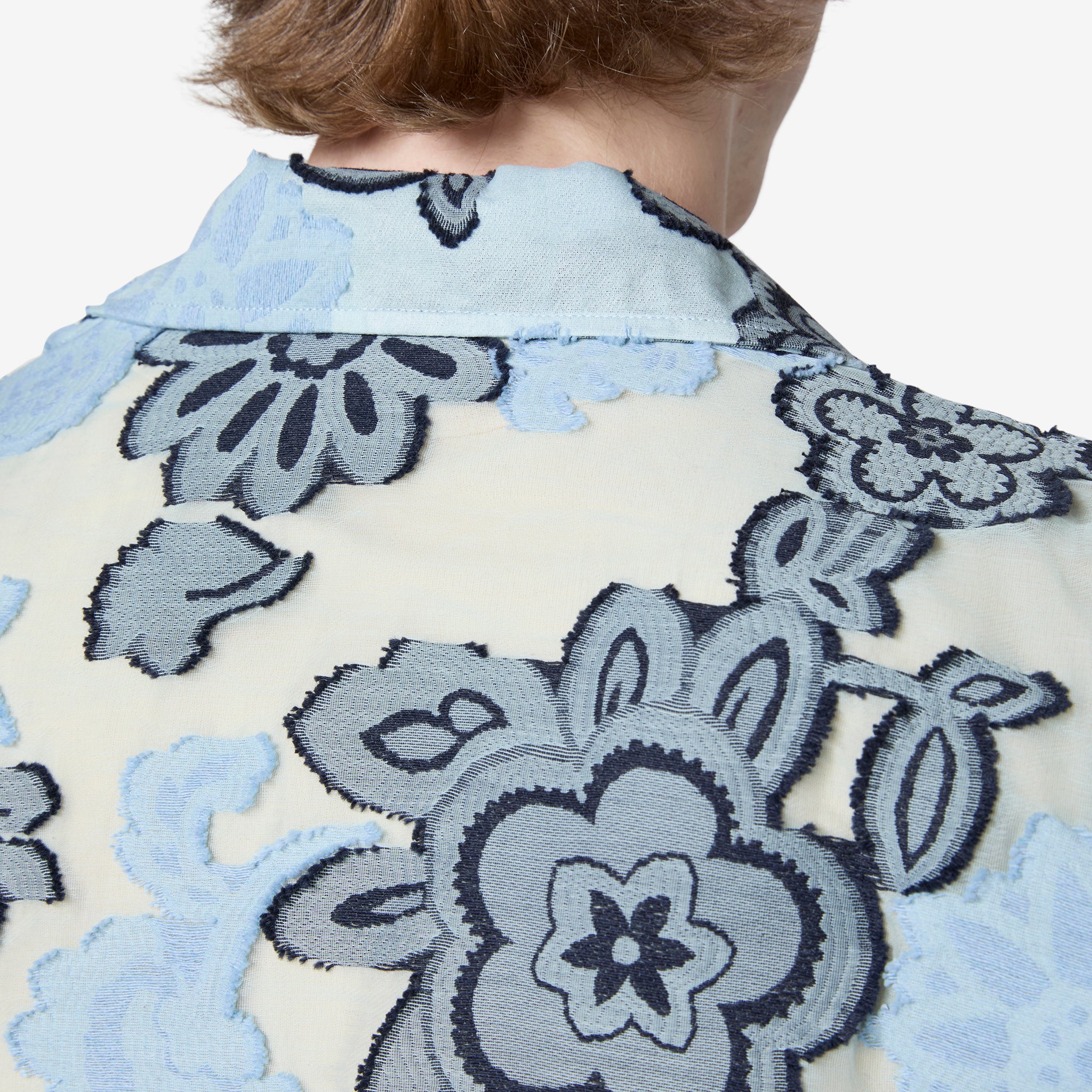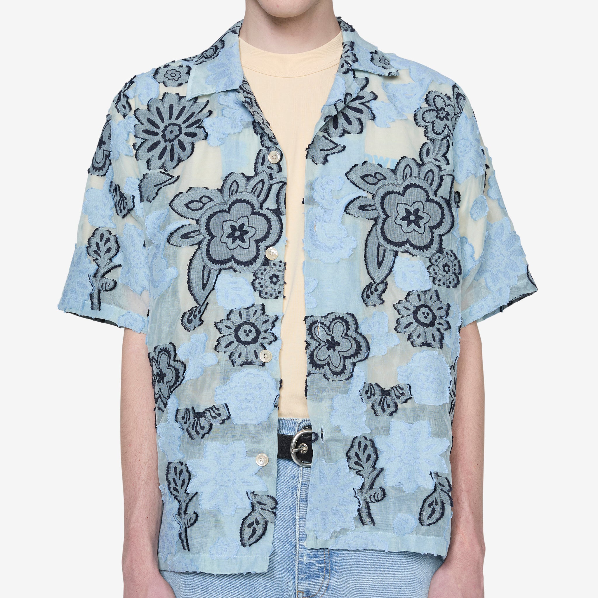 Men's Cayo Short Sleeve Shirt in Light Blue from Sunflower. Regular fit short sleeve shirt with full button closure, a straight hem and camp collar. Crafted from a sheer cotton blend fabric with embroidered detailing all-over.