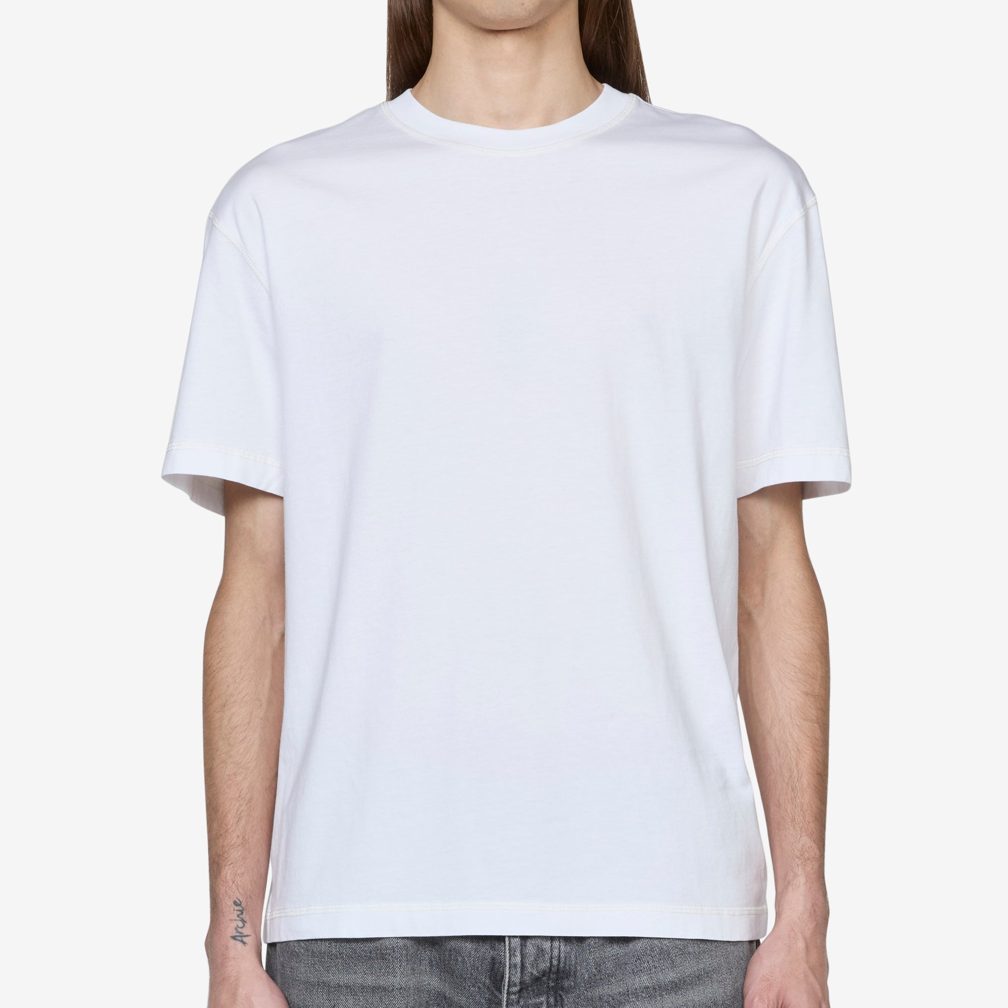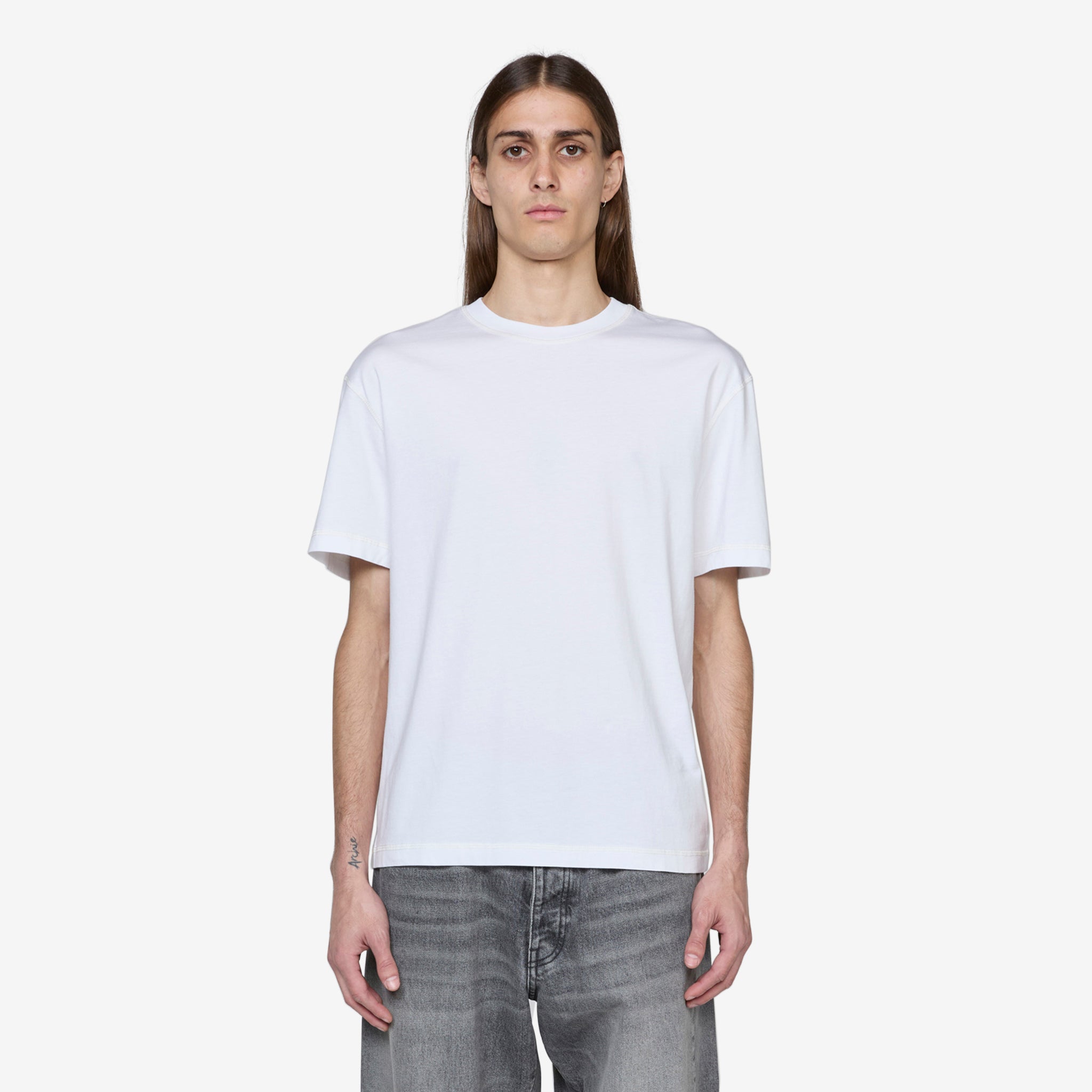 Men's Contrast T-Shirt in White from Sunflower. Regular fit t-shirt with a ribbed crew neckline. Crafted from a washed out mid-weight blend of organic and recycled cotton jersey. Finished with contrast stitch details along the seams.
